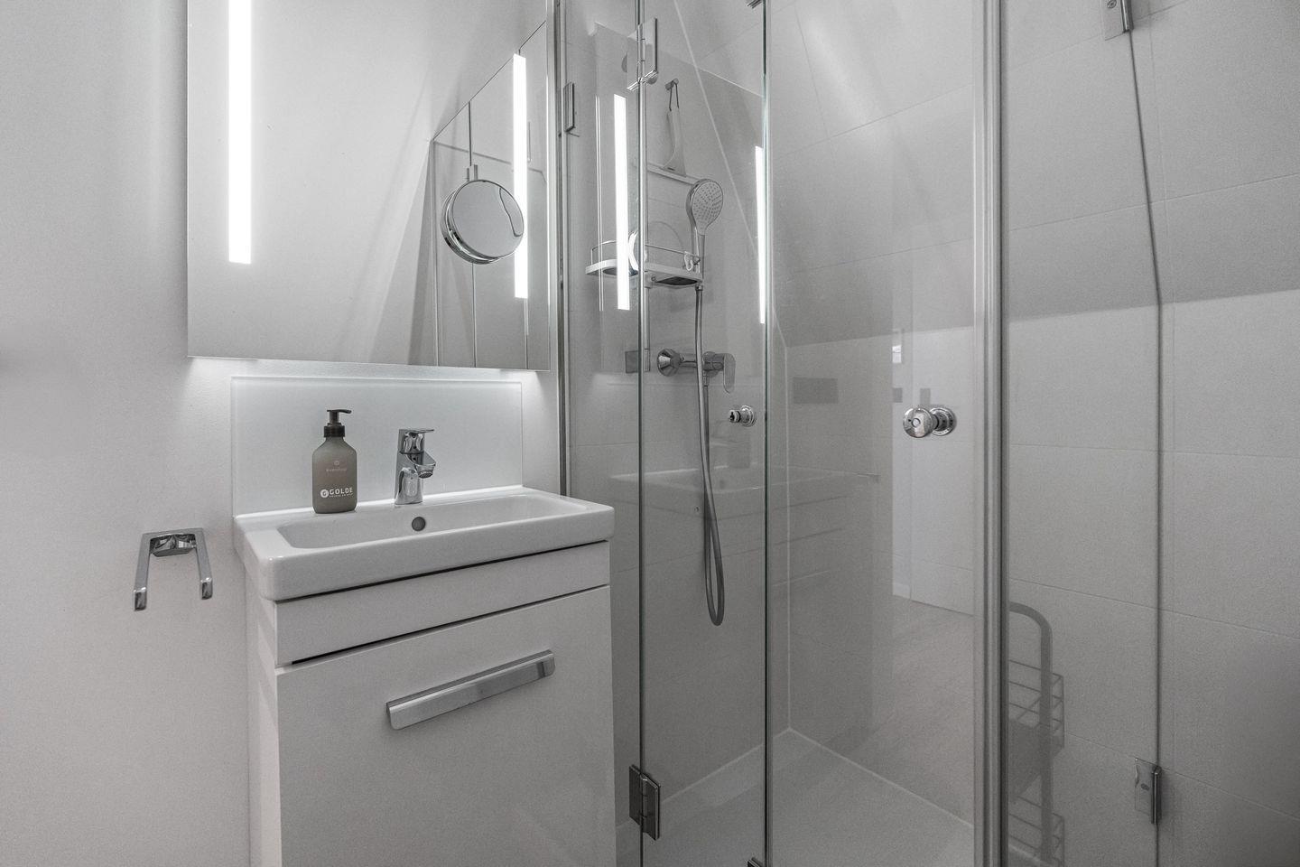 Das moderne Bad mit Fenster verfügt über eine bodentiefe Regendusche, Handtuchheizung, Waschbecken und WC.