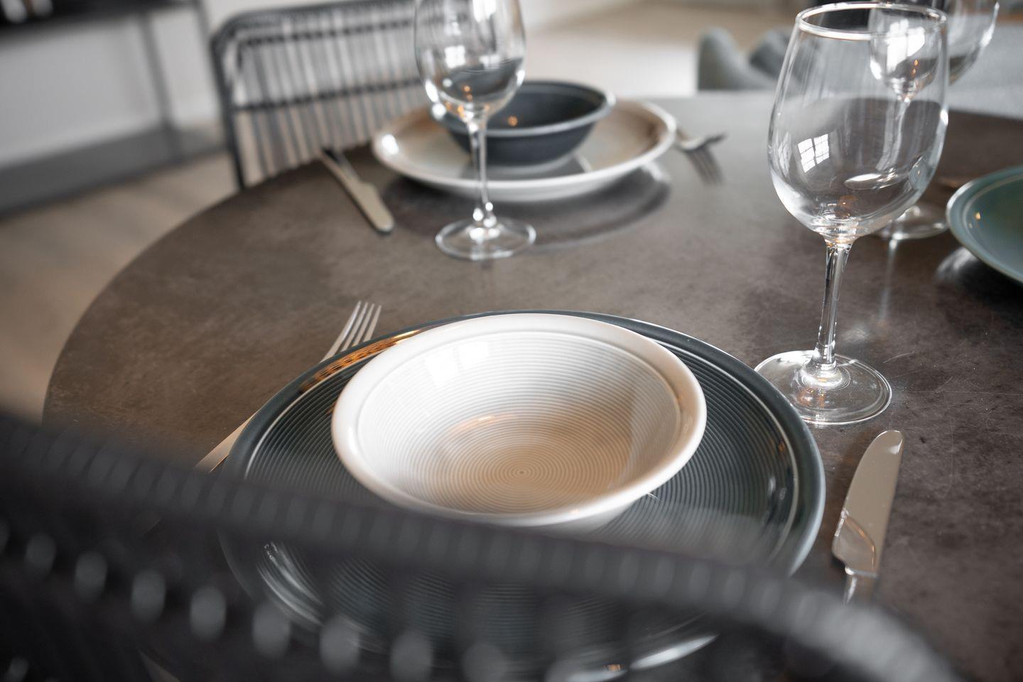 Am Esstisch lässt es sich mit frischen Brötchen vom nahegelegenen Bäcker wunderbar in den Urlaubstag starten. Der Blick durch die Fenster in die gepflegte Grünanlage ist einfach herrlich und lockt nach draußen.