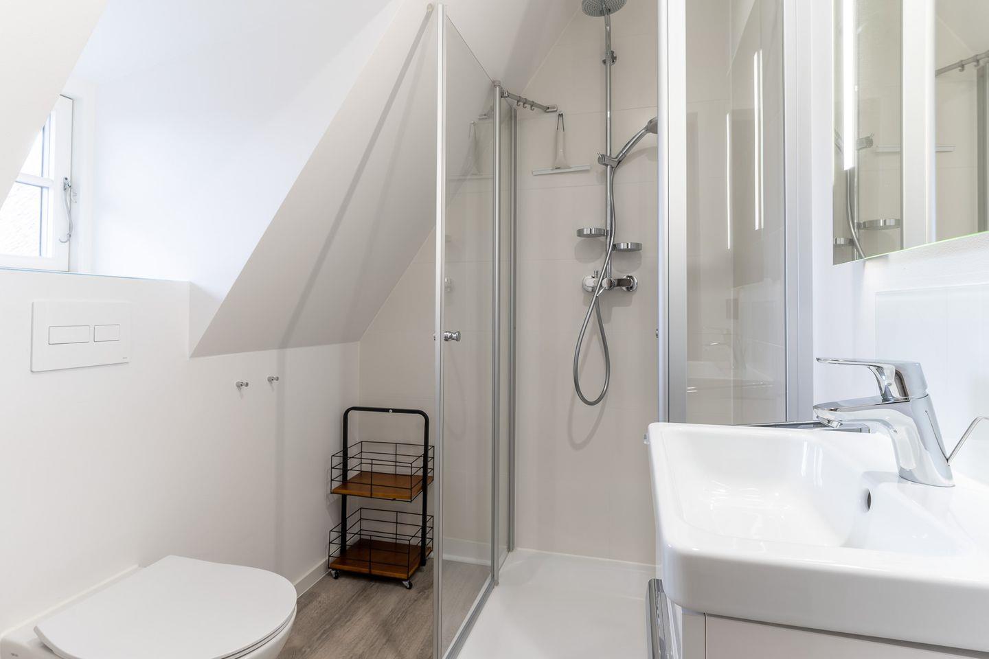 Das moderne Bad mit Fenster verfügt über eine bodentiefe Regendusche, Handtuchheizung, Waschbecken und WC.