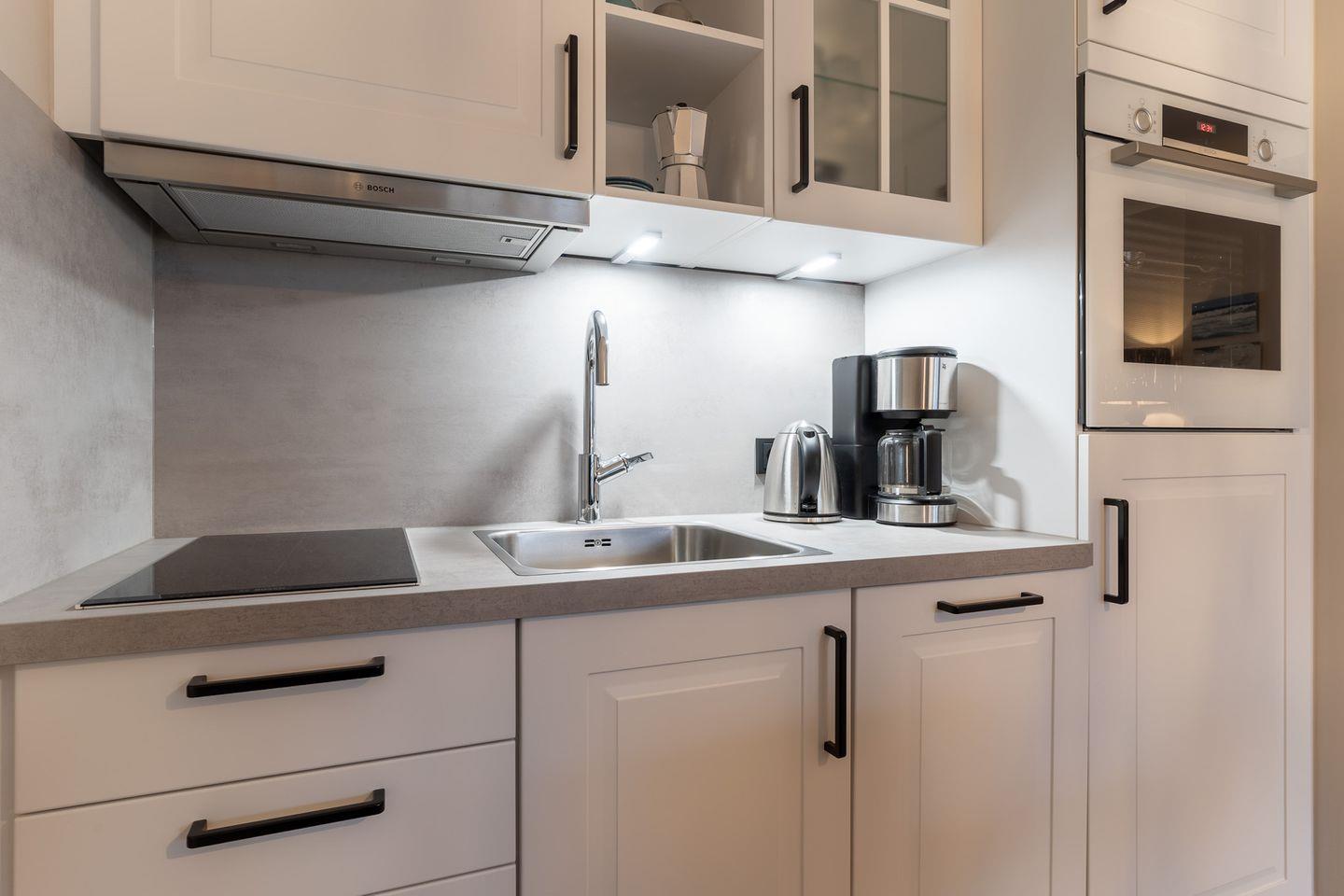 Eine Kochnische mit einer umfangreich ausgestatteten Pantryküche fügt sich passend ein und hat mit einem 2-Felder-Ceranfeld, Spülmaschine, Espressokocher, Kühlschrank samt Gefriermöglichkeit usw. so einiges zu bieten.