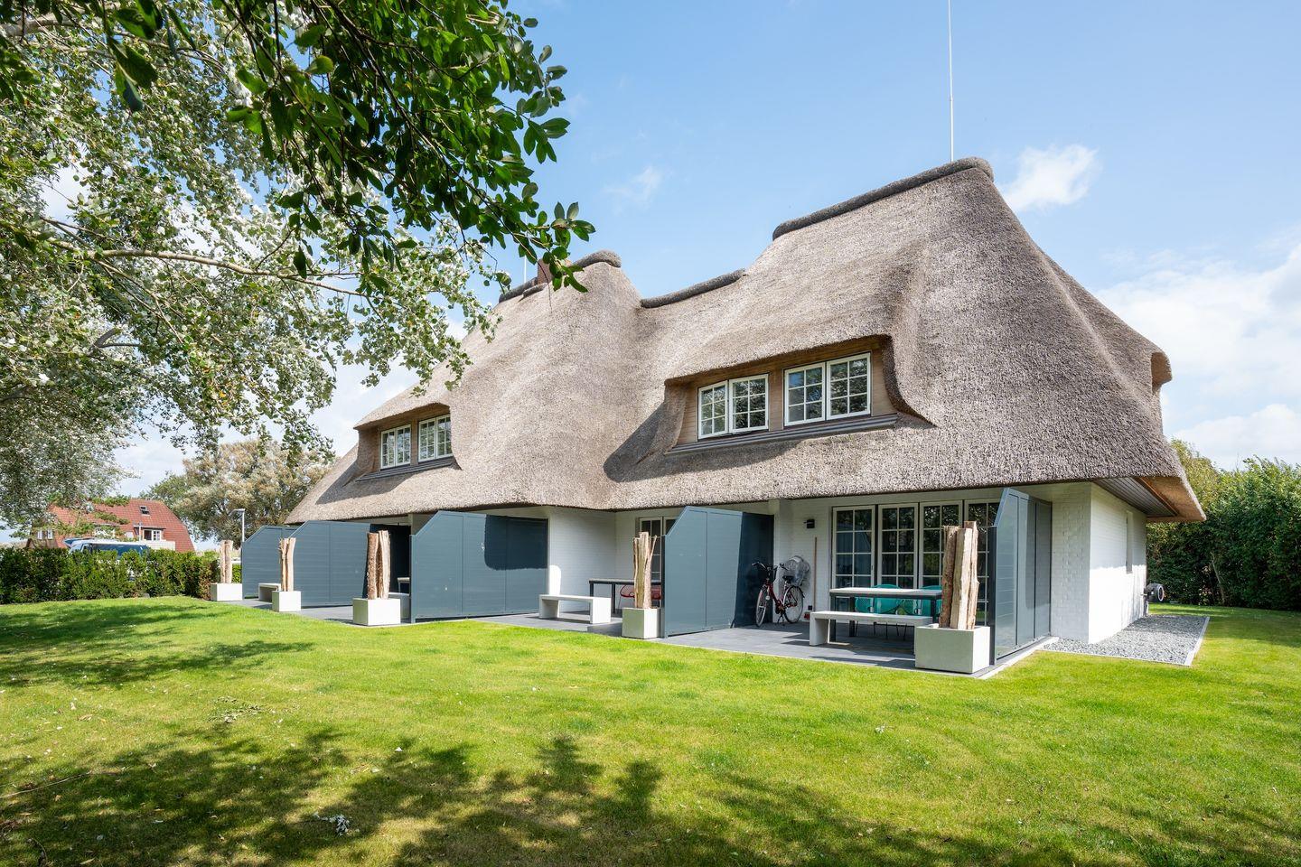 Der Blick in die gepflegte Grünanlage und auf das reetgedeckte Haus sind einfach herrlich und locken nach draußen.