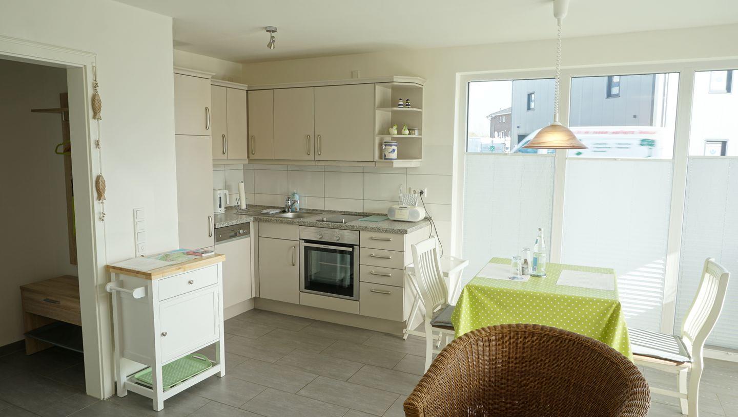 und vollausgestattete offene Küche mit Geschirrspülmaschine, Ceranfeld mit 2 Kochfeldern, Backofen