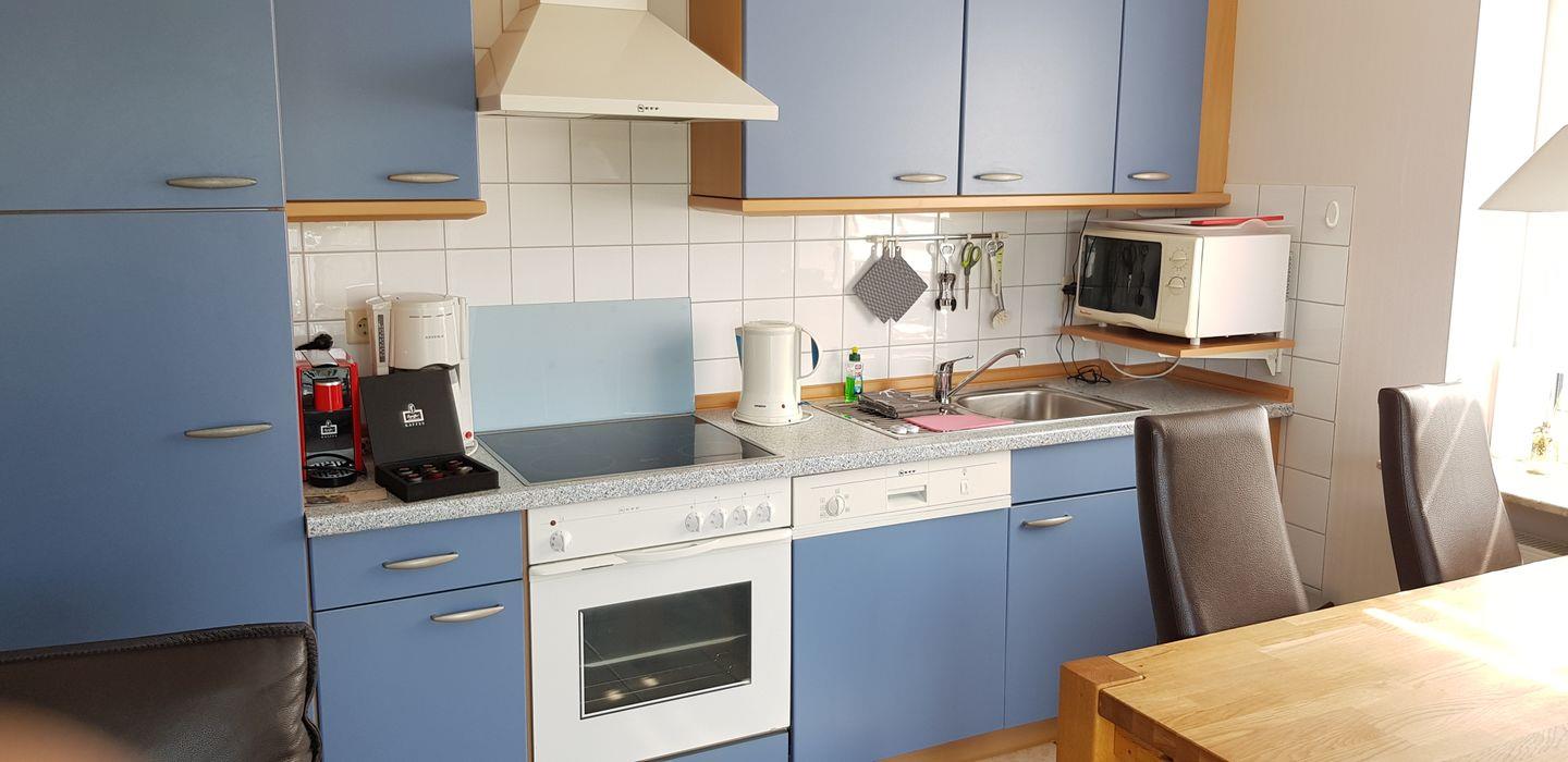 Wohn-Essraum mit zwei Sofas, SAT-TV, offene Küche mit Ceranfeld, Backofen, Mikrowelle, Kaffeefiltermaschine (Kapselmaschine gehört nicht zur Ausstattung), Kühlschrank mit Gefrierfach, Geschirrspülmaschine, Essbereich.