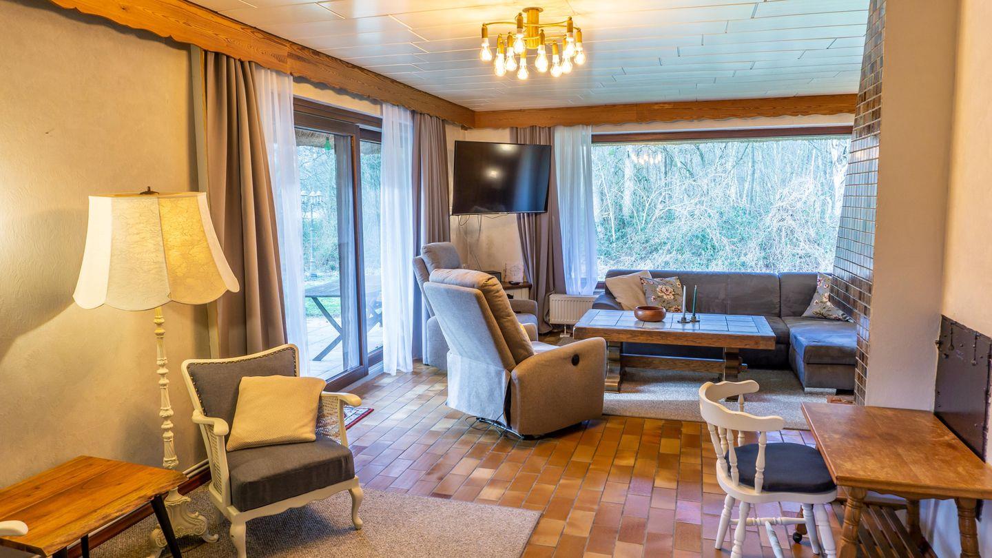 Wohnzimmer mit Schlafsofa für 2 Personen, Kamin, 50 Zoll SAT-TV, Leseecke mit 2 Sesseln. Elektr. Relax-Liegesessel mit Blick in den Garten zum Waldbaden und abschalten. Tresor.