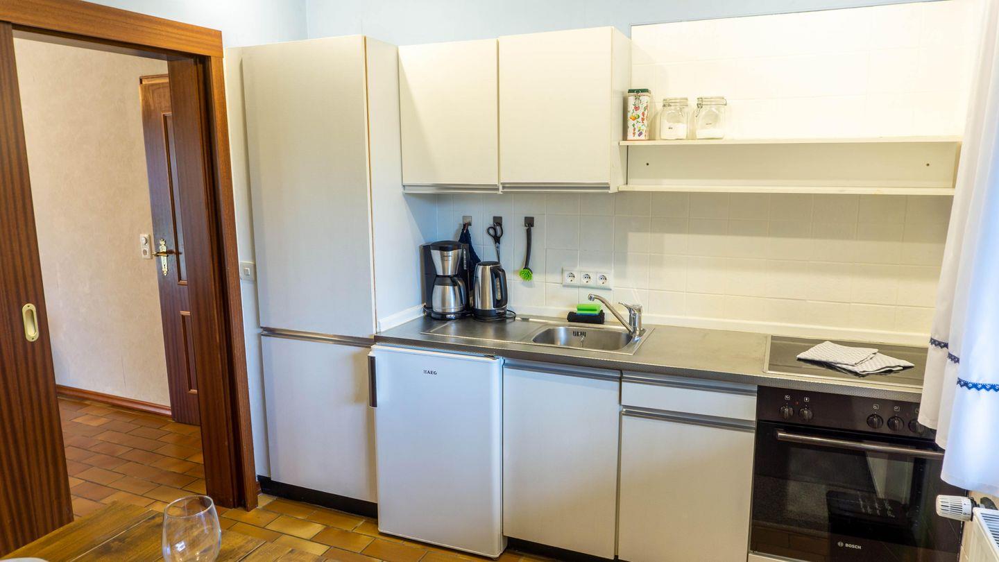 Friesische Wohnküche mit einer Geschirrspülmaschine, 4-Plattenherd mit Backofen, Kaffeemaschine und Mikrowelle.