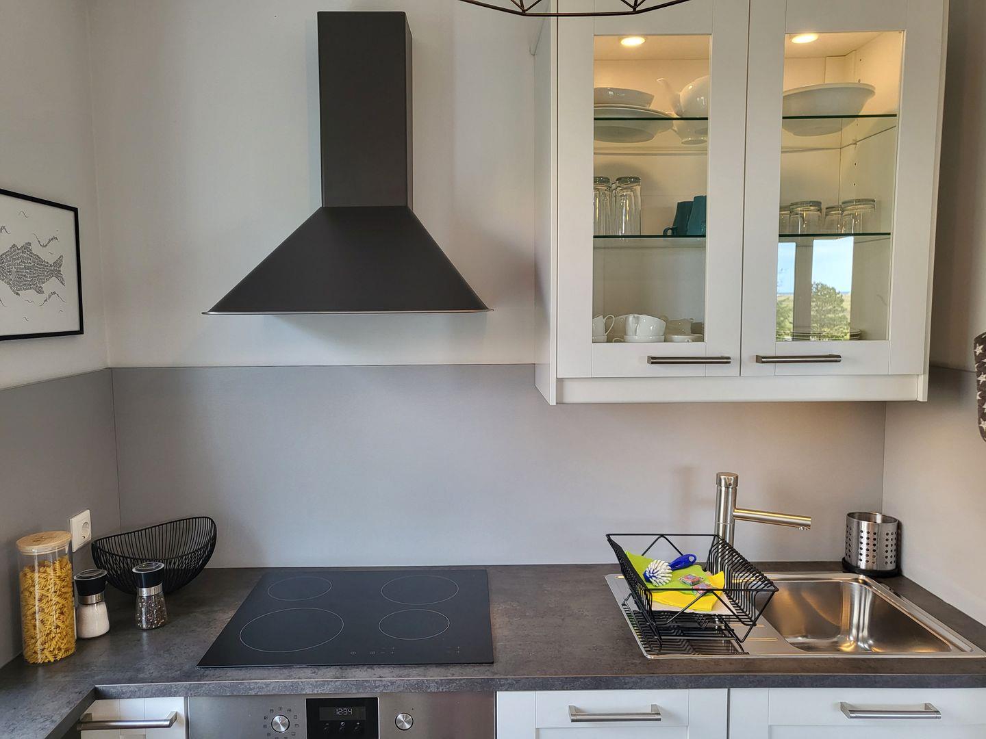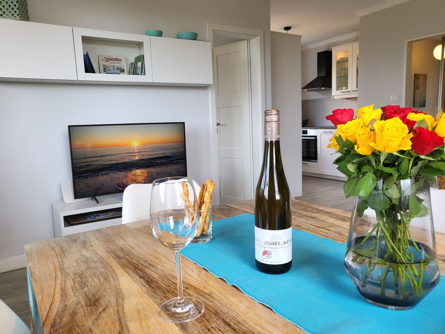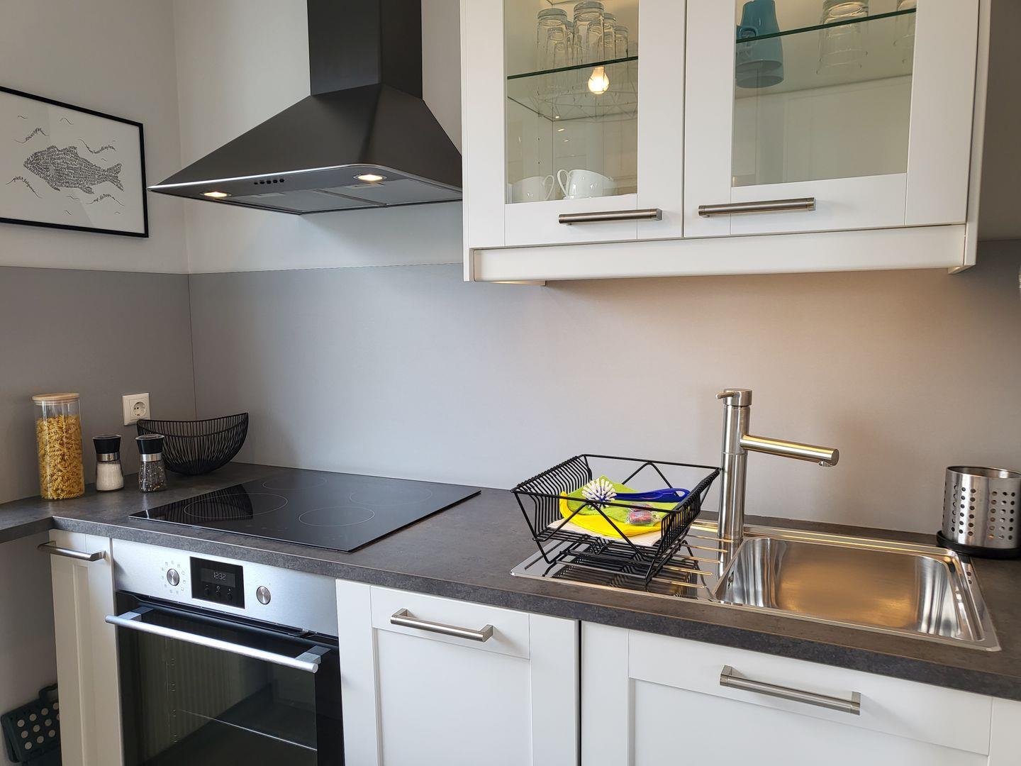 Moderne 3 Zimmerwohnung mit Balkon und seitlichem Seeblick. Vom kleinen Flur kommen Sie in das gemütliche Wohnzimmer mit gemütlicher Couch und Esstisch. Die offene Küche ist gut ausgestattet mit Ceranfeld, Backofen und Geschirrspüler.