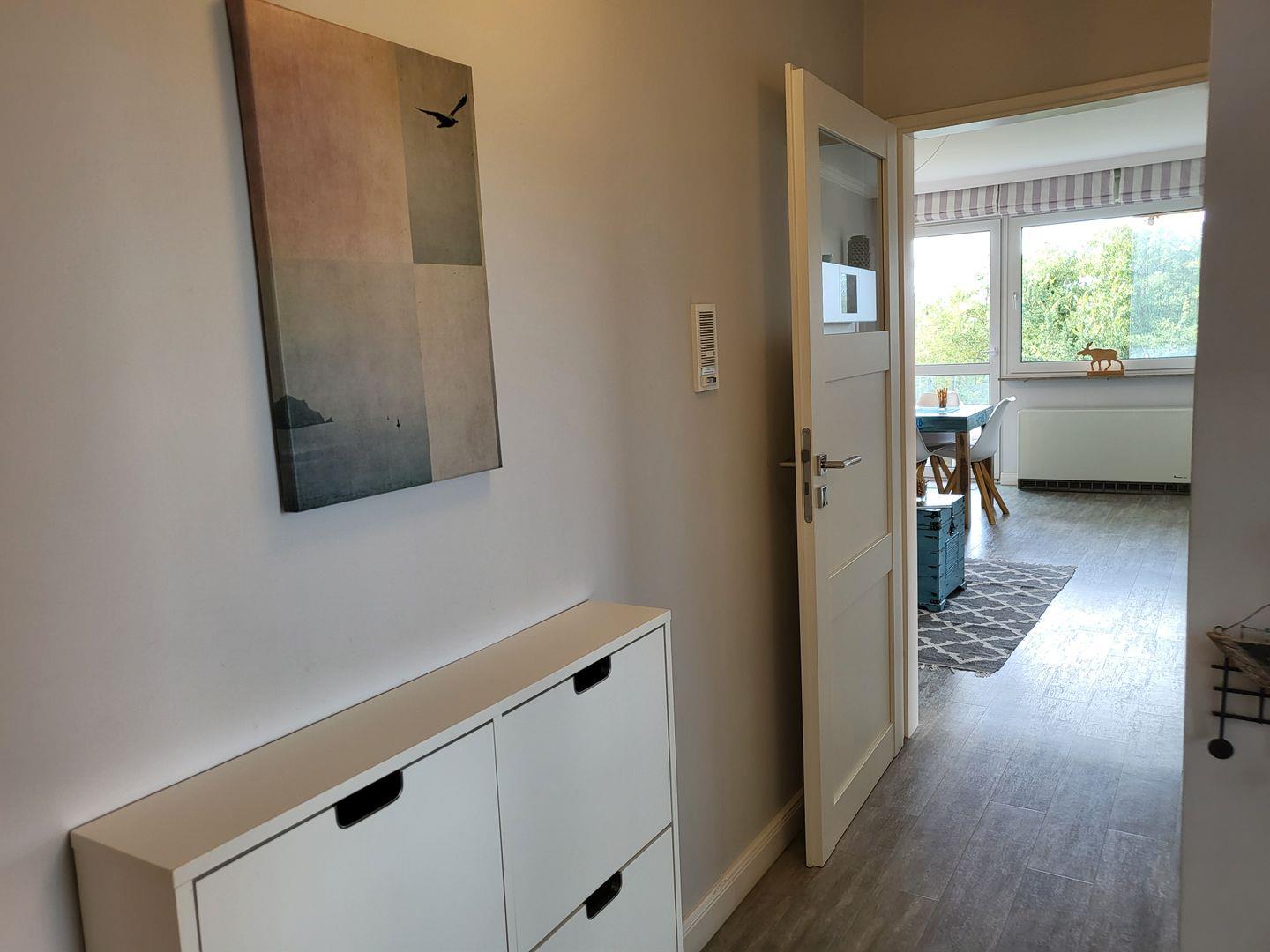 3 Zimmer-Wohnung mit Balkon, Fahrstuhl, seitlicher Seeblick, Wohnraum mit offener Küche, 1 Schlafzimmer mit Doppelbett (180x 200) , ein Schlafzimmer mit Einzelbett und einem Kinderbett (90x 170 cm) mit abnehmbaren Rausfallgitter, Duschbad mit WC, Flur, keine Haustiere erwünscht, Nichtraucher, WLAN, PKW-Stellplatz, Gemeinschaftssauna im Haus