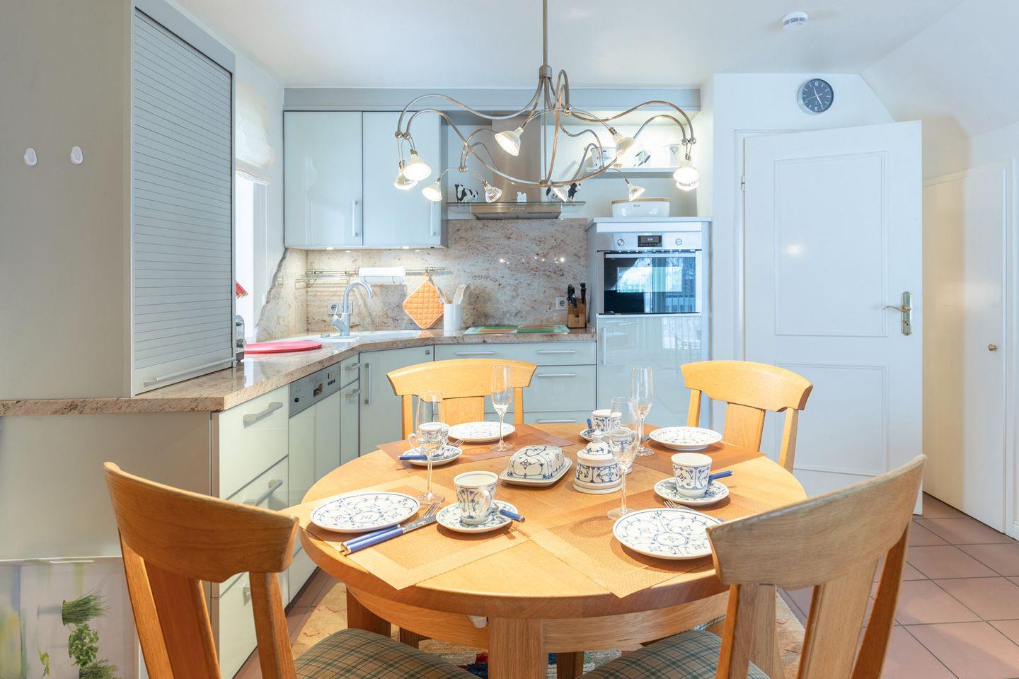 Die offene Küche ist mit modernen Geräten wie Backofen, Mikrowelle, Geschirrspüler, Kühlschrank mit Gefrierfach und einer Philips Senseo Kaffee-Pad-Maschine ausgestattet.