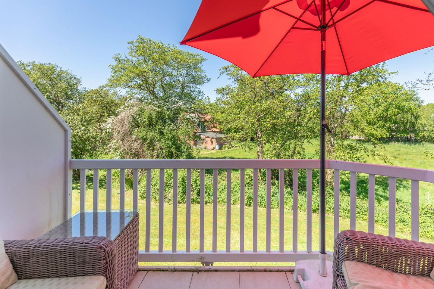 Der gemütlich eingerichtete Wohn-Essbereich ist mit einem Zweisitzer-Sofa, einem Sessel, großem SAT-TV, Stereo-Kompaktanlage und DVD-Player ausgestattet. Der runde Esstisch bietet Platz für ausgiebige Mahlzeiten. Von hier aus haben Sie Zugang zum möblierten Balkon, der nach Westen ausgerichtet ist und einen wunderschönen Blick auf das grüne Gartengrundstück gewährt.