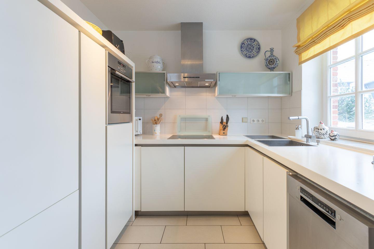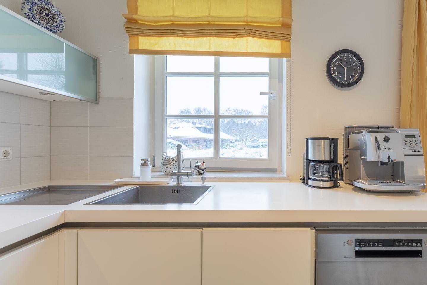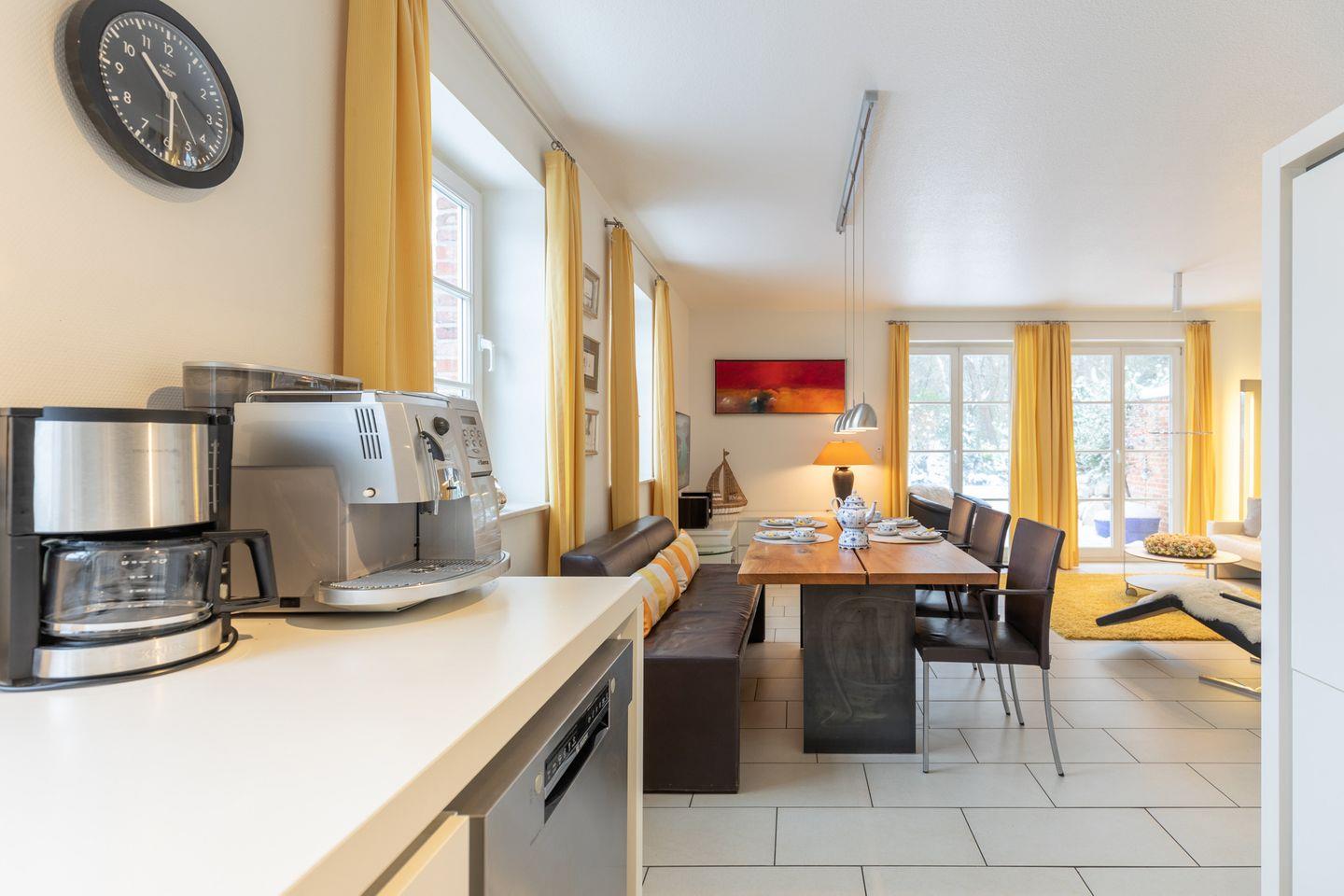 Die offene Küche bietet Ihnen eine komfortable Ausstattung: Geschirrspüler, Kühlschrank, Gefrierfach, Backofen, Ceranfeld mit 4 Kochplatten, Dunstabzugshaube, Filterkaffee-Maschine (Filtergröße 4), Kaffee-Vollautomat, Mikrowelle, Wasserkocher und ein Toaster.