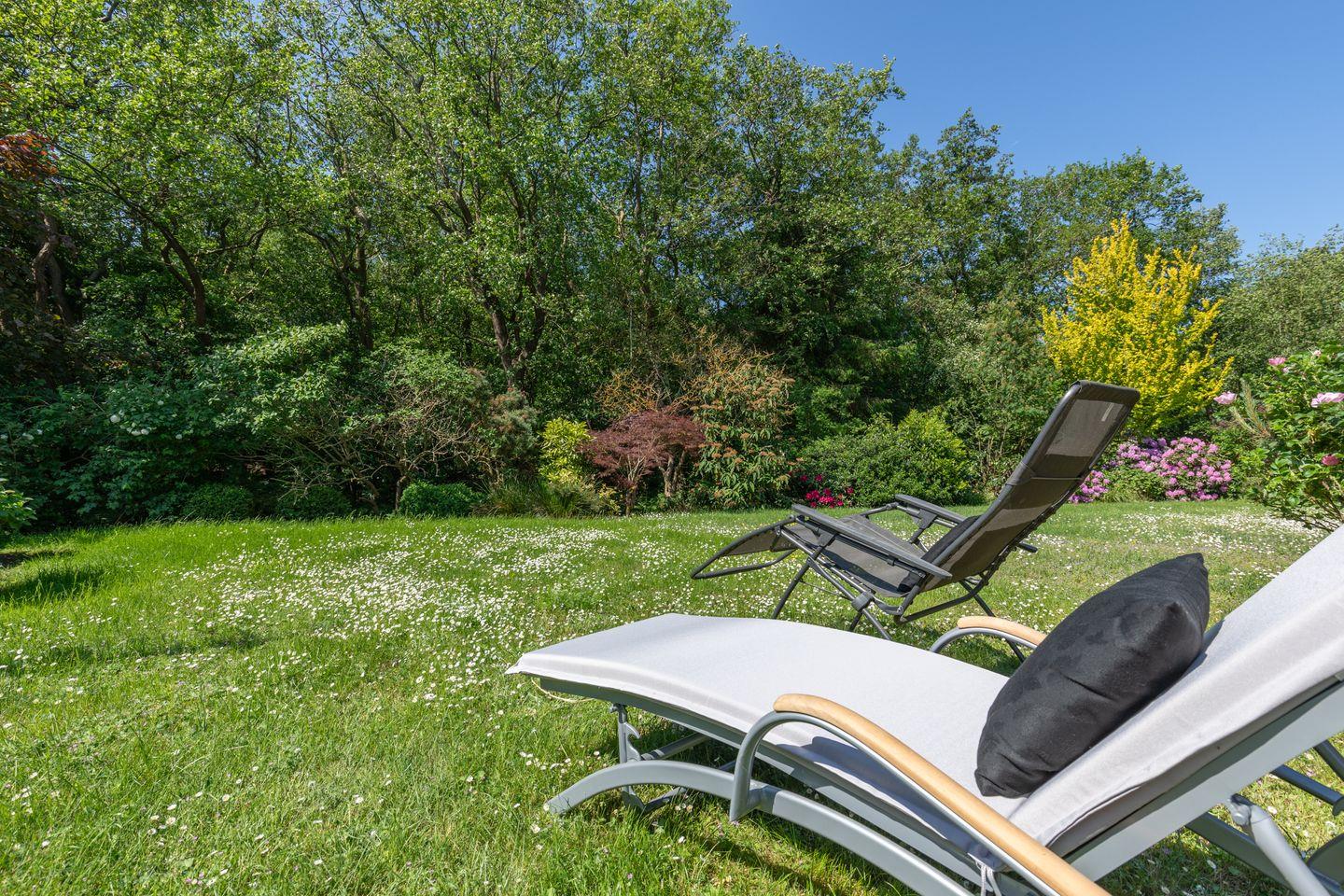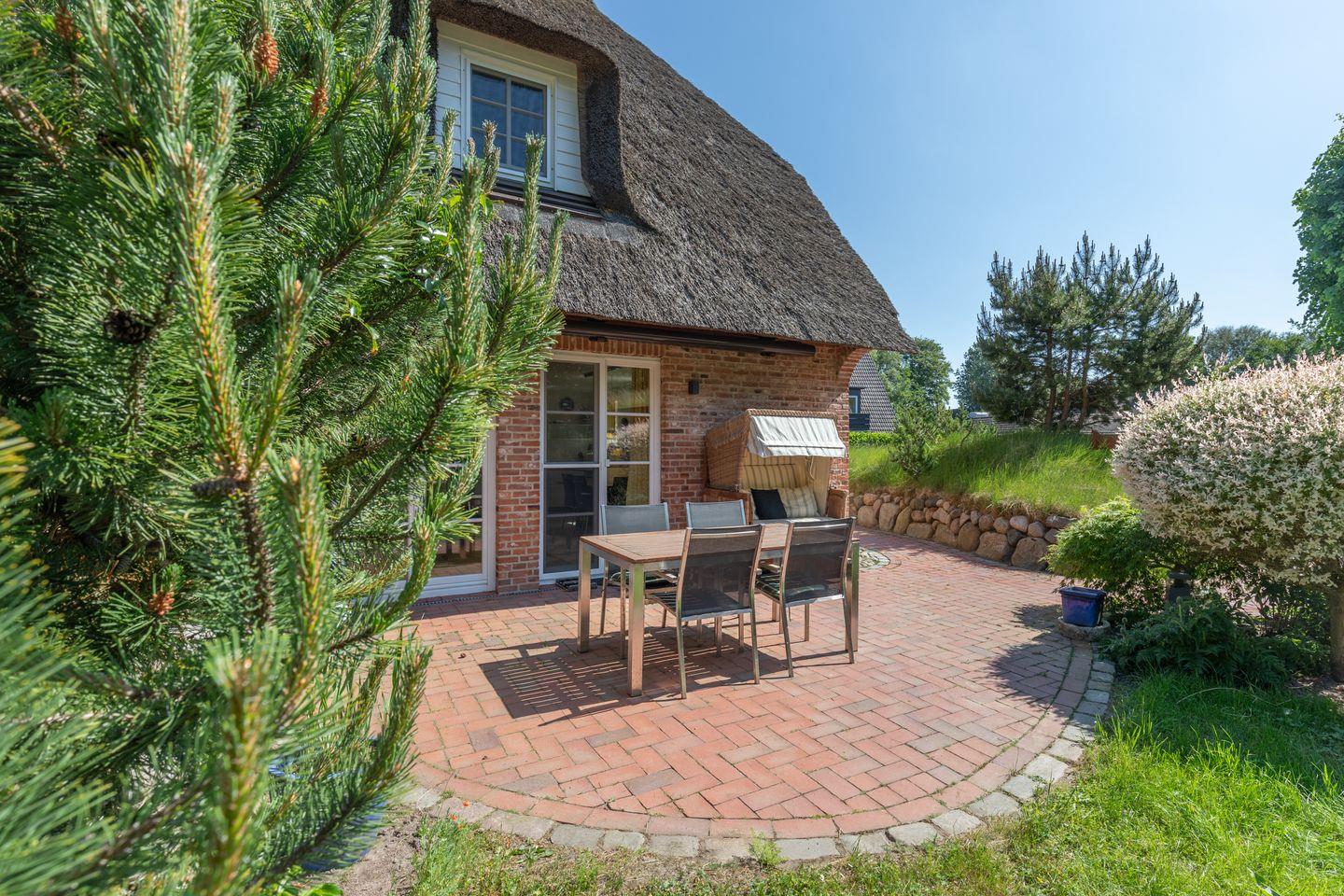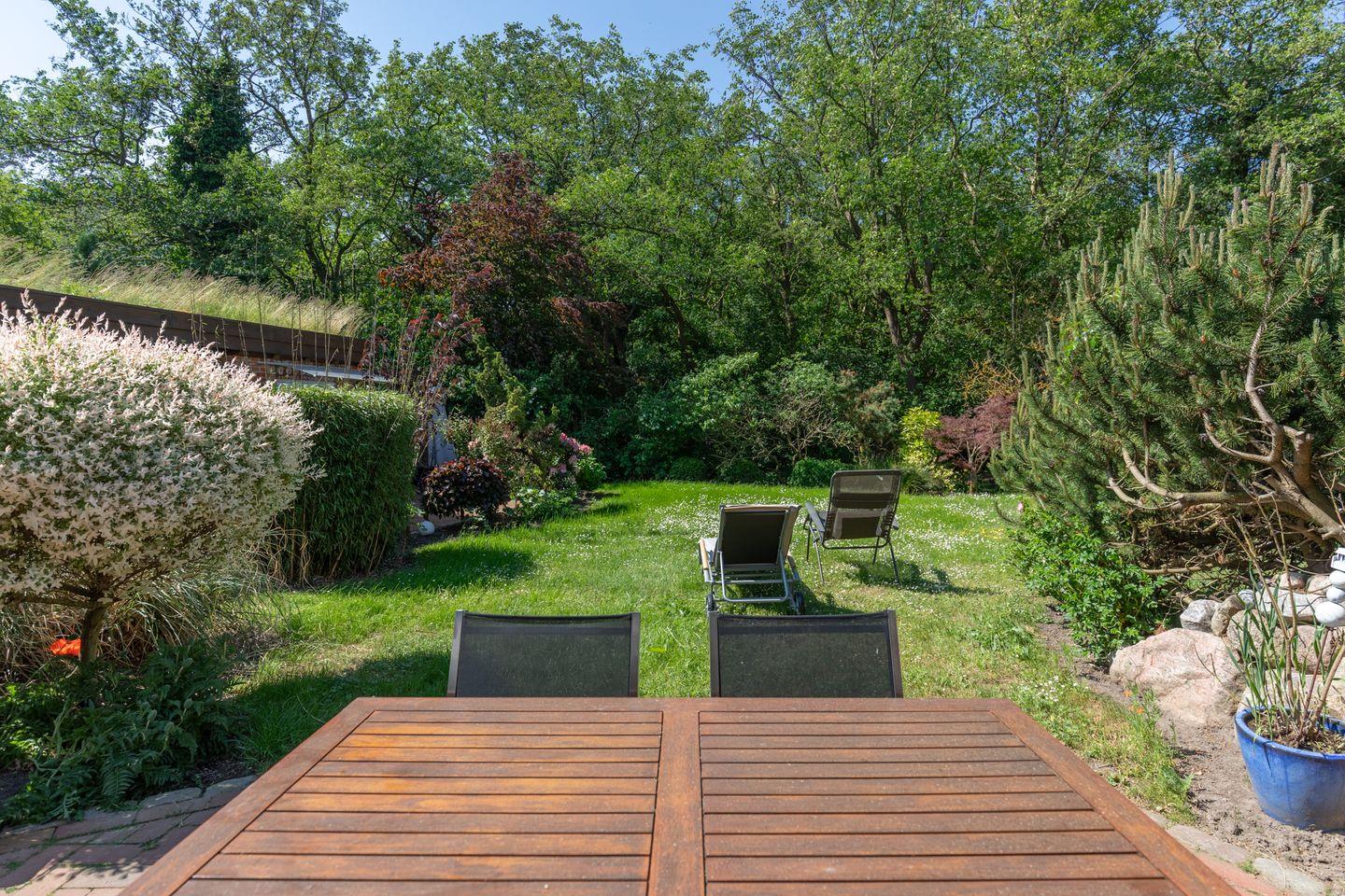 Vom Wohnzimmer aus gelangen Sie direkt zur Terrasse mit Gartenmöbeln und Strandkorb (Südwesten). Im schönen, geschützten Garten können Sie relaxen.
