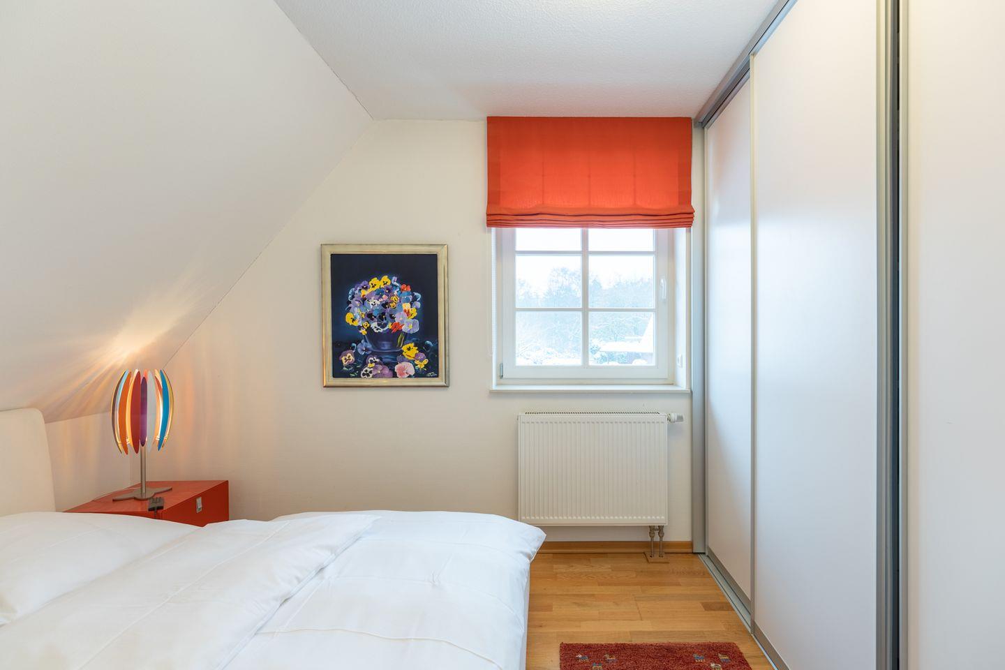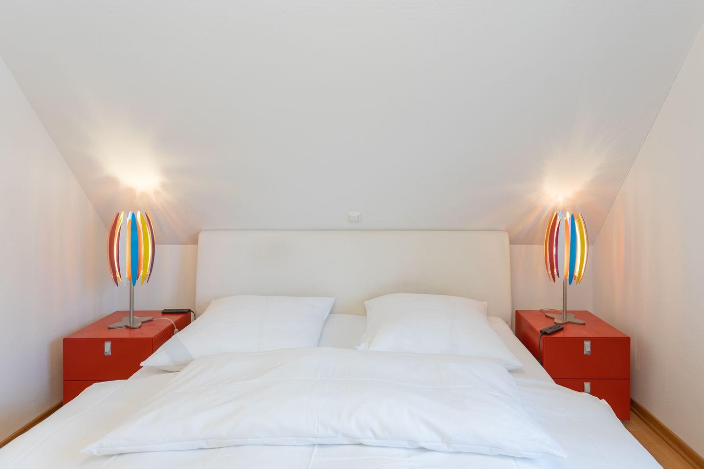 Über eine Treppe erreichen Sie die Ebene mit den beiden Schlafzimmern: Das Elternschlafzimmer ist mit einem Doppelbett (180 x 200) ausgestattet. Ein großer Einbauschrank mit TV wird Sie begeistern.