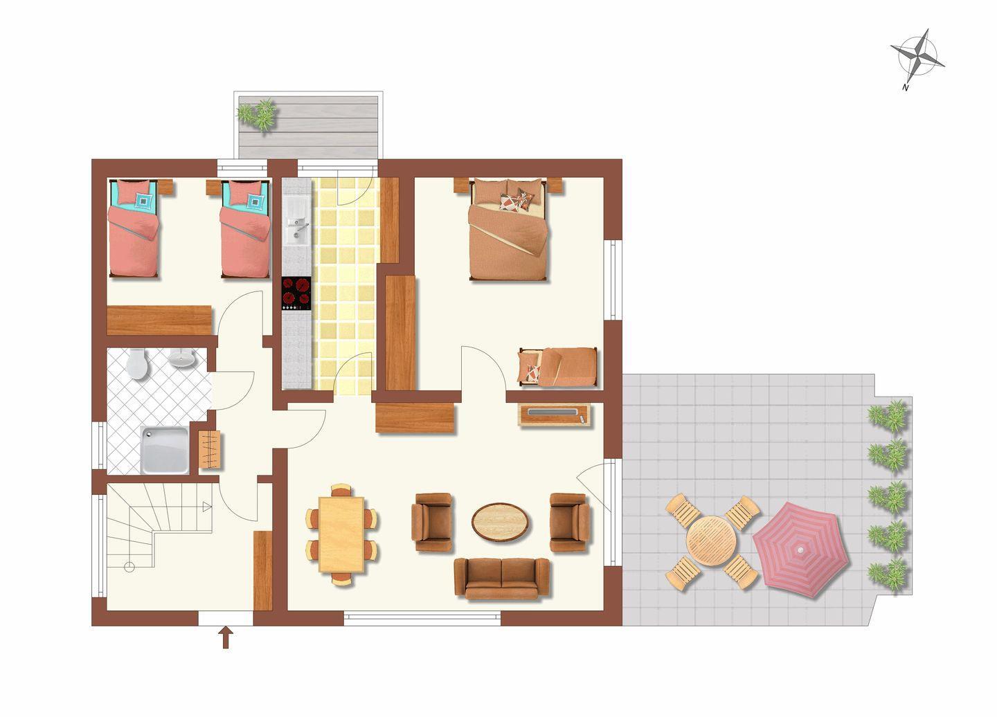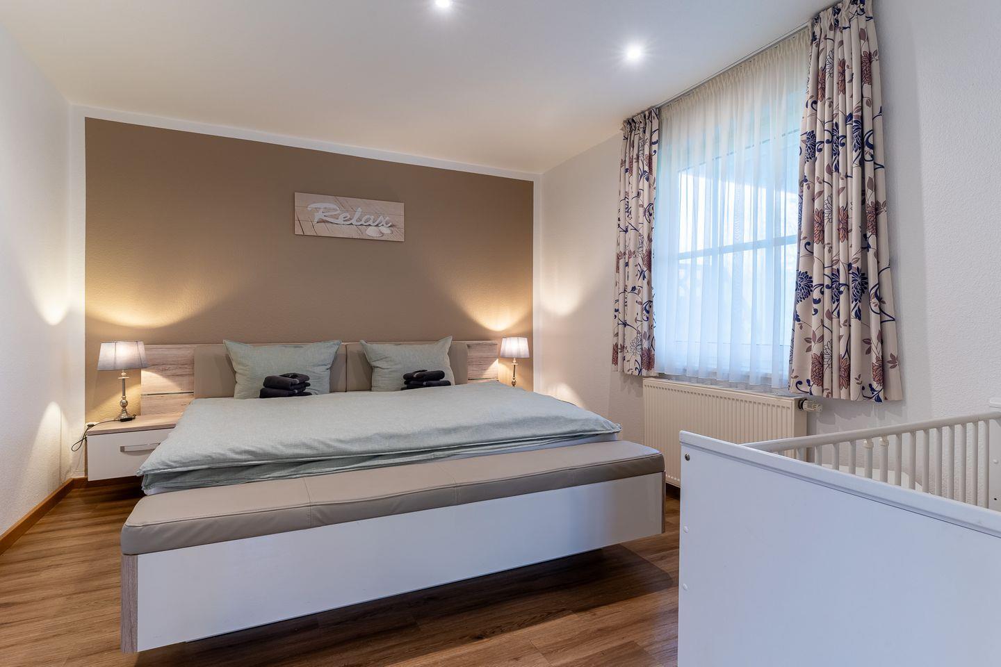Genießen Sie den Komfort eines praktisch neuen Wohnraums in unserer kernsanierten Erdgeschosswohnung. Mit 65 qm bietet sie Platz für bis zu 5 Personen plus Kleinkind. Das Elternschlafzimmer verfügt über ein komfortables Ehebett speziell für über 2m große Gäste und ein zweites Schlafzimmer bietet ein Etagenbett und ein Einzelbett. Der großzügige Wohn- und Essbereich mit direktem Zugang zur möblierten Gartenterrasse lädt zum Verweilen ein. Dank voll ausgestatteter Küche und separater Terrasse können Sie Ihren Aufenthalt in vollen Zügen genießen.