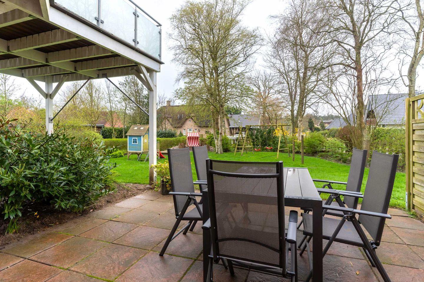 Großer Garten mit Spielgeräten und Strandkorb