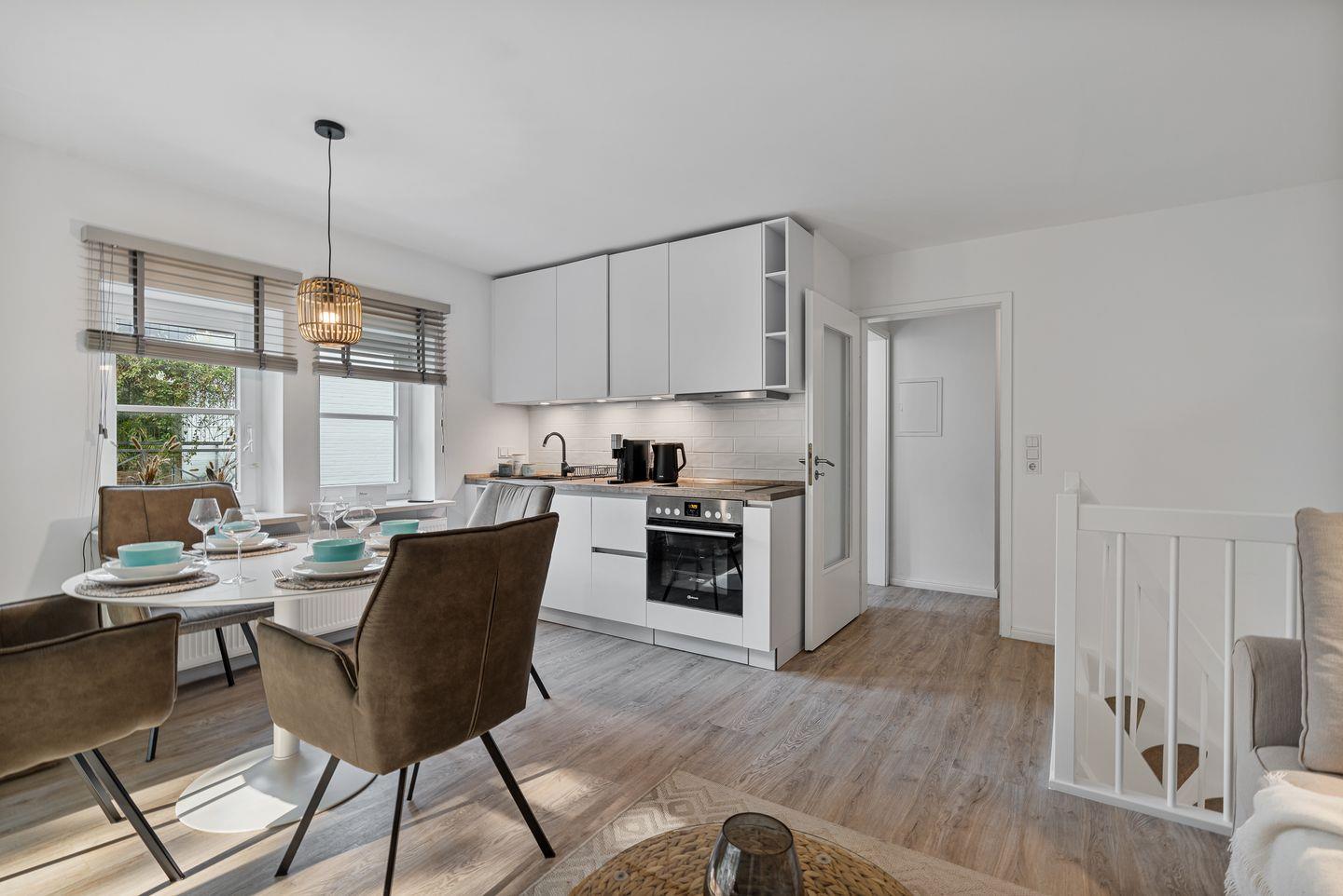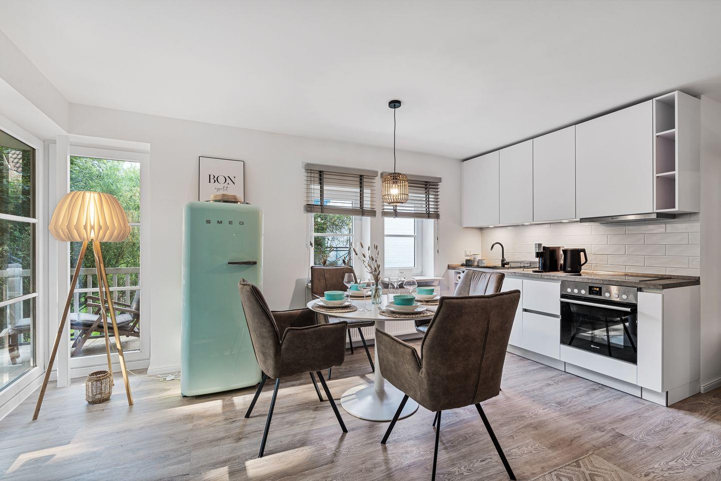 Das Wohnzimmer lädt mit einem stilvollen Sofa, einem großartigen Smart-TV und einem Esstisch mit 4 Stühlen zum Verweilen ein. Es bietet zudem direkten Zugang zum möblierten Balkon in südlicher Ausrichtung. Die offene Küche ist voll ausgestattet mit einem Induktionsfeld, einem Backofen, Mikrowelle, einer Kühl-Gefrier-Kombination und einem Geschirrspüler.