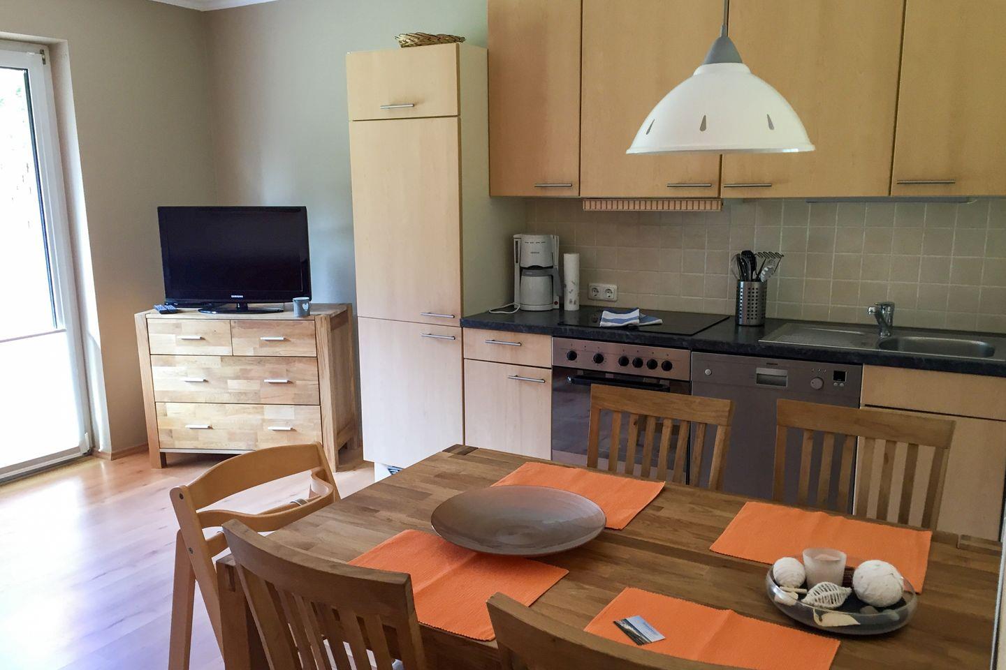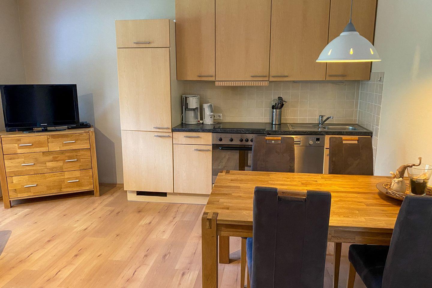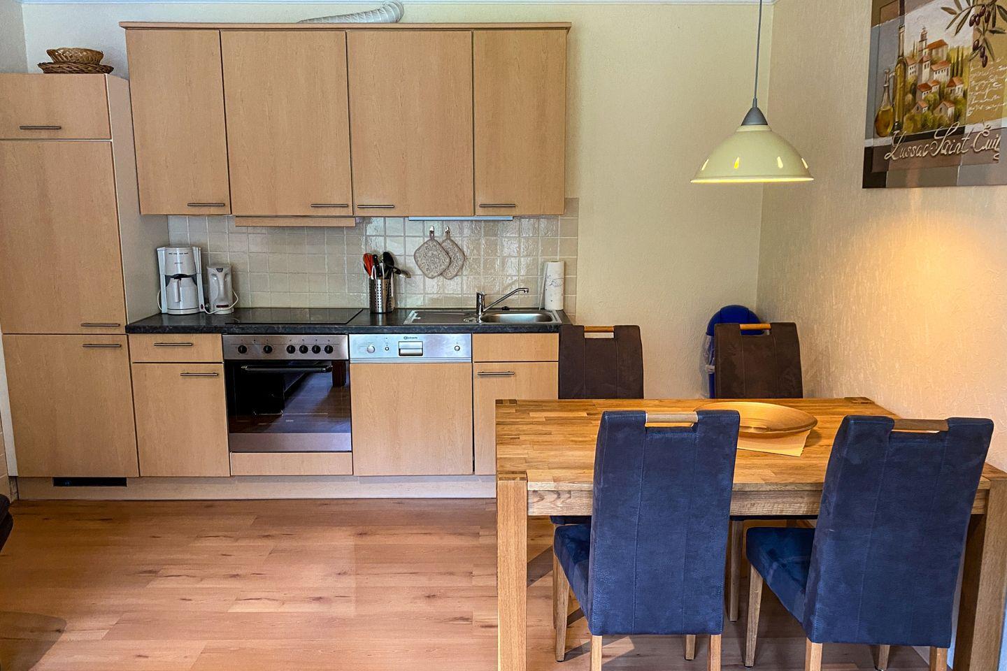 Die offene Küche ist zum Wohnbereich hin gestaltet und überzeugt mit ihrer vollständigen Ausstattung. Sie finden einen Ceranherd, einen Backofen, Toaster, Kaffeemaschine, Wasserkocher, einen Kühlschrank sowie alle wesentlichen Küchenutensilien und Geschirrhandtücher. Der Essbereich ist im Wohnzimmer integriert und bietet einen Esstisch, an dem Sie gemeinsam Ihre Mahlzeiten einnehmen können.