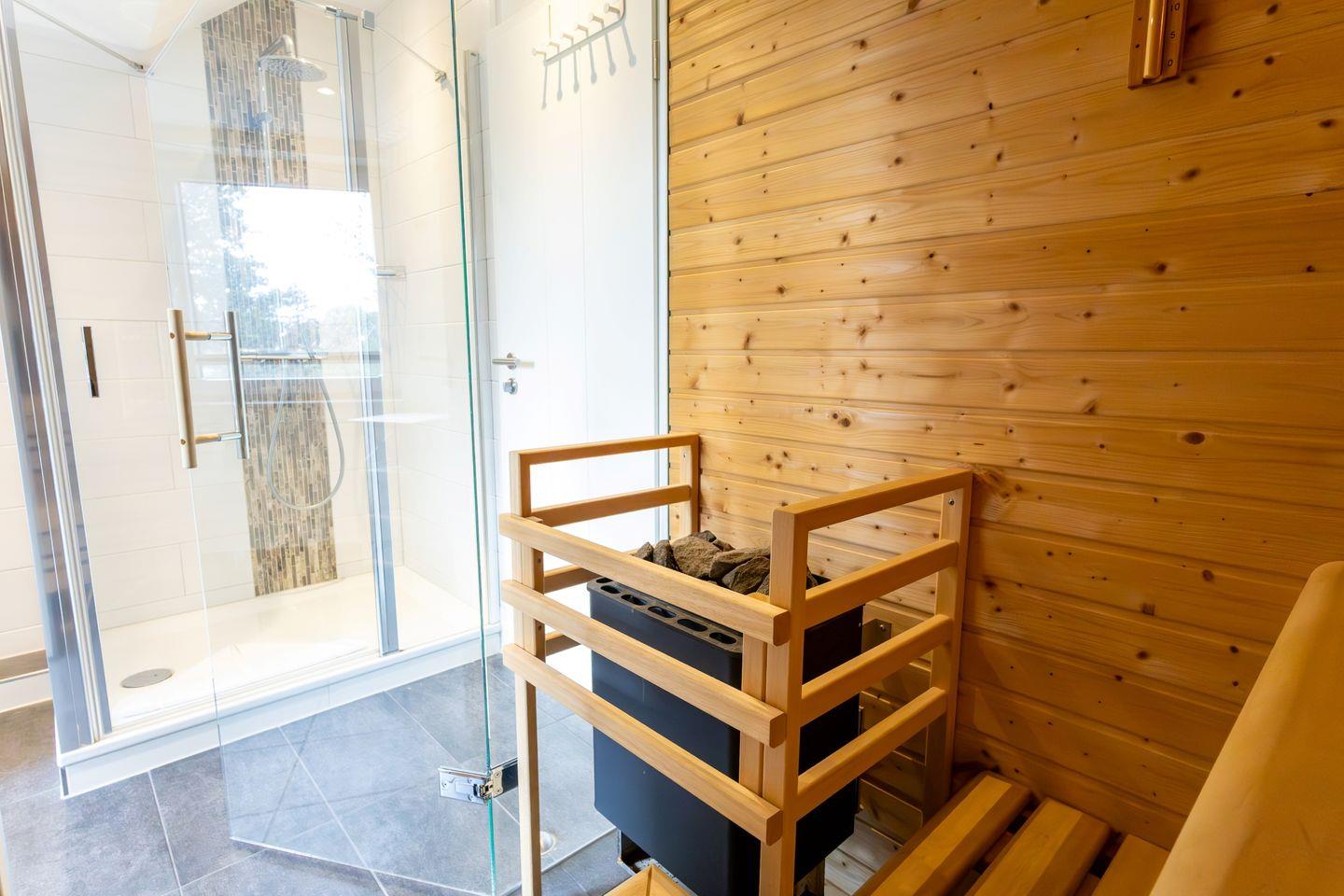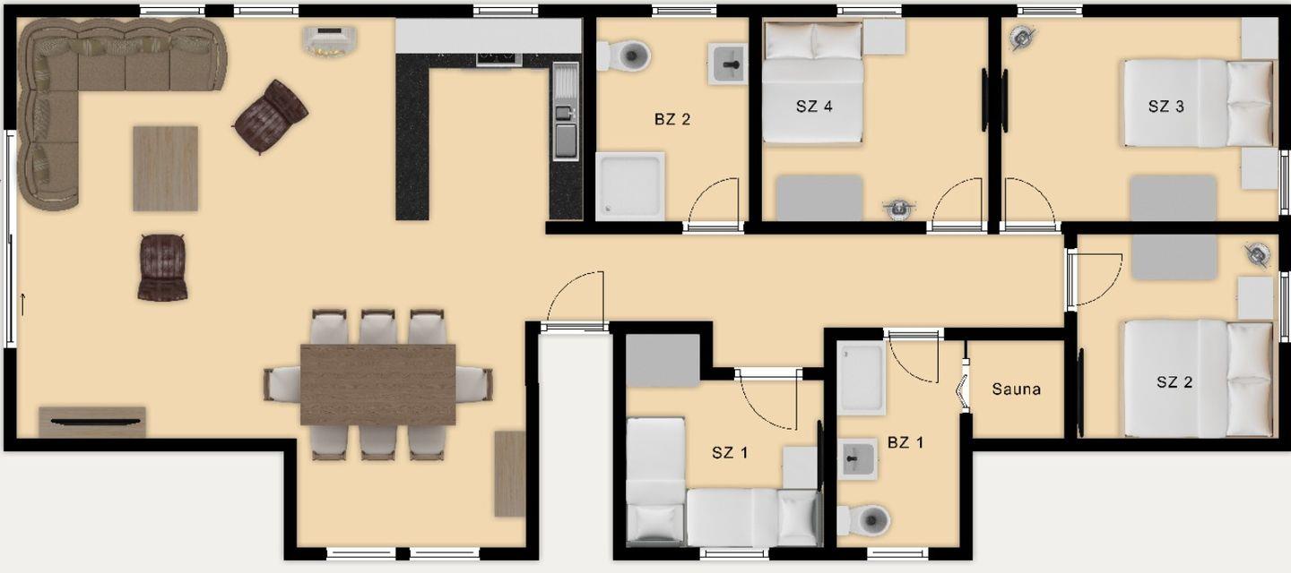 Wohn-Essbereich mit offener Küche und Zugang zum Balkon, Flur, 1 Duschbad/WC mit Tageslicht, 1 Schlafzimmer mit 2 Einzelbetten (je 90x200 cm), 1 Duschbad/WC mit Tageslicht und Sauna, 1 Schlafzimmer mit Doppelbett (140x200 cm), 1 Schlafzimmer mit Doppelbett, (160x200 cm), 1 Schlafzimmer mit Doppelbett (180x200 cm). Alle Schlafzimmer sind mit einem Fernseher ausgestattet.