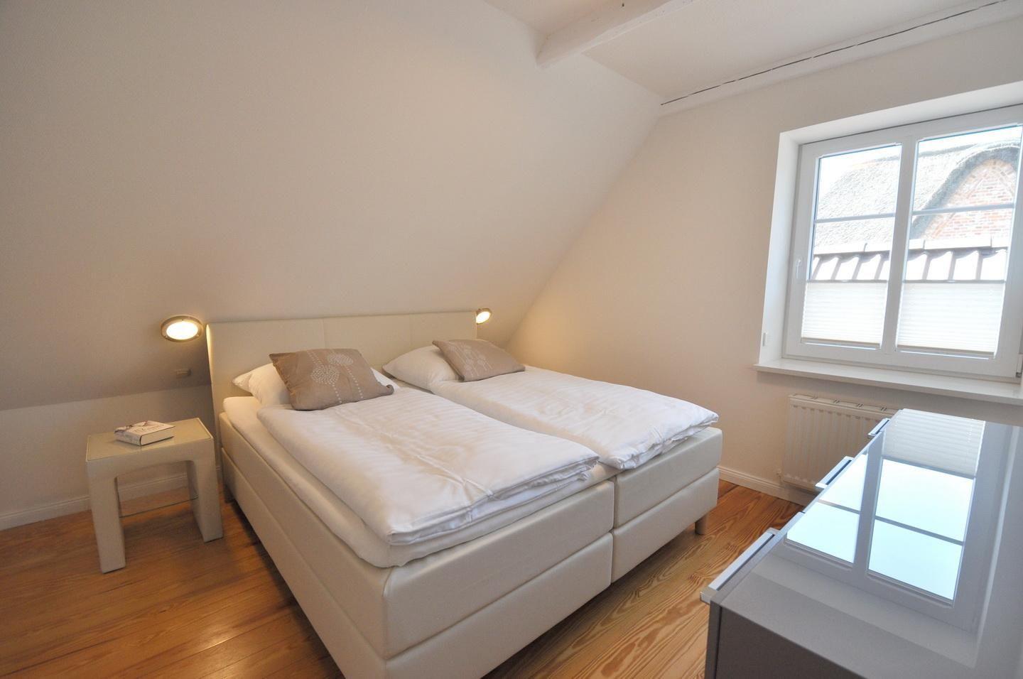 Obergeschoss: ein Schlafzimmer mit Doppelbett (180 x 200 cm - durchgehender Topper), ein Schlafzimmer mit Einzelbett (110 x 190 cm), ein Lesezimmer, ein Duschbad / WC