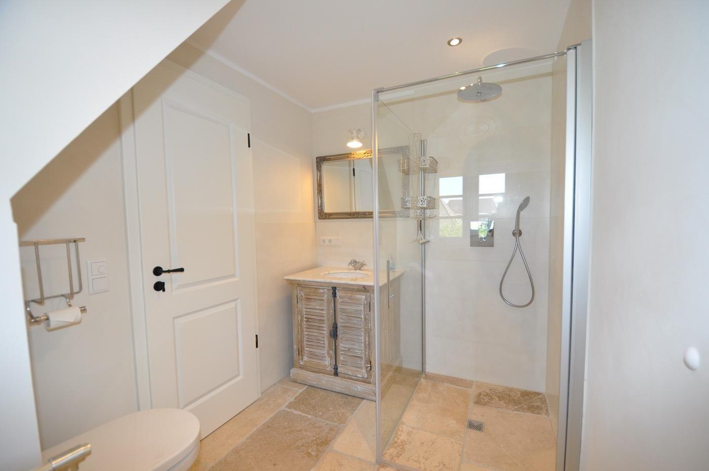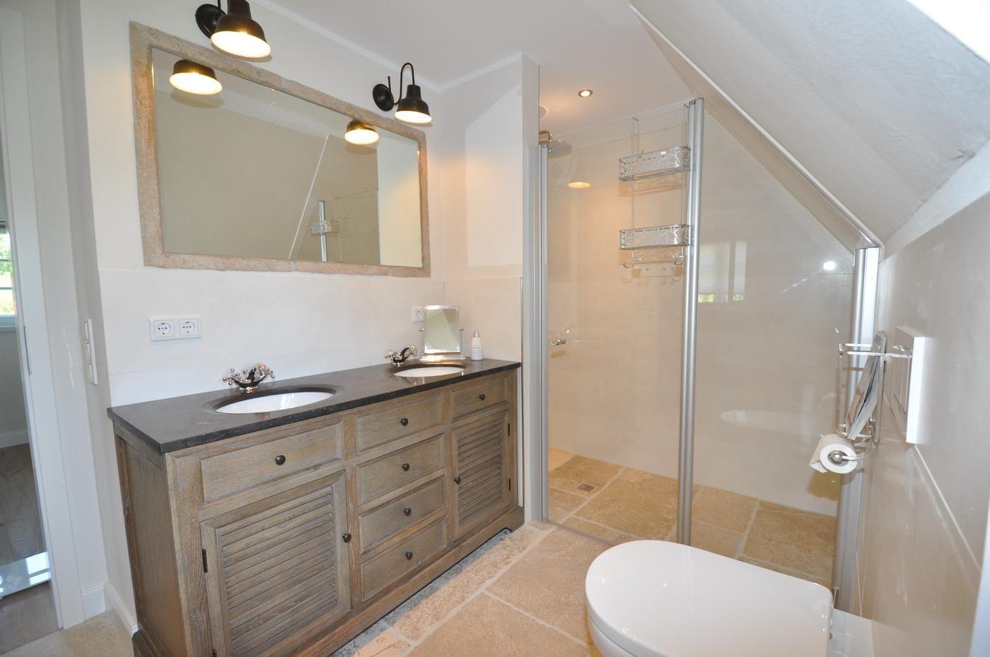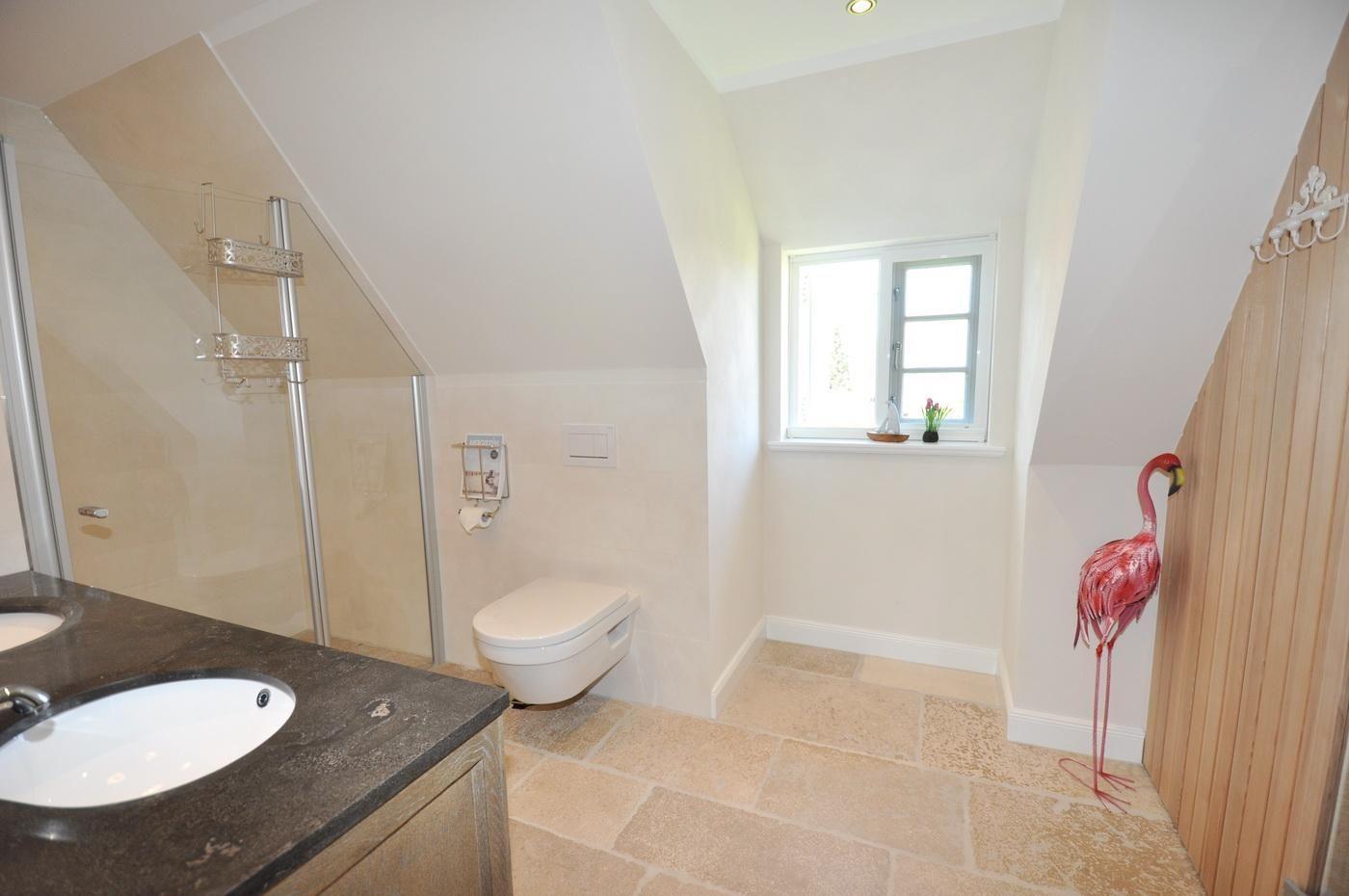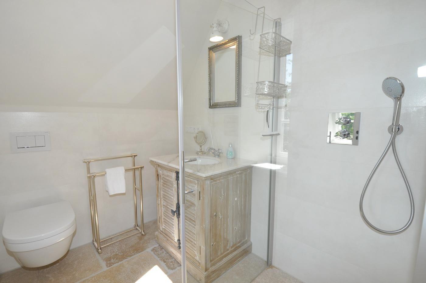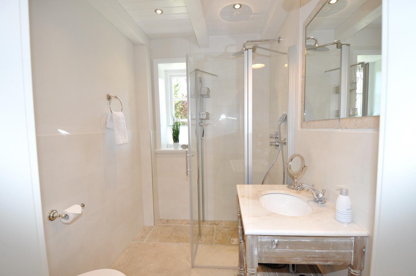 Obergeschoss: zwei Schlafzimmer mit Doppelbett (je 180 x 200 cm - Einzelmatratzen) und je einem Duschbad / WC en Suite, ein Schlafzimmer mit 2 Einzelbetten (je 90 x 200 cm), ebenfalls mit einem Duschbad / WC en Suite