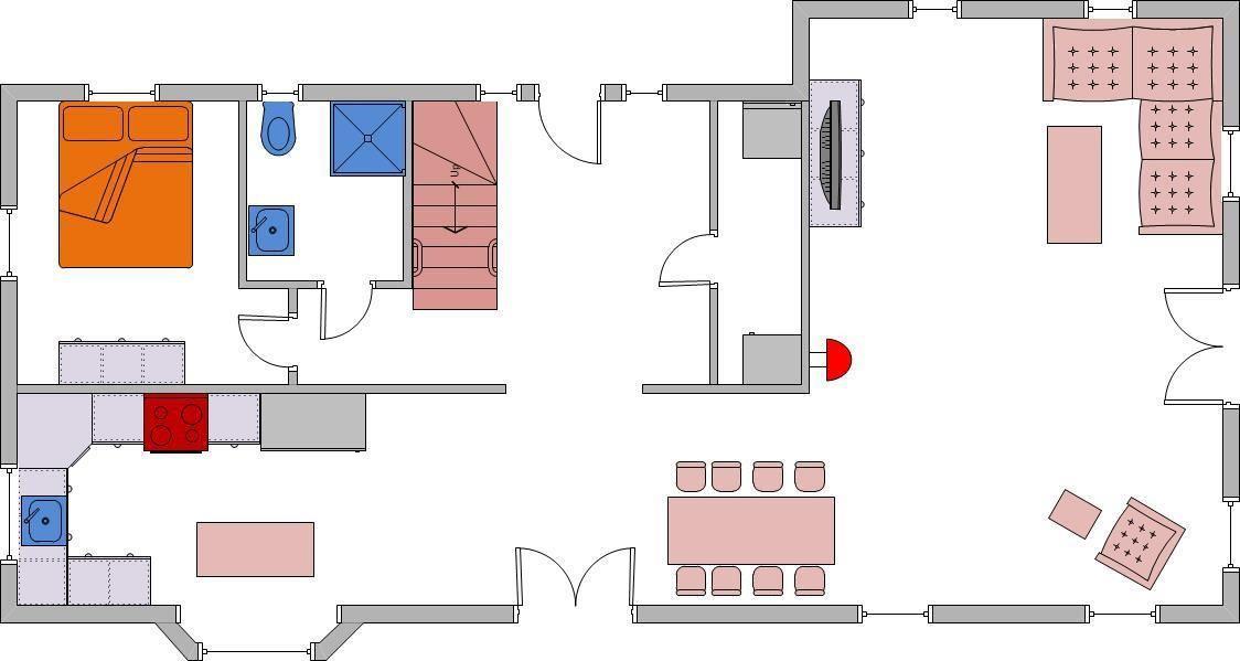 Erdgeschoss: Eingangsbereich, Wohnraum mit integrierter Küche, Essbereich, Kamin und Zugang zur Terrasse, ein Schlafzimmer mit Doppelbett (180 x 200 cm - Einzelmatratzen), ein separates Duschbad / WC, ein Hauswirtschaftsraum