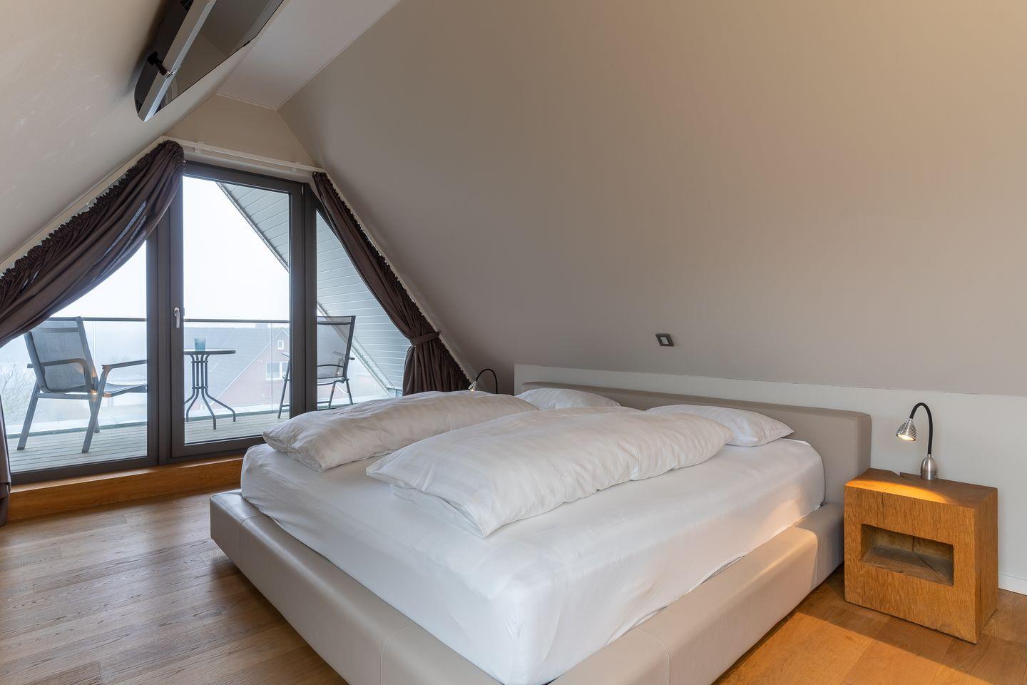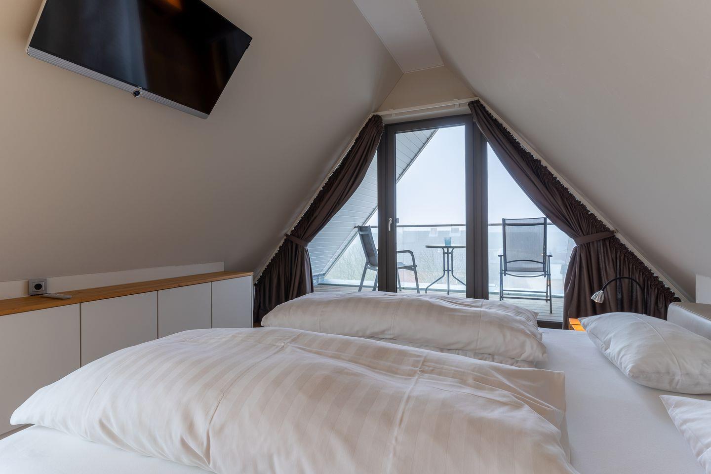 Ein großzügiger Süd-Balkon lädt zum Sonnen ein. Die Hochglanzküche mit hochwertigen Geräten, grenzt direkt am Wohnzimmer an. Das Duschbad bietet genügend Platz für Ihre Utensilien. Das Schlafzimmer mit einem 180er Doppelbett sorgt für ruhevolle Erholung. Ein weiteres Schlafzimmer befindet sich im Dachgeschoss, mit großartigem Weitblick bis zum Strand und großer Fensterfront. Beide Schlafzimmer bieten Ihnen zusätzlich einen TV.