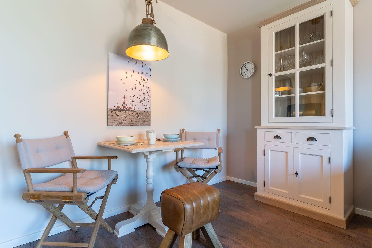 Die Wohnung für 2 Personen hat eine Größe von 36 qm und bietet Ihnen einen traumhaften Blick auf den Deich. Der Wohnbereich der Ferienunterkunft verfügt über einen gemütlichen Sitzbereich und einen Esstisch mit 2 Stühlen. Vom Wohnbereich gelangen Sie auf den Balkon wo ebenfalls ein Tisch mit 2 Stühlen steht. Die Küche ist ausgestattet mit einem 2 Plattenherd, Dunstabzugshaube, Garderobe, Geschirr, Kaffeemaschine, Kochtöpfe, Küchenzeile, Kühlschrank, Toaster, und einem Wasserkocher.
