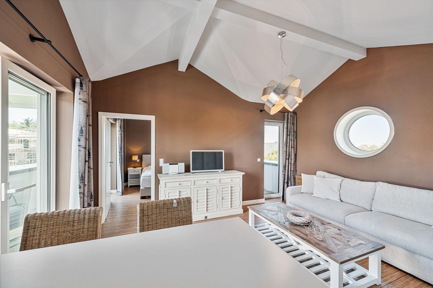 Das Penthouse verfügt über ca. 50 m² Wohnfläche und ist sehr mediterran mit Möbeln von Riviera Maison zum Träumen eingerichtet. Ein gemütliches Wohnzimmer mit TV und offener Wohnküche laden zum Chillen ein. Die Küche ist mit hochwertigen Geräten voll ausgestattet. Das Duschbad ist großzügig gestaltet und bieten genügend Platz für Ihre Utensilien. Ein Schlafzimmer mit Doppelbett und offenem Fußende sorgt für ruhevolle Erholung.