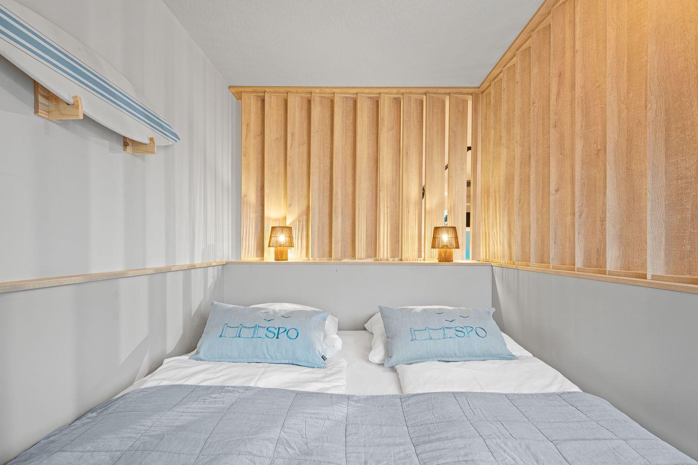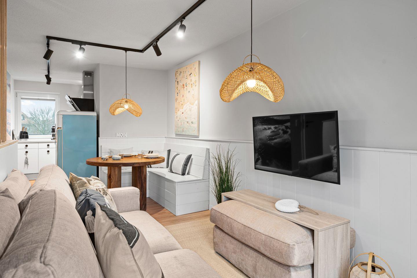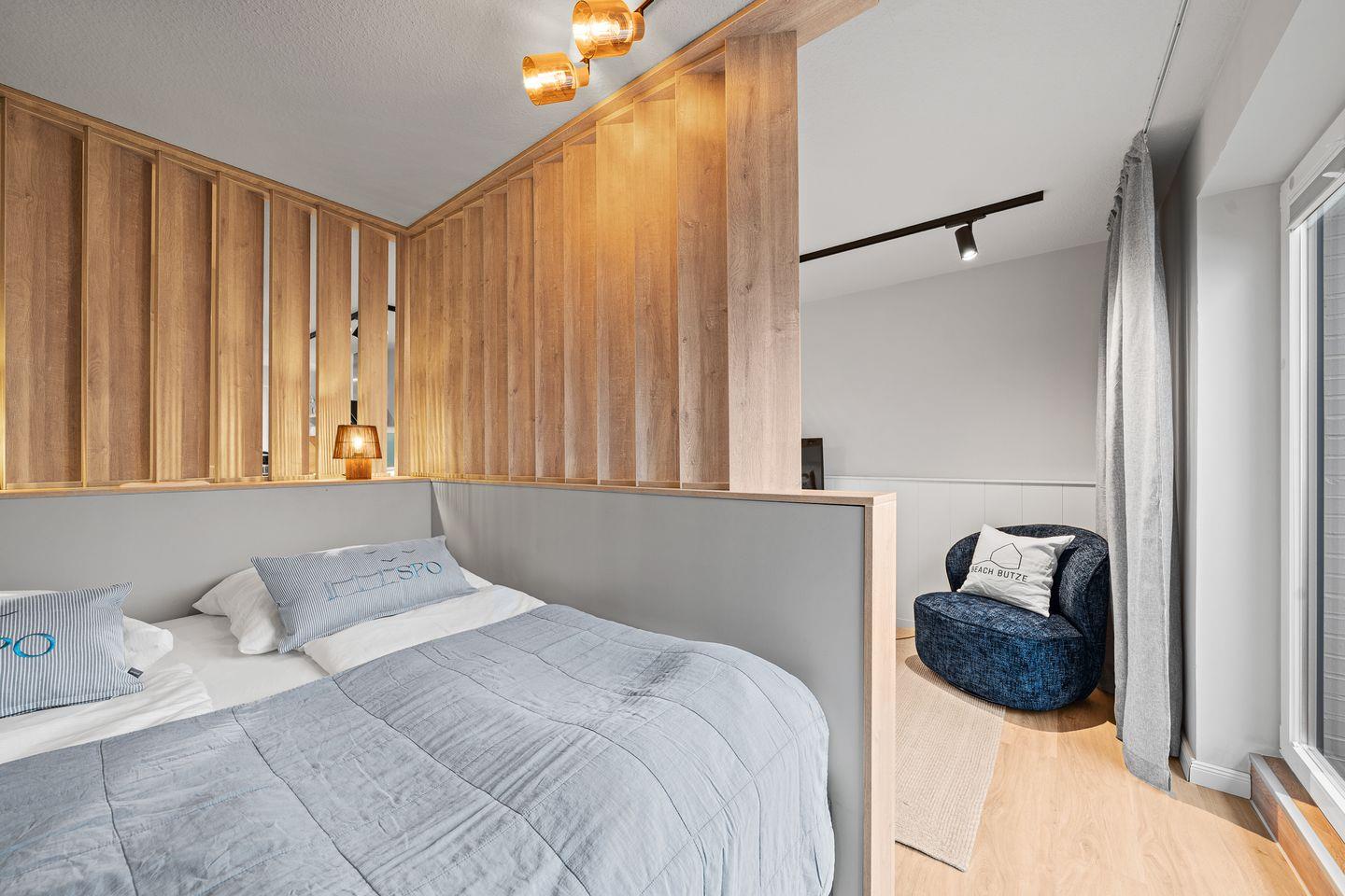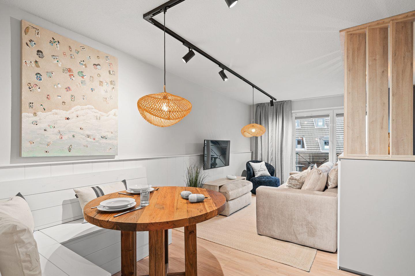 Der kombinierte Wohn- und Schlafbereich ist mit hochwertigem Design-Vinylboden versehen und mit maßgefertigten Möbeln im stilvollen Beach-Style eingerichtet. Das Badezimmer überzeugt mit eleganten Feinsteinzeugfliesen und lässigen, matt-schwarzen Armaturen. Für Unterhaltung sorgen ein Sat-TV-Flachbildschirm, Radio sowie kostenfreies WLAN. Der gemütliche Balkon lädt zum Entspannen und Verweilen ein. Im Erdgeschoss steht ein Fahrradabstellraum zur gemeinschaftlichen Nutzung für alle Feriengäste zur Verfügung.