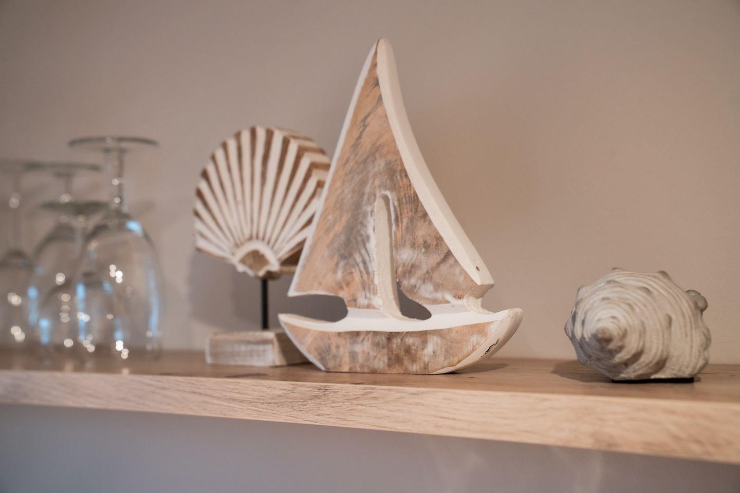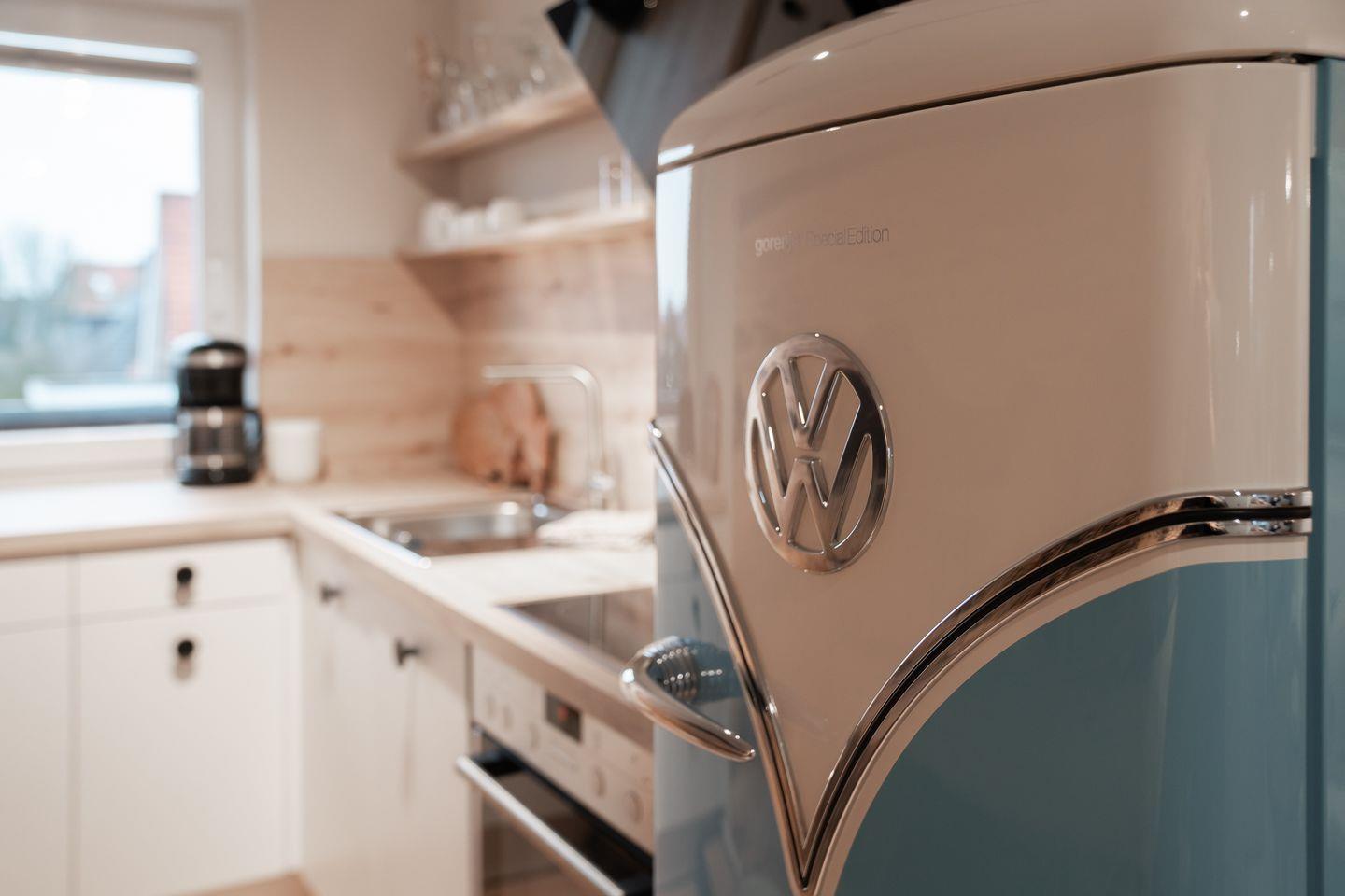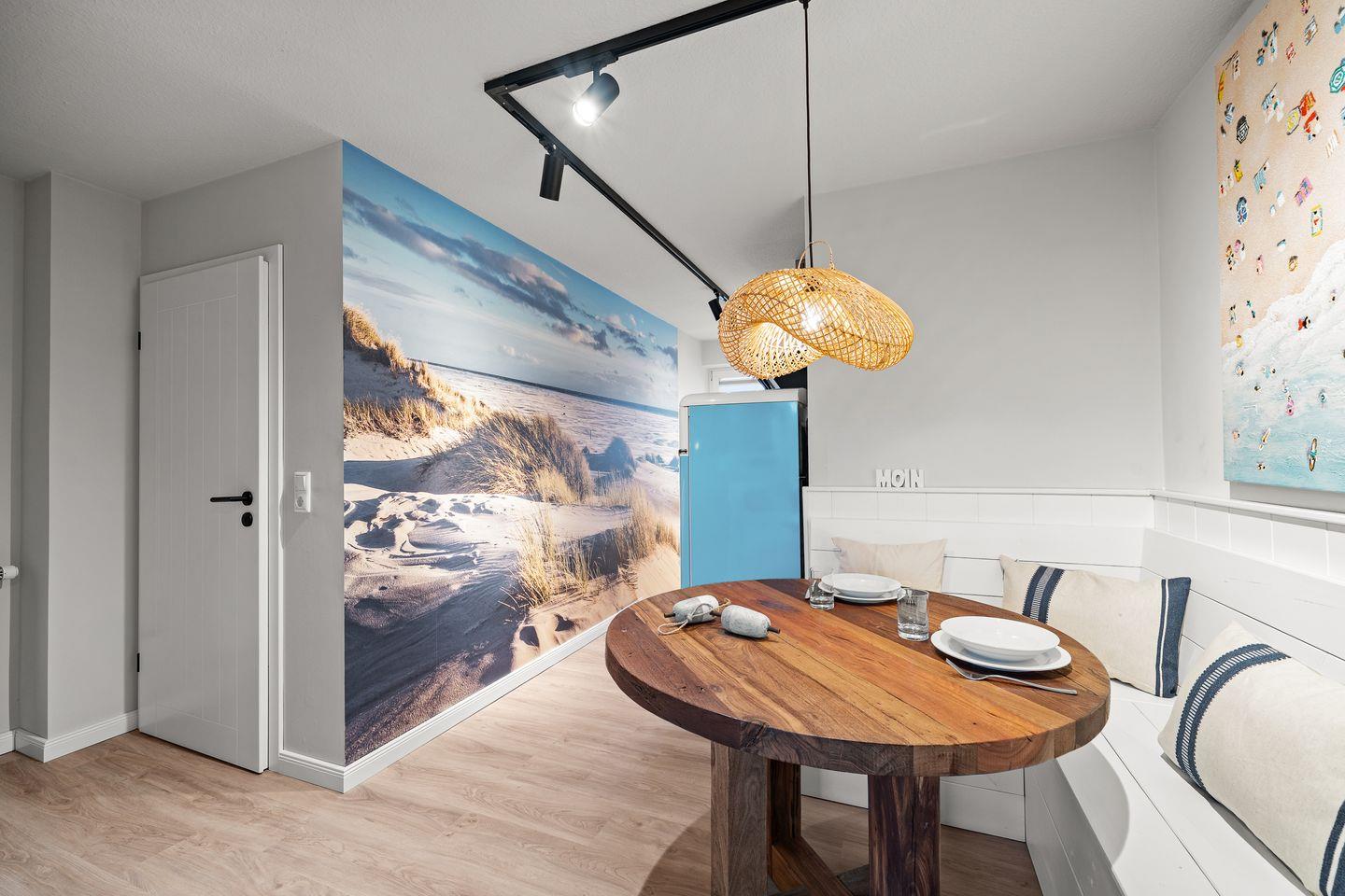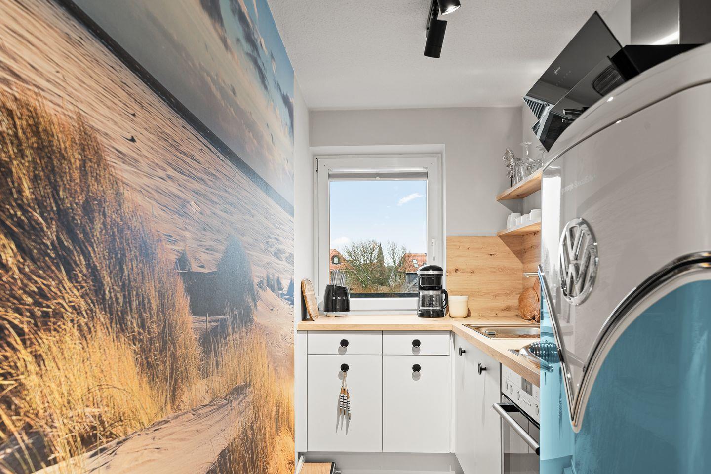 In dieser liebevoll eingerichteten Wohnung können Sie sich zu zweit rundum wohlfühlen und den Abend bei einem Glas Wein ausklingen lassen, während die Sonne langsam hinter dem Deich versinkt. Die 41 qm große Ferienwohnung bietet einen hellen, freundlichen Wohn- und Schlafbereich mit einem komfortablen Bett. Die moderne Küche ist vollständig ausgestattet und verfügt über Herd, Backofen, Dunstabzugshaube, Geschirrspüler, Kühlschrank sowie Kaffeemaschine, Toaster, Wasserkocher, Kochtöpfe und Geschirr – ideal für die Selbstverpflegung.
