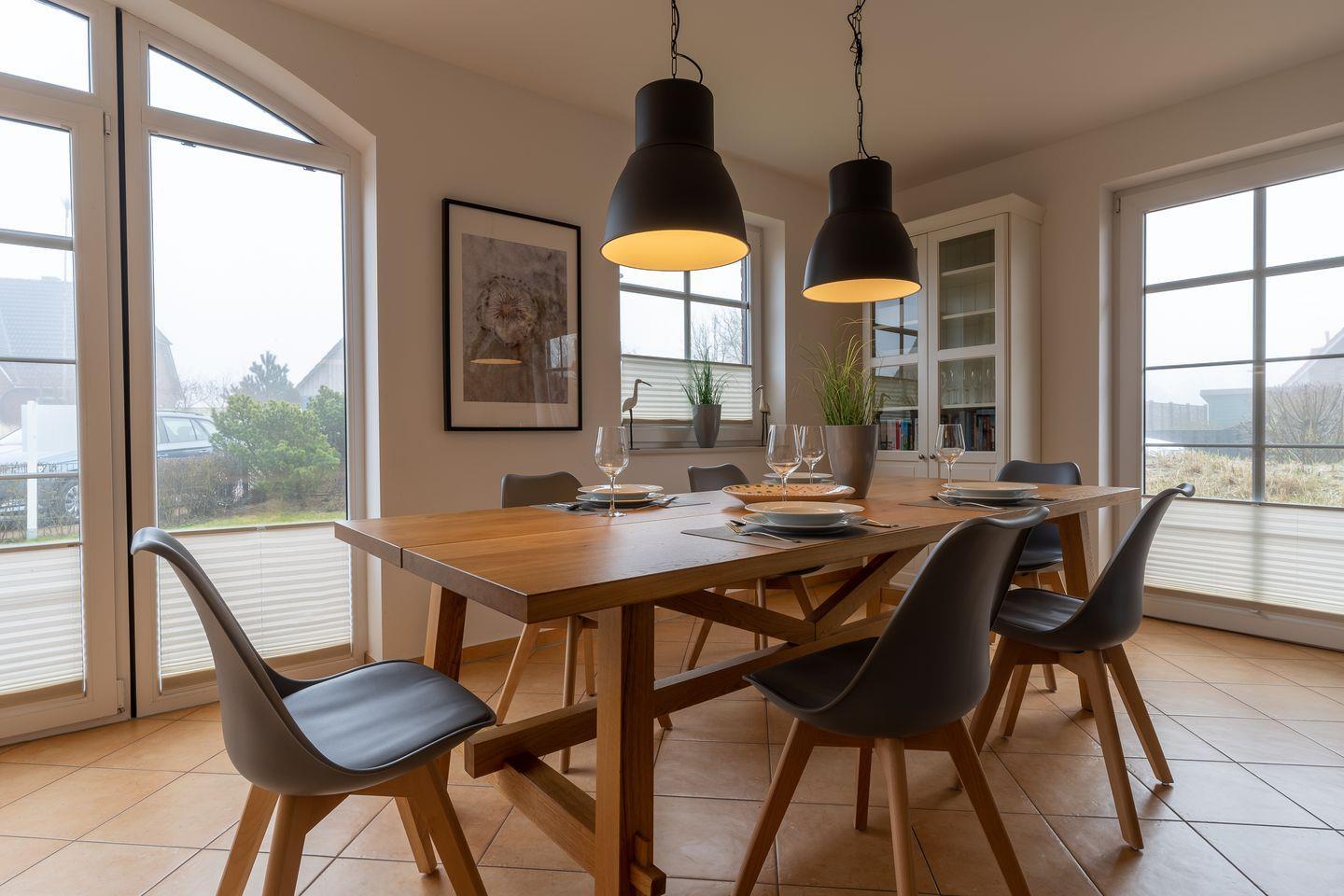 Das wunderschöne Doppelhaus mit Garten und 2 gemütlichen Terrassen befindet sich in einer ruhigen Parallelstraße zum Strand im Ortsteil Ording. Das Haus verfügt über ca. 90m² Wohnfläche und teilt sich wie folgt auf: Im Erdgeschoss befindet sich der großzügige Wohnraum mit einer hellen offenen Wohnküche und einem gemütlichen Essbereich. Die Küche ist voll ausgestattet mit hochwertigen Geräten und edlem Geschirr. Im Erdgeschoss ist ebenso ein großer Flur mit eingebauter Garderobe, ein Hauswirtschaftsraum und ein Duschbad. Über eine Holztreppe gelangt man in das Obergeschoss mit zwei großzügigen Schlafzimmern mit je einem Doppelbett und ein drittes Schlafzimmer mit einem Einzelbett, alle Schlafzimmer haben Boxspringbetten. Ein weiteres Duschbad bietet jeden Komfort. Mit viel Liebe zum Detail wurde großen Wert auf die Inneneinrichtung gelegt. Das ganze Haus verfügt über große Fenster und somit ist jeder Raum herrlich lichtdurchflutet.