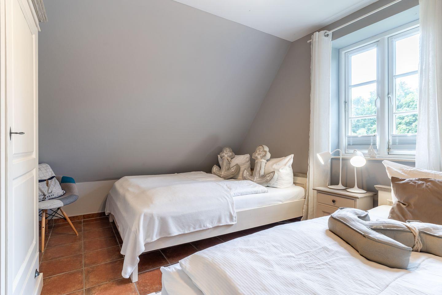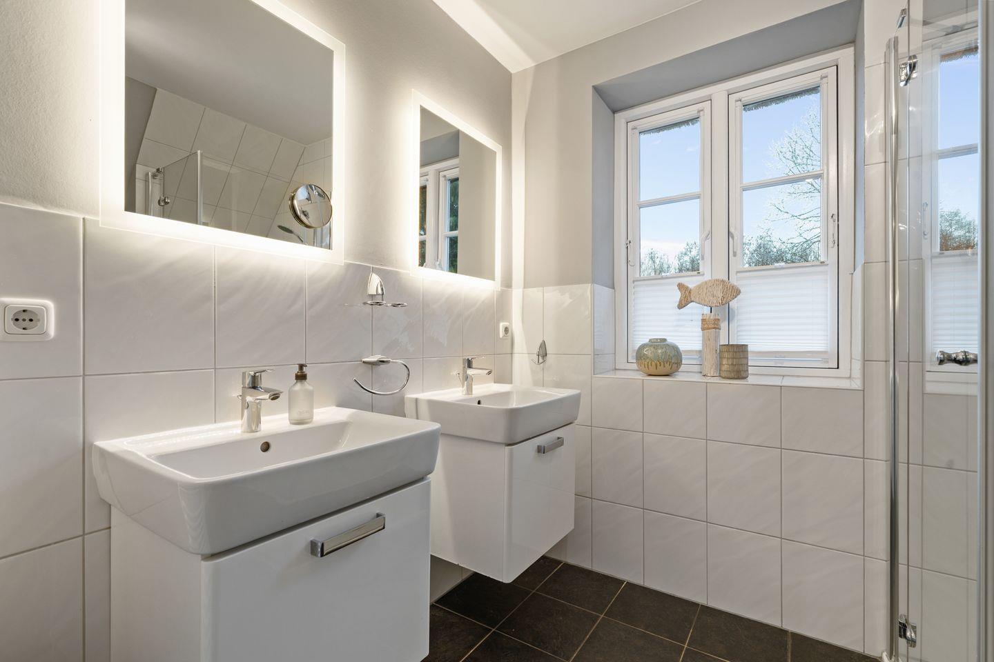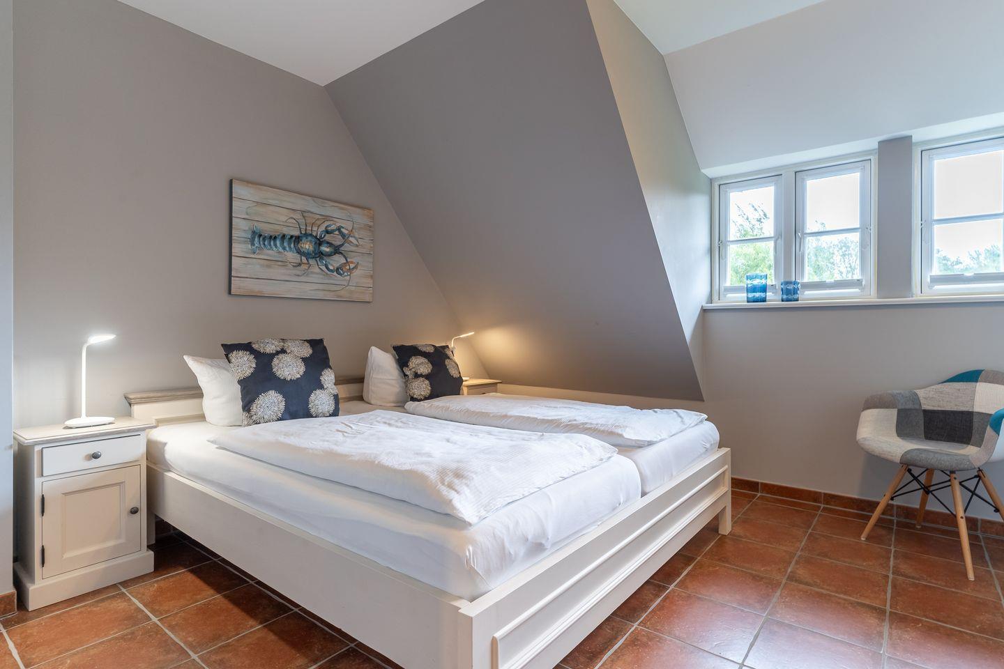 Im Erdgeschoss befindet sich der wunderschöne Wohnraum mit einem gemütlichen Essbereich und Zugang zu 2 Terrassen. Die offene Wohnküche ist mit allen wichtigen Geräten voll ausgestattet und lädt zum gemeinsamen Kochen ein. Ebenso ist im Erdgeschoss ein geräumiger Flur und ein Gäste WC. Im Obergeschoss befinden sich zwei Schlafzimmer. Eines mit einem Doppelbett und großem Kleiderschrank und ein weiteres mit 3 Schlafplätzen, einem Doppelbett und einem Einzelbett. Außerdem ist im Obergeschoss ein geräumiges Vollbad mit Eckbadewanne. Zusätzlicher Luxus im Obergeschoss ist ein weiteres Gäste-WC.