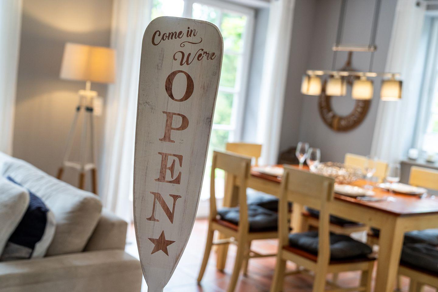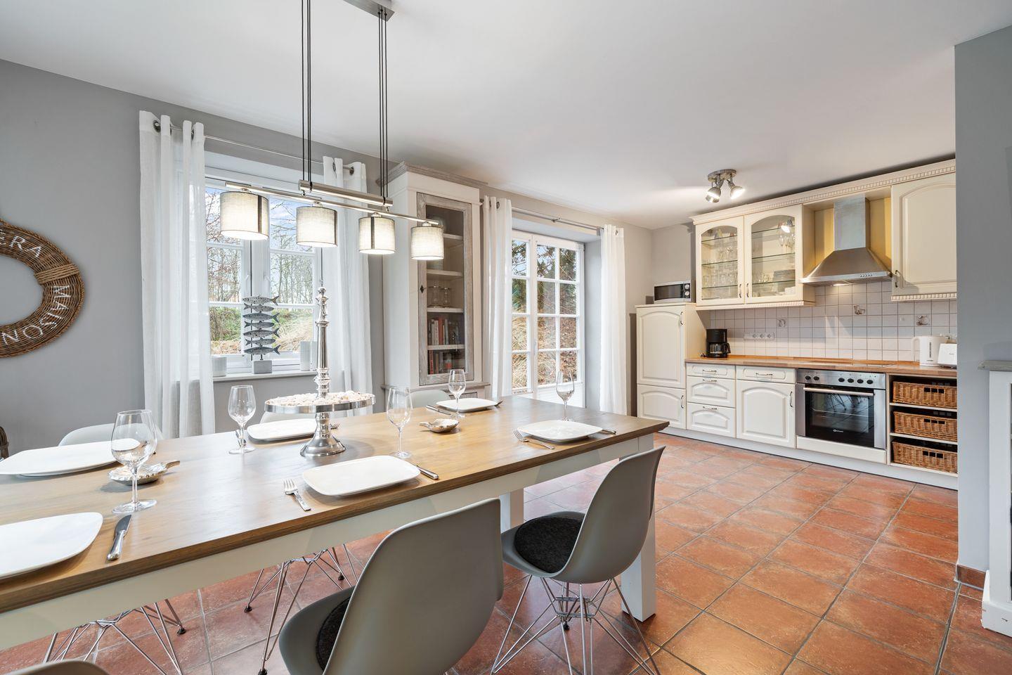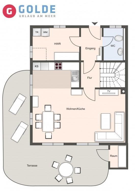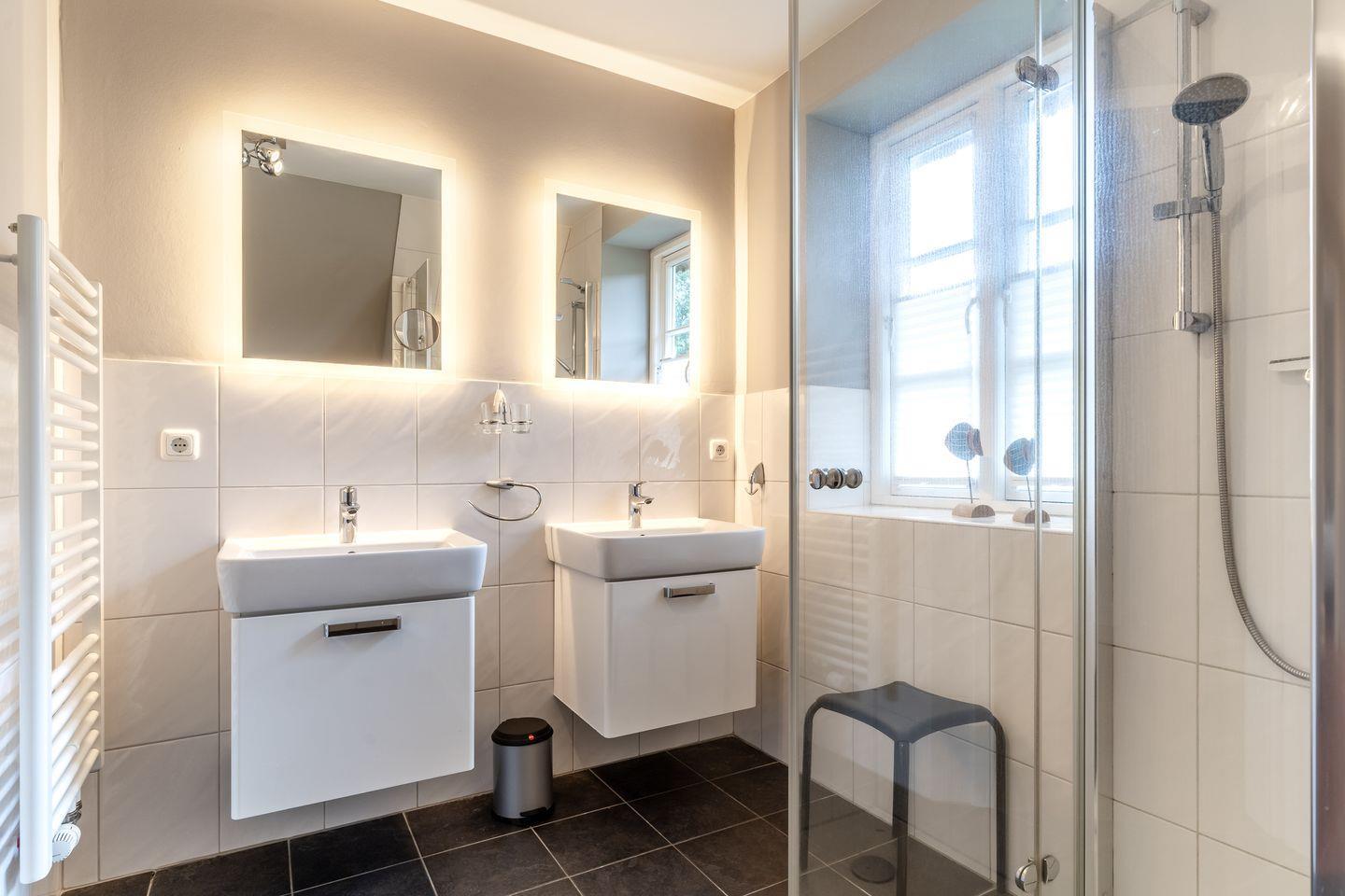 Im Erdgeschoss befindet sich der wunderschöne Wohnraum mit einem gemütlichen Essbereich und Zugang zu 2 Terrassen. Die offene Wohnküche ist mit allen wichtigen Geräten voll ausgestattet und lädt zum gemeinsamen Kochen ein. Ebenso ist im Erdgeschoss ein geräumiger Flur und ein Gäste WC. Im Obergeschoss befinden sich zwei Schlafzimmer. Eines mit einem Doppelbett und großem Kleiderschrank und ein weiteres mit 3 Schlafplätzen, einem Doppelbett und einem Einzelbett. Außerdem ist im Obergeschoss ein geräumiges Vollbad mit Eckbadewanne. Zusätzlicher Luxus im Obergeschoss ist ein weiteres Gäste-WC.