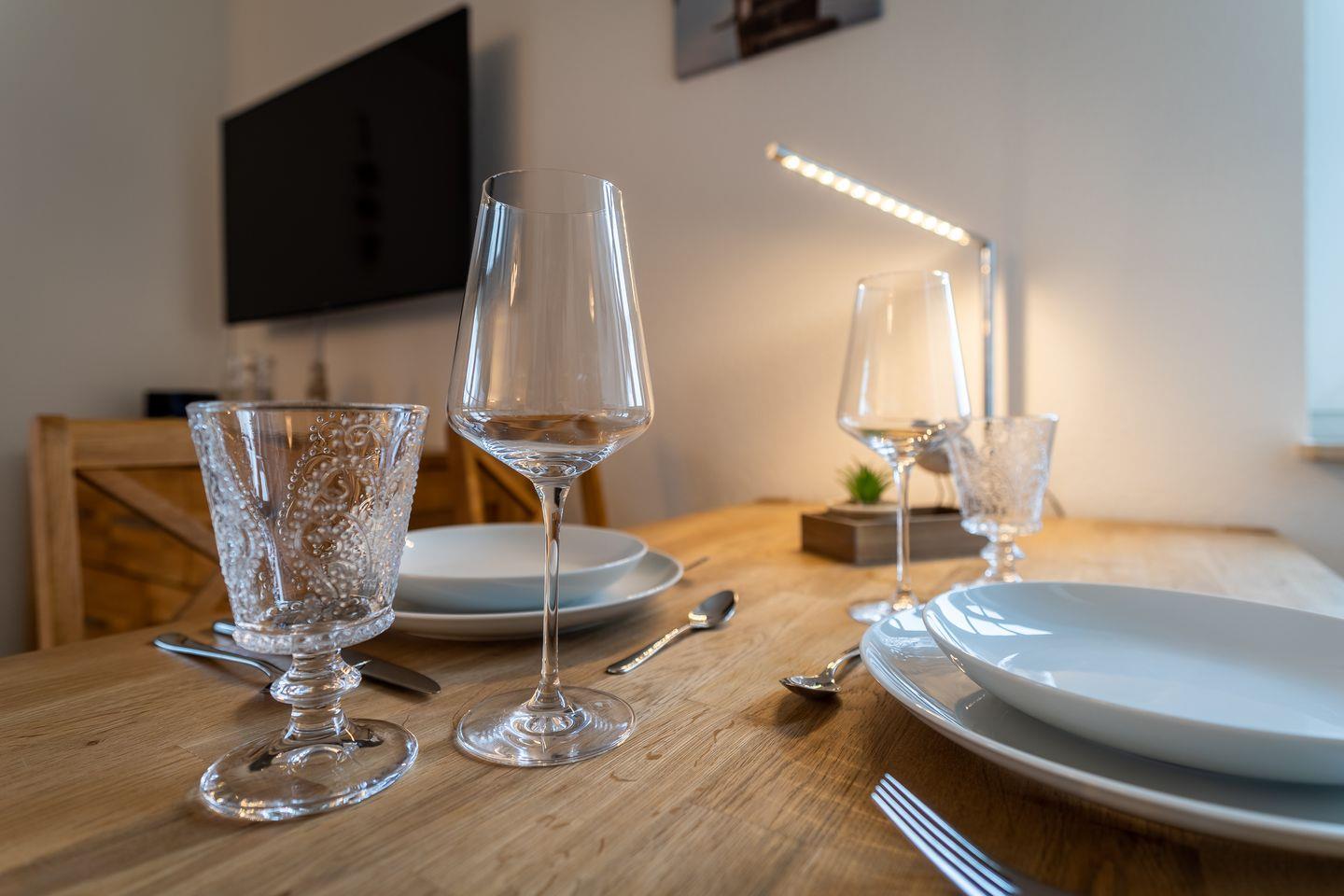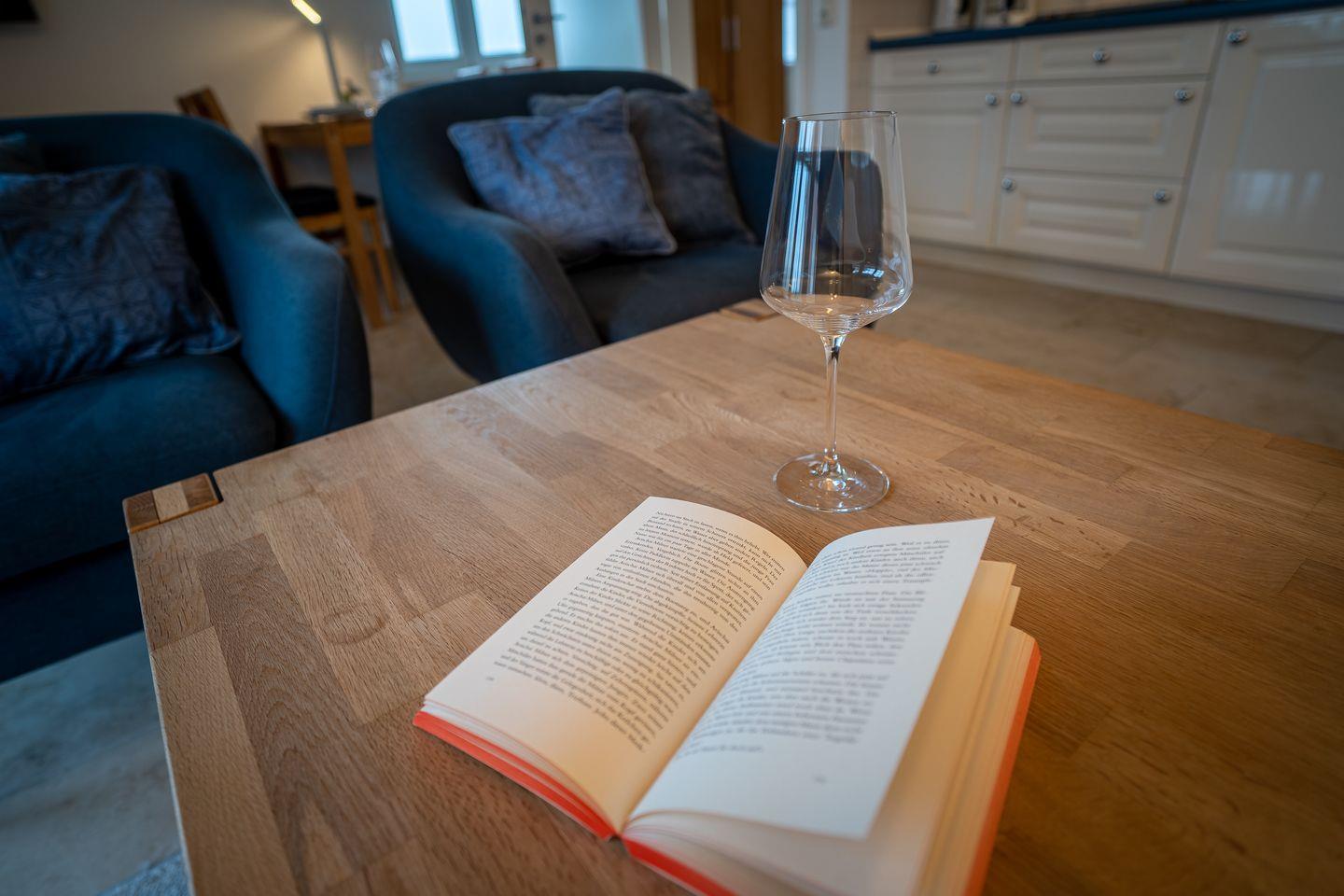 Die Erdgeschosswohnung "Aussicht" verfügt über ca. 52m² Wohnfläche. Sie haben einen eigenen separaten Eingang und gelangen direkt in den Flur, der für Abstellmöglichkeiten sehr nützlich ist. Von dort gelangt man in den Wohnraum mit einer großzügigen offenen Wohnküche und einem gemütlichen Essbereich. Die Küche ist mit hochwertigen Geräten voll ausgestattet. Ebenso vom Flur abgehend haben Sie ein Duschbad und ein geräumiges Doppelschlafzimmer mit 3 Fenstern. Alle Fenster können mit Rollos und Vorhängen verdunkelt werden. Die Wohnung ist wunderbar lichtdurchflutet und bietet von allen Fenstern aus einen traumhaften Blick über die Wiesen.
