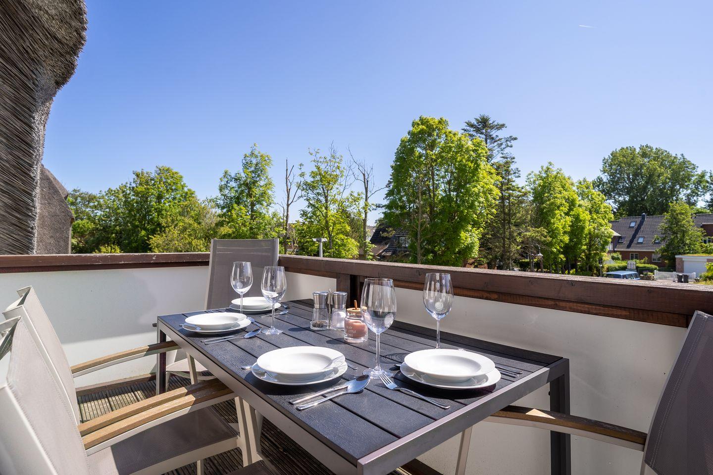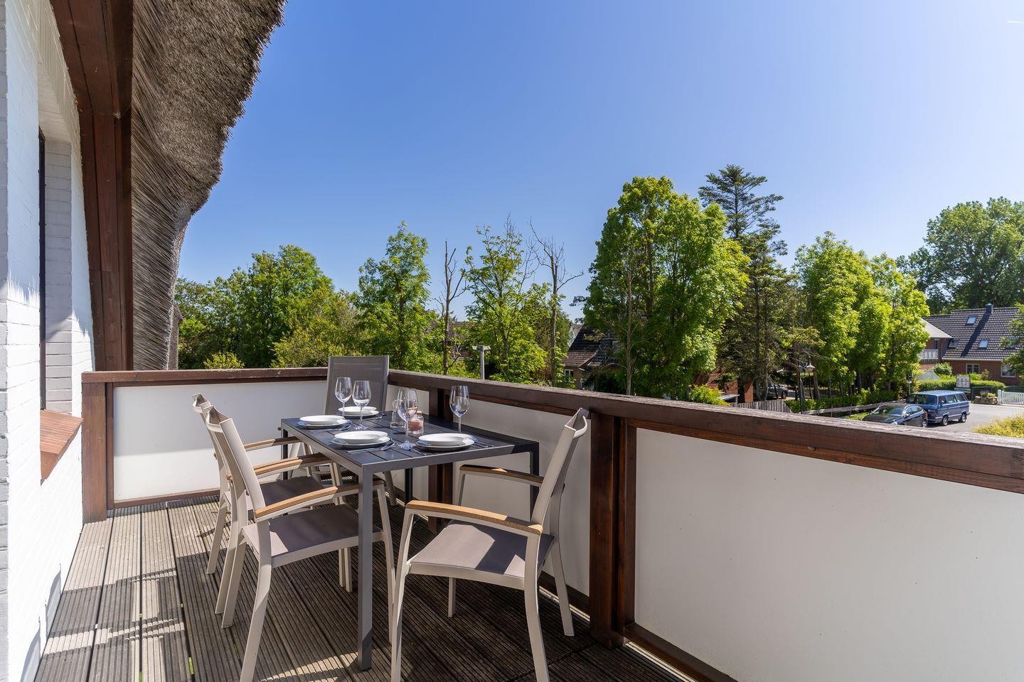 Exklusives Appartement unter Reet in St. Peter-Ording mit Balkon, Sauna und moderner Ausstattung für erholsamen Urlaub.