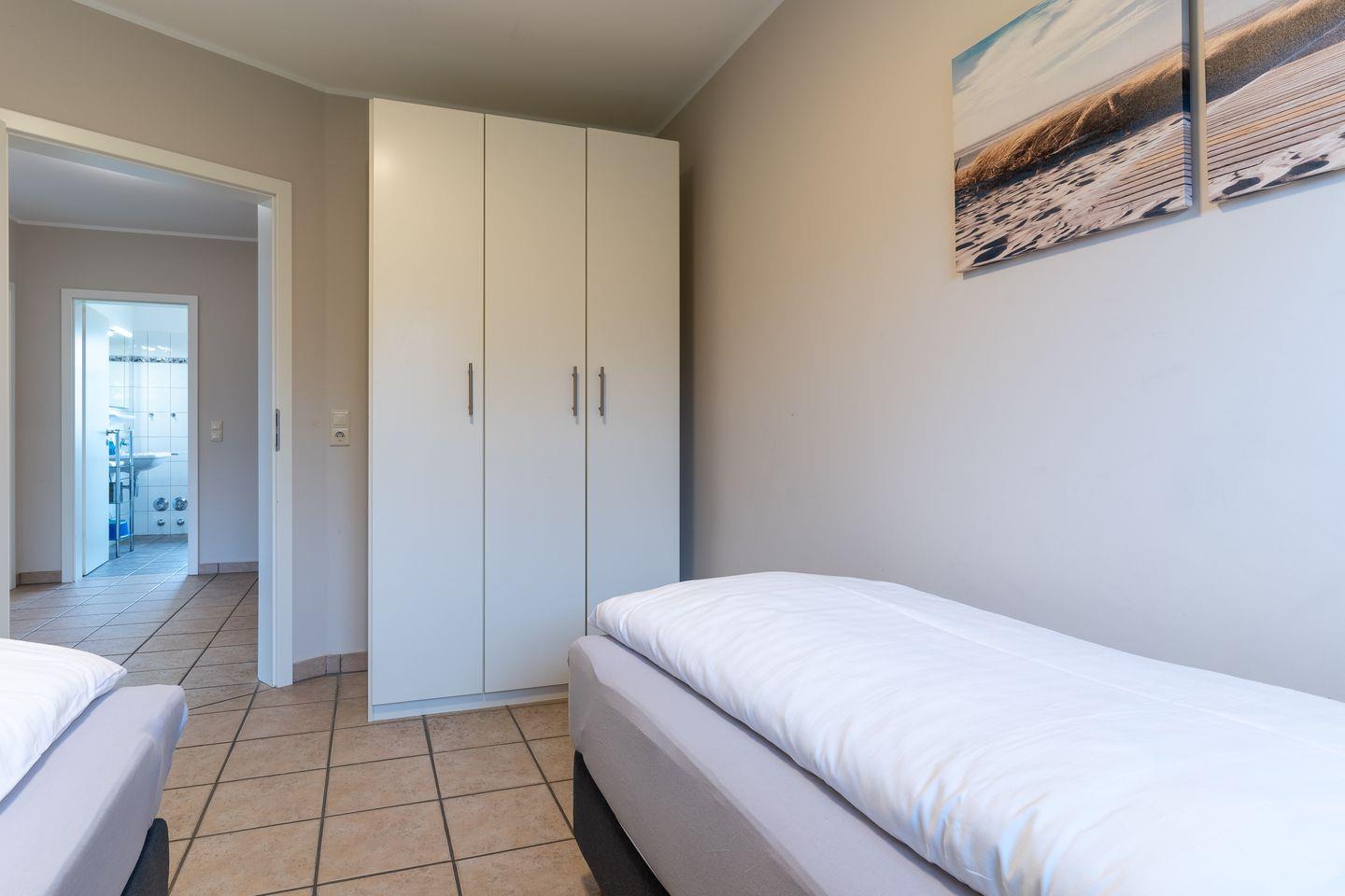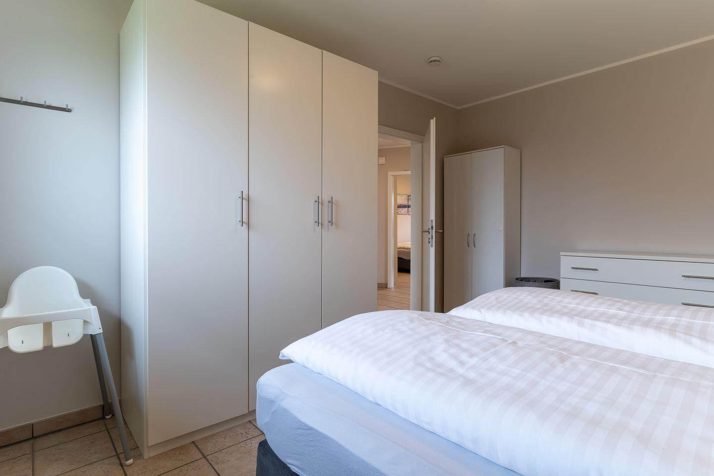 Die Wohnung ist komplett gefliest und verfügt im Badezimmer über eine Fußbodenheizung. Die beiden Schlafzimmer, eines mit einem Doppelbetten und das andere mit 2 Einzelbett, erreichen Sie direkt vom großen Flur und bieten herrliche Ruhe.