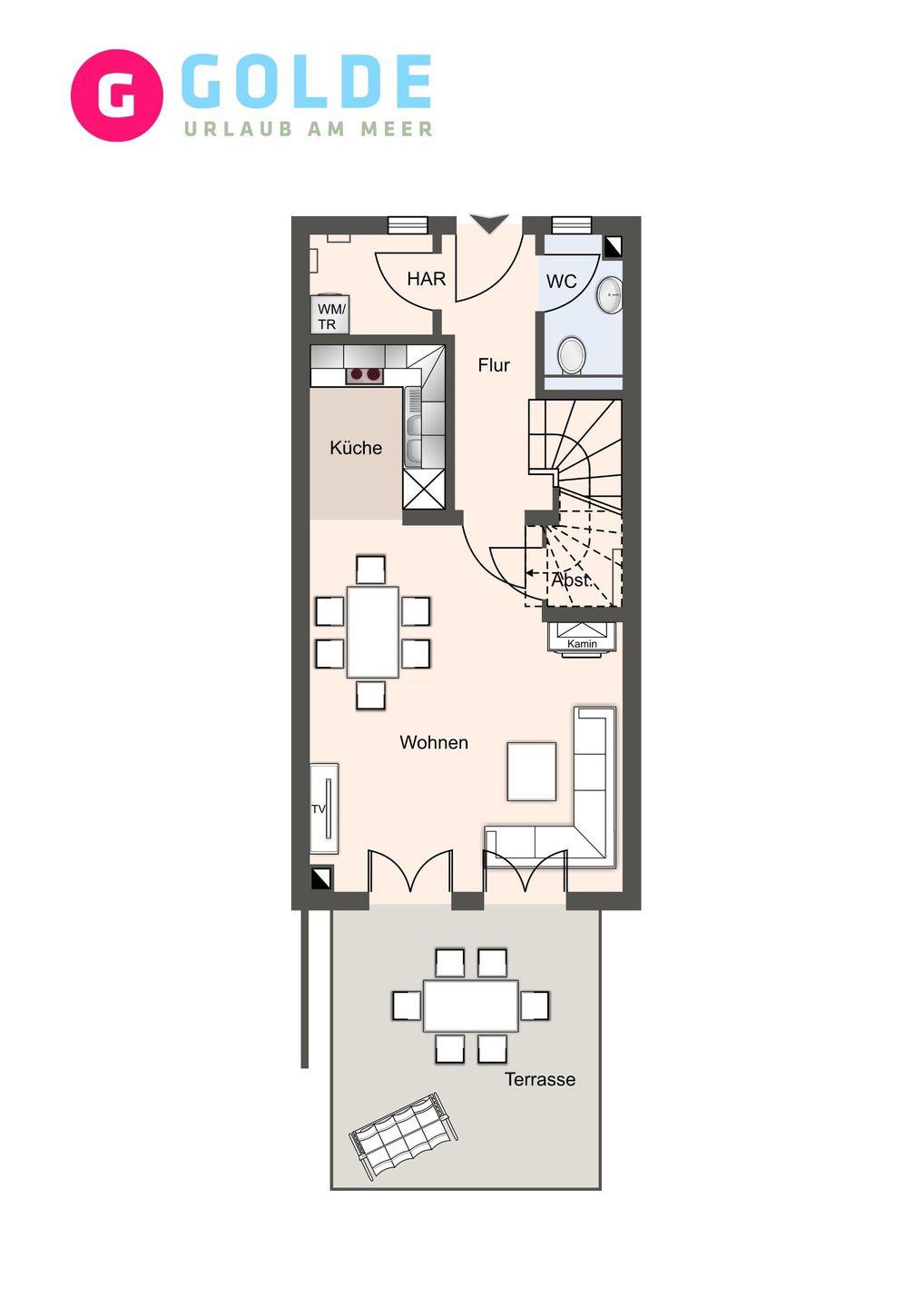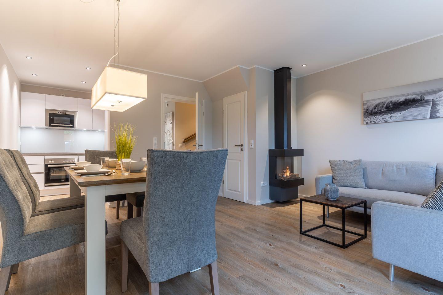 Die luxuriöse Mittelhausscheibe mit Garten, gemütlicher Terrasse und traumhaften Blick über den Deich befindet sich direkt am Ordinger Hauptstrand. Das Haus verfügt über ca. 84 m² Wohnfläche und teilt sich wie folgt auf: Im Erdgeschoss befindet sich der Wohnraum mit einer offenen Wohnküche und einem gemütlichen Essbereich. Ein edler Kamin im Wohnraum bietet ruhevolle Entspannung. Die Küche ist mit hochwertigen Geräten und edlem Geschirr voll ausgestattet. Im Erdgeschoss ist ebenso ein Gäste WC, ein Flur mit Garderobe, ein Abstellraum unter der Treppe und Hauswirtschaftsraum mit Waschmaschine. Über eine Holztreppe gelangt man in das Obergeschoss mit zwei großzügigen Schlafzimmern, eines mit einem Doppelbett und das Andere mit 2 Einzelbetten. Ebenso ist im OG noch ein geräumiges Duschbad. Über eine weitere Holztreppe geht es vom Doppelzimmer der Einzelbetten ins Dachgeschoss mit gemütlichem Schlafsofa für 2 Personen. Hier kann man mit einem traumhaftem Weitblick bis zum Wasser herrlich entspannen oder übernachten. Mit viel Liebe zum Detail wurde großen Wert auf die Inneneinrichtung gelegt. Das ganze Haus verfügt über große Fenster und somit ist jeder Raum herrlich lichtdurchflutet.