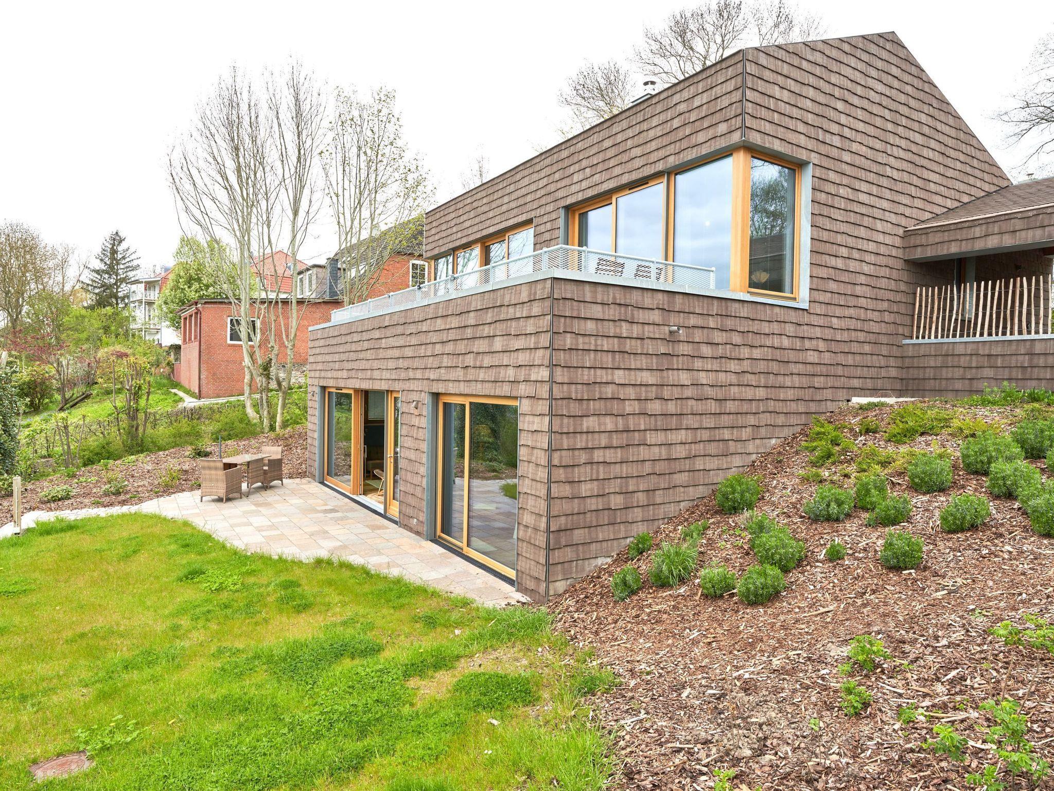 Es erinnert an einen amerikanischen Bungalow, überzogen mit einem erdfarbenen Schuppenpanzer aus französischen Tonschindeln.