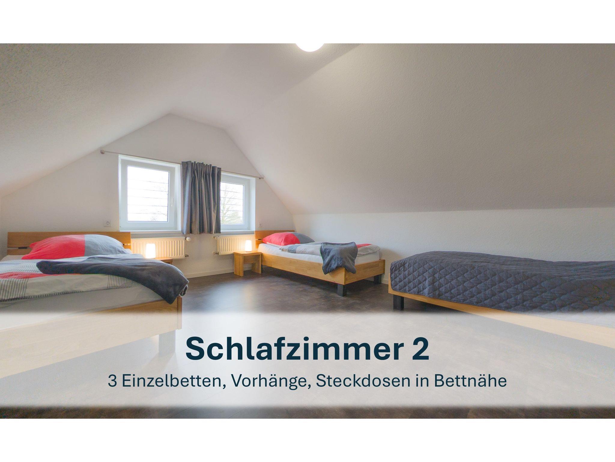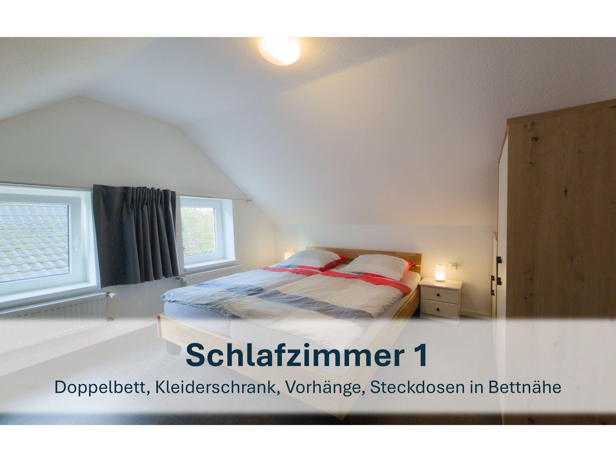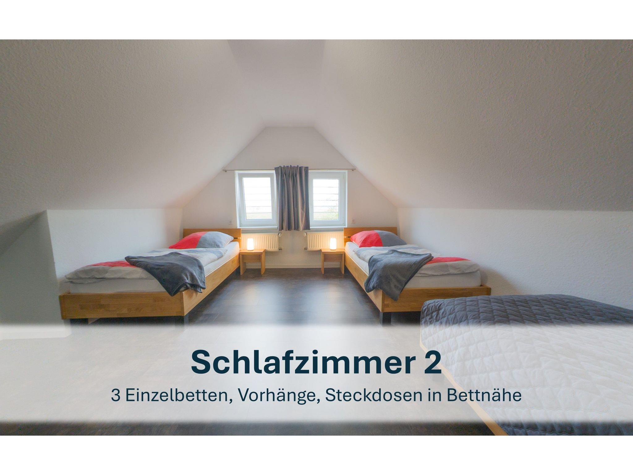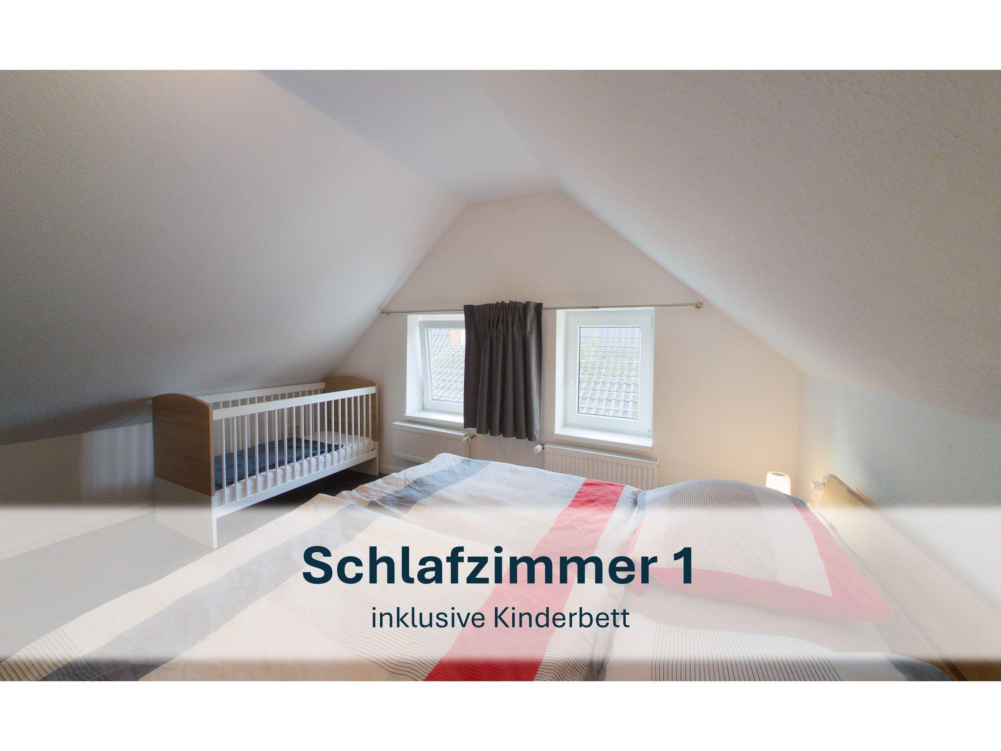 Über die Treppe gelangen Sie ins Obergeschoss, wo sich die beiden Schlafzimmer befinden. Das eine Schlafzimmer ist mit einem großen Kingsize-Bett und einem Babybett ausgestattet, während das zweite Schlafzimmer mit 3 Einzelbetten viel Platz für erholsame Nächte bietet. Die Bettwäsche ist im Preis bereits enthalten. Handtücher sind jedoch mitzubringen.