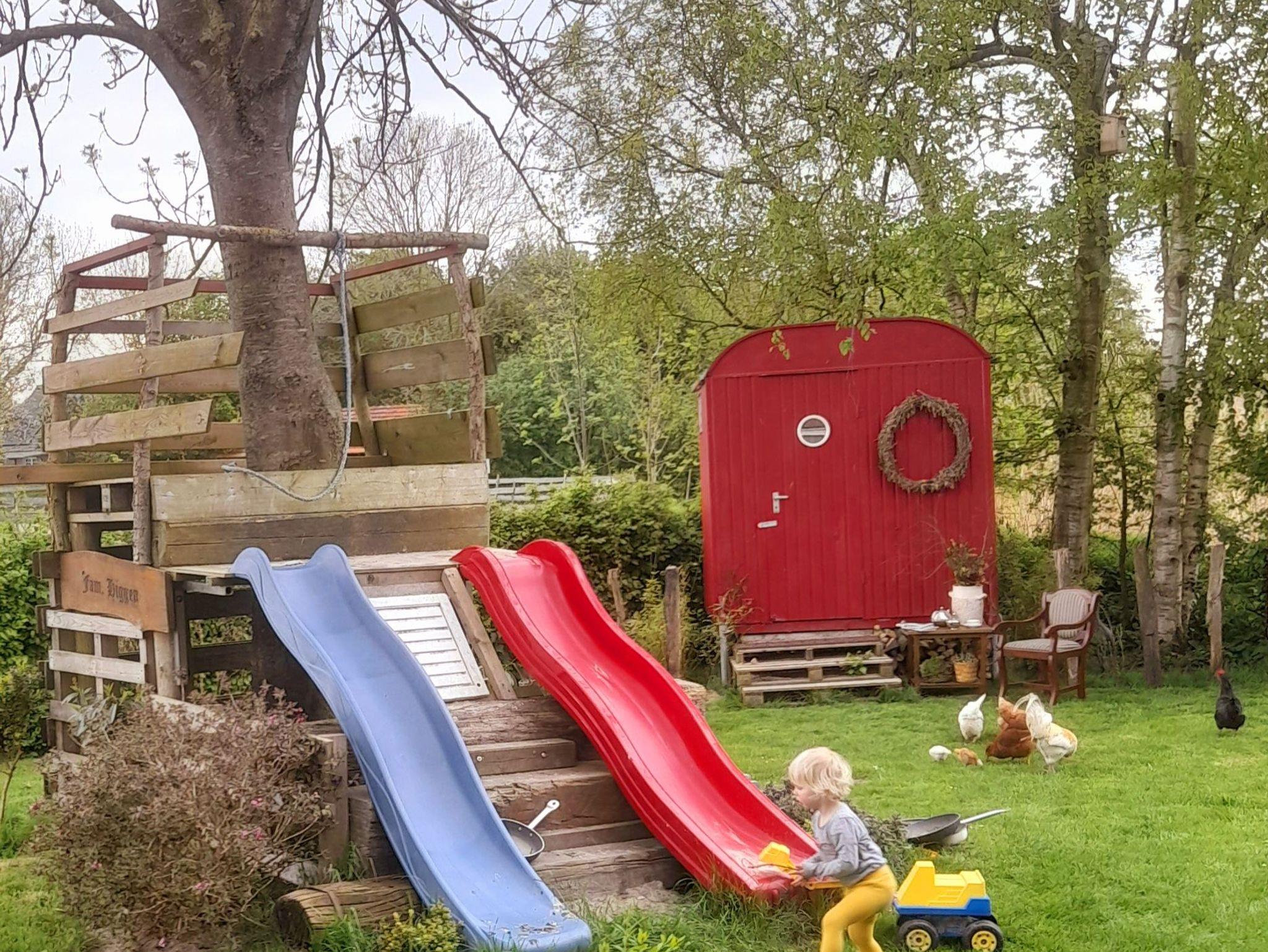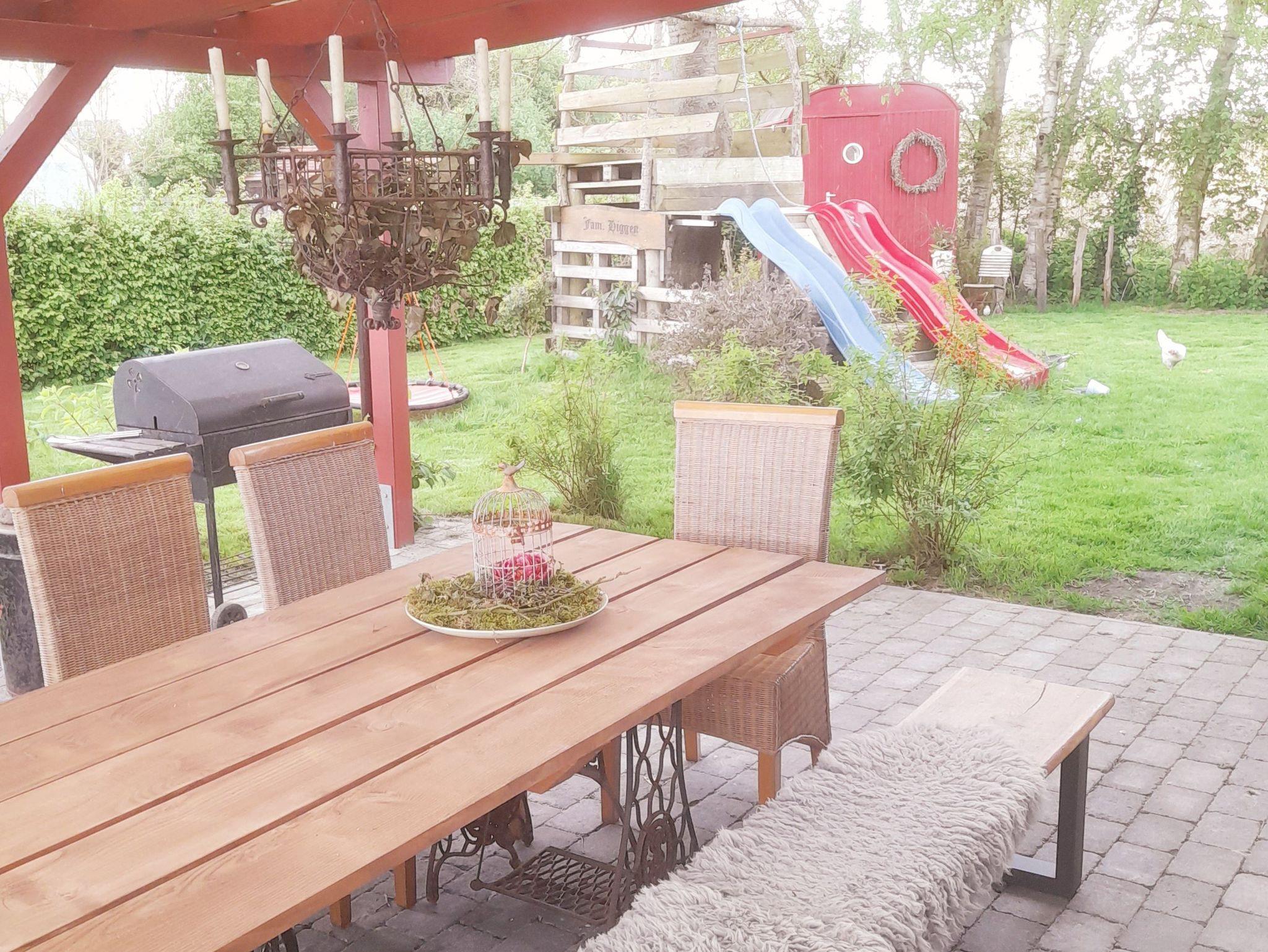 Der Garten verfügt über eine überdachte Terrasse mit großem Tisch, Grillmöglichkeiten, eine Feuerstelle mit Sitzbänken zum gemütlichen Beisammensein und Spielmöglichkeiten (Sandkasten, Wasserspiele, Trampolin, Kletterturm, Rutschen, Schaukel) für Kinder. Gerne dürfen Sie auch Ihren Hund mitbringen, sofern er sich mit unseren Kaninchen verträgt. Hierfür berechnen wir 5€/Nacht zusätzlich.