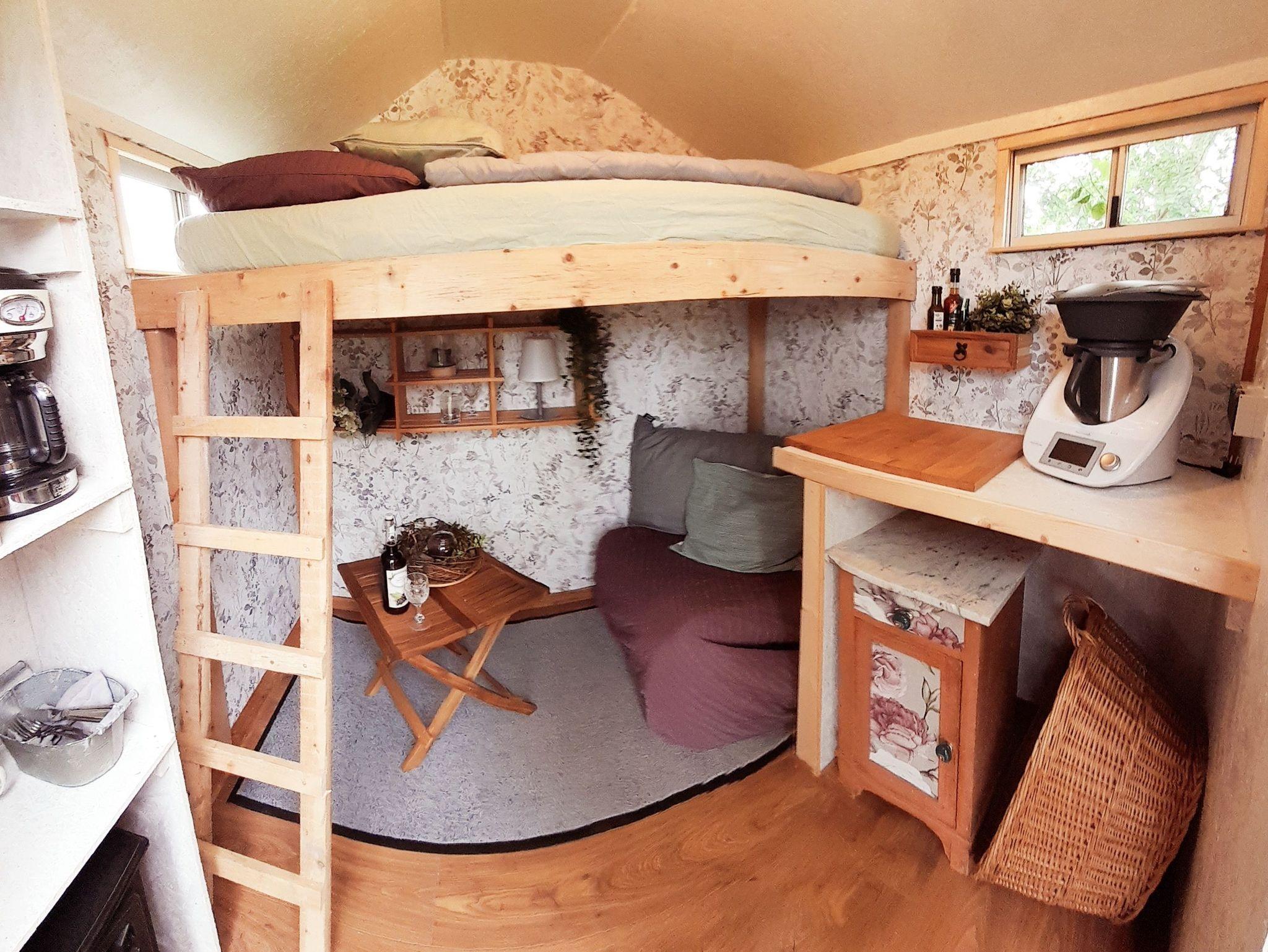 Auf kleinstem Raum bietet sich Platz für ein Etagenbett, eine kleine Arbeitsplatte mit einigen Küchenutensilien, sowie ein Regal für Geschirr und andere Dinge. Wir stellen Ihnen einen Thermomix TM5 (Wasser kochen, Eier kochen, Suppen, Erfrischungsgetränke, Kartoffeln mit Beilage, Desserts, usw.) und eine Kaffeemaschine zur Verfügung. Elektrisches Licht und einige Steckdosen, sowie WLAN sind natürlich vorhanden. Die Sanitäranlagen (Toilette und großes Waschbecken) befinden sich im gegenüberliegenden Wohnhaus. Dort ist auch die Nutzung einer Waschmaschine, sowie eines Kühl,- und Gefrierschranks möglich. Ein besonderes Highlight bietet unsere Outdoor Dusche!