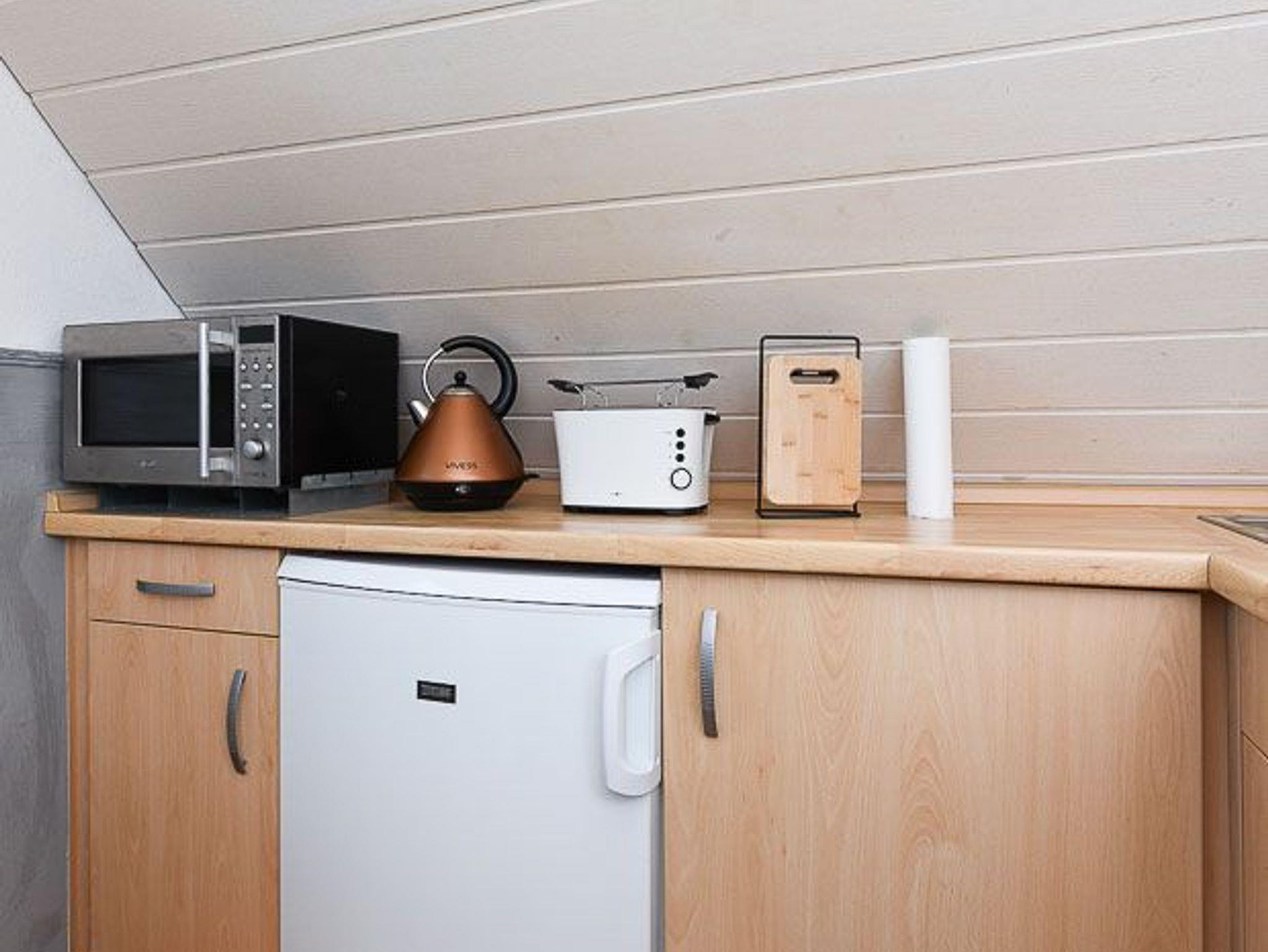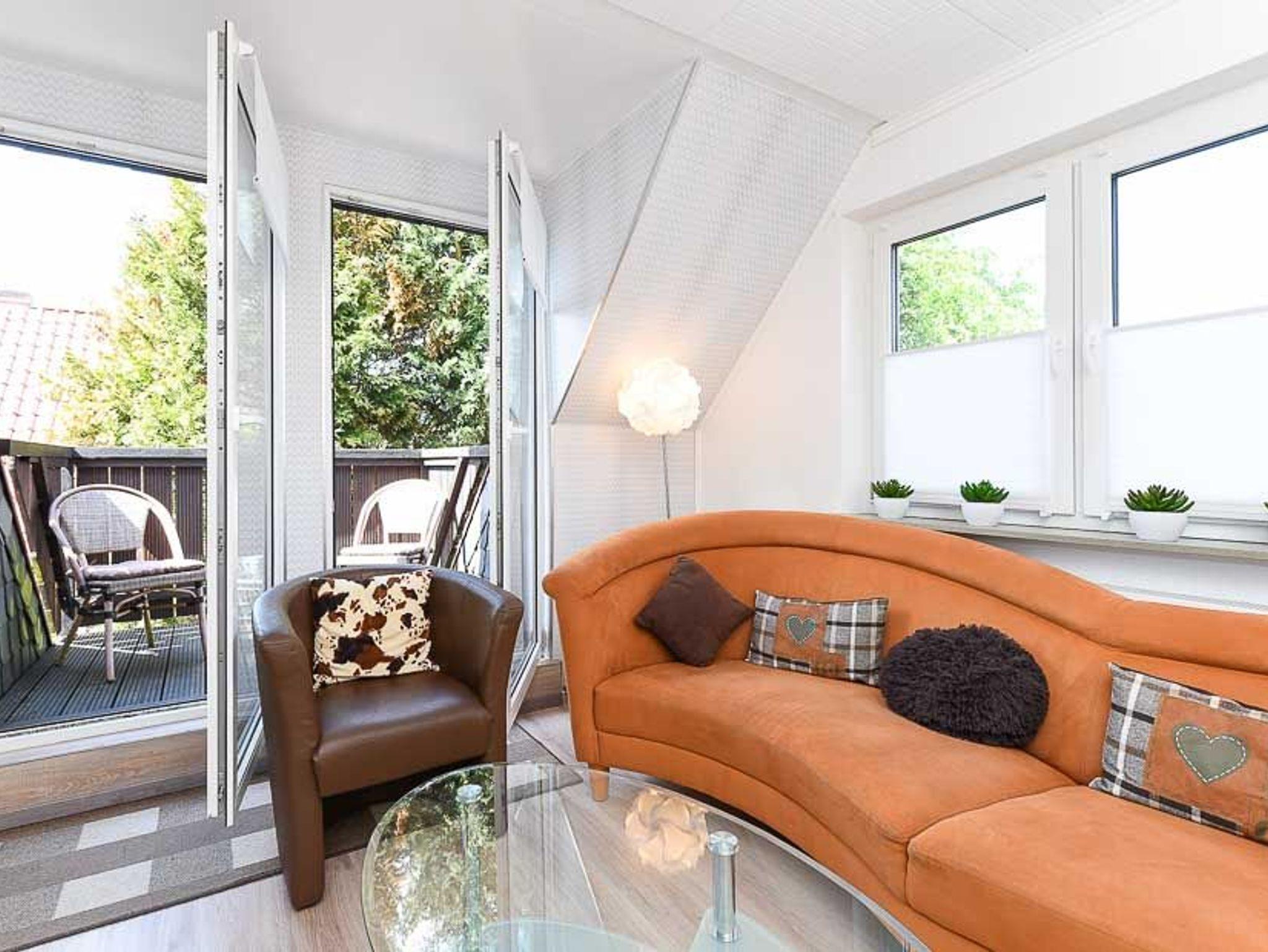 Größe ca. 45 Quadratmeter, Wohnzimmer mit integrierter Küche, Schlafzimmer, Badezimmer mit Dusche, Waschtisch und WC, Obergeschoss, Balkon, optimal für 1 bis 2 Personen und zusätzlich ein Kleinkind.