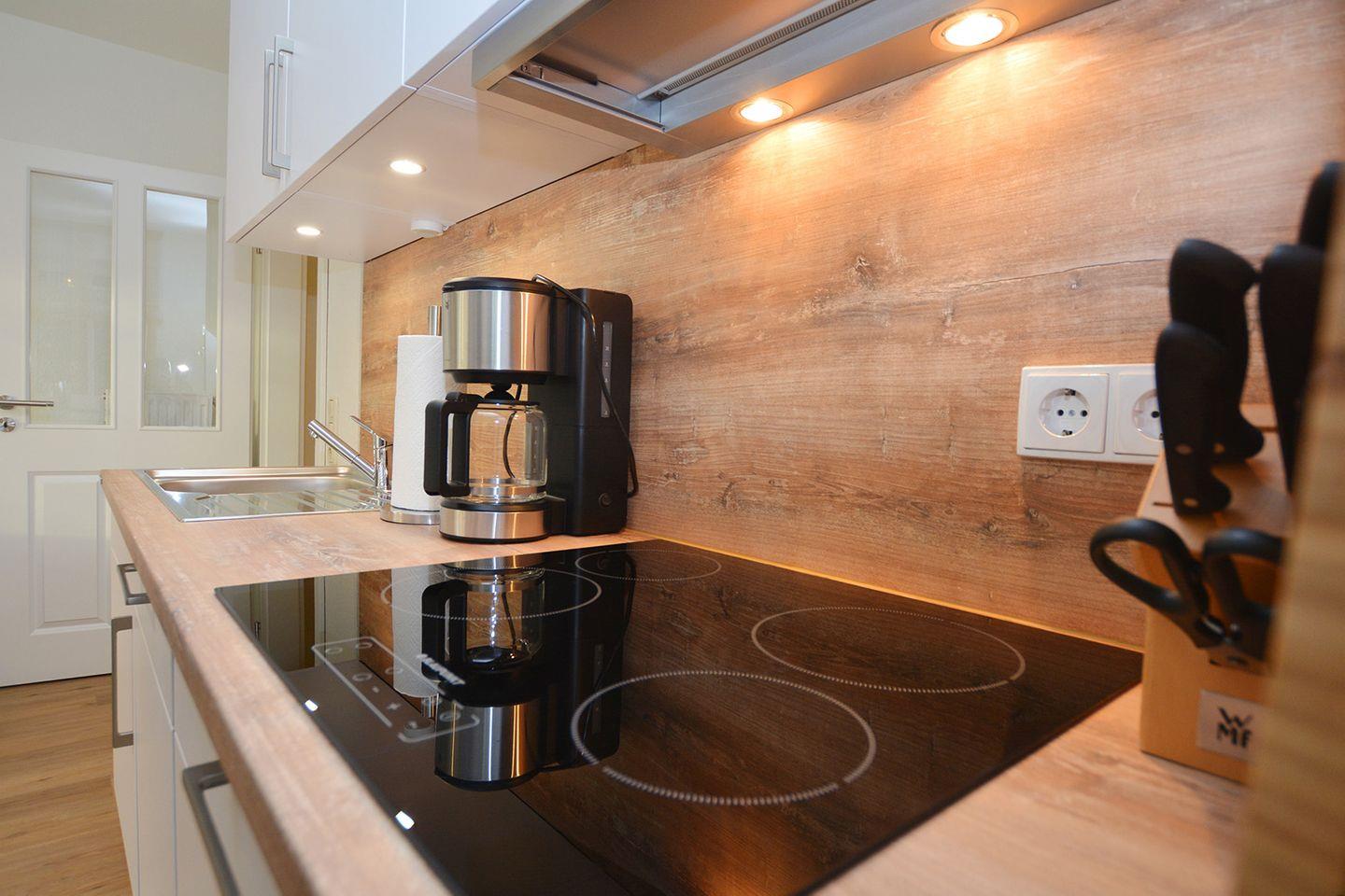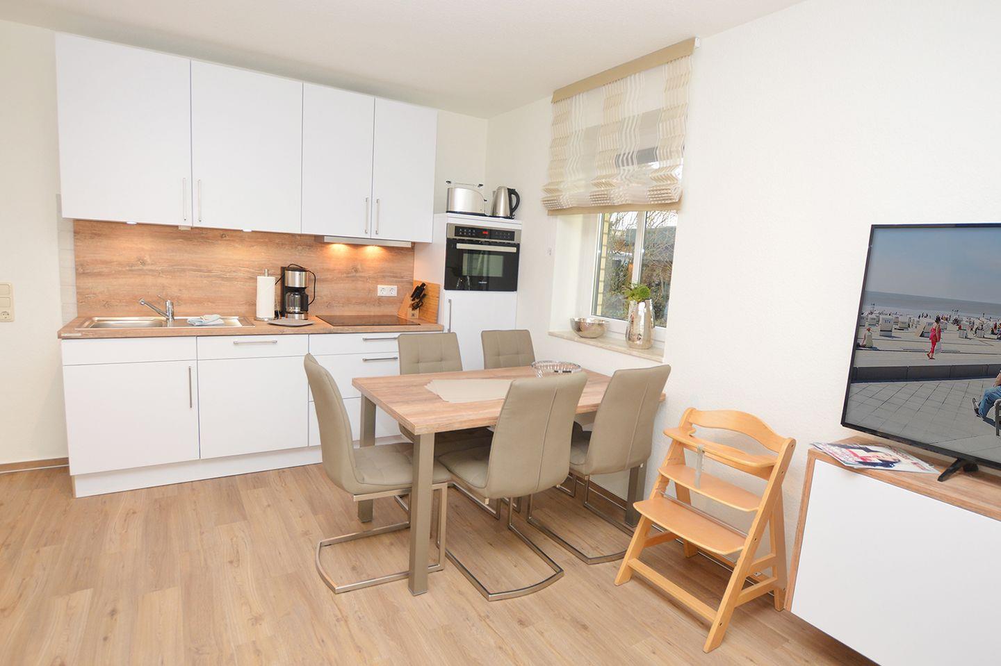 Die moderne Küche ist mit hochwertigen Geräten ausgestattet, darunter ein Ceran-Herd, eine Spülmaschine, ein Kühlschrank mit Gefrierfach, sowie eine Mikrowelle, Toaster und Kaffeemaschine. Hier bereiten Sie mühelos köstliche Speisen und Snacks zu. Nach dem Essen können Sie die Terrasse betreten, die mit Gartenmöbeln und einem Sonnenschirm ausgestattet ist – der ideale Ort für entspannte Stunden im Freien, um die frische Luft und den Blick ins Grüne zu genießen.