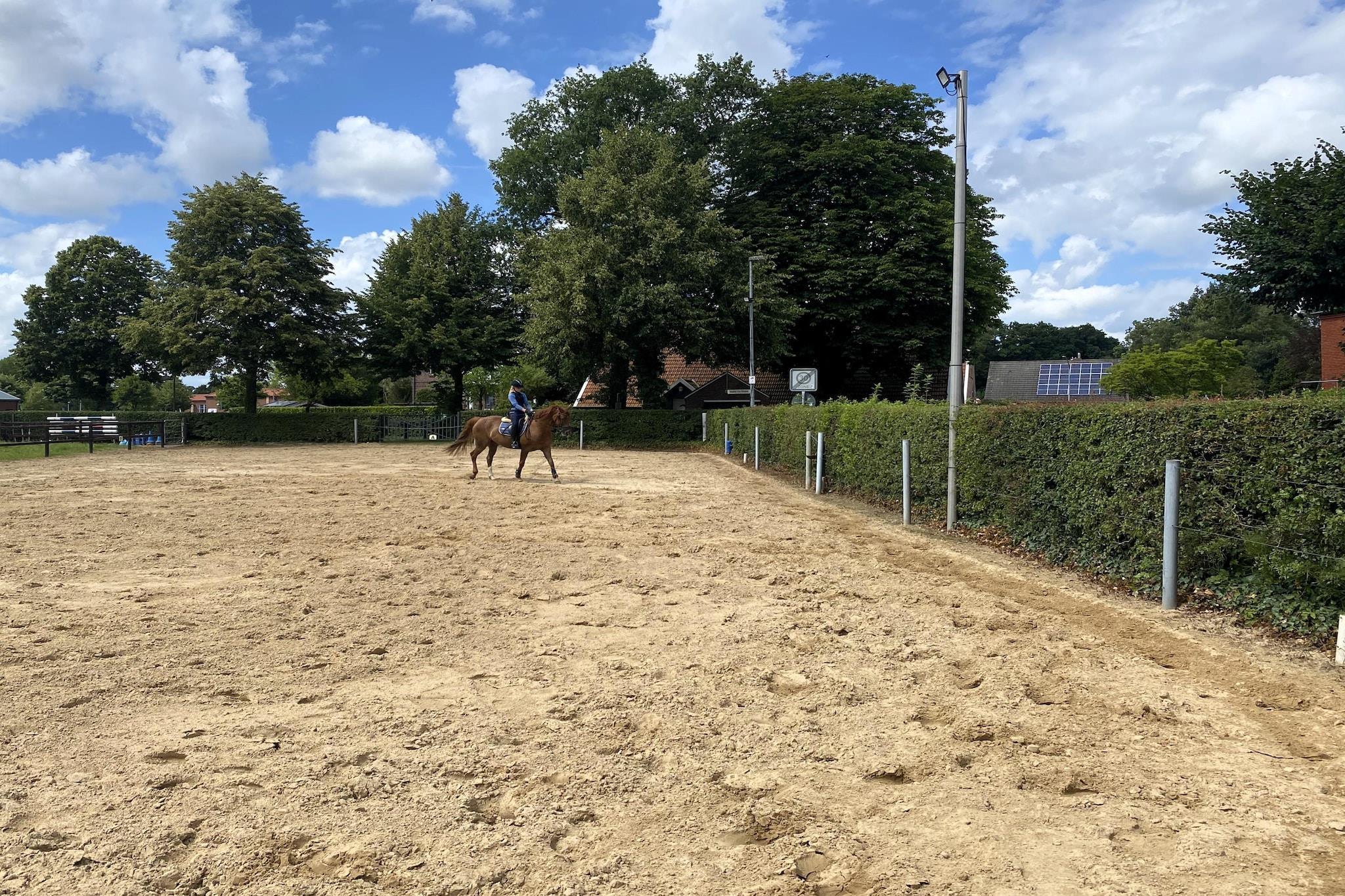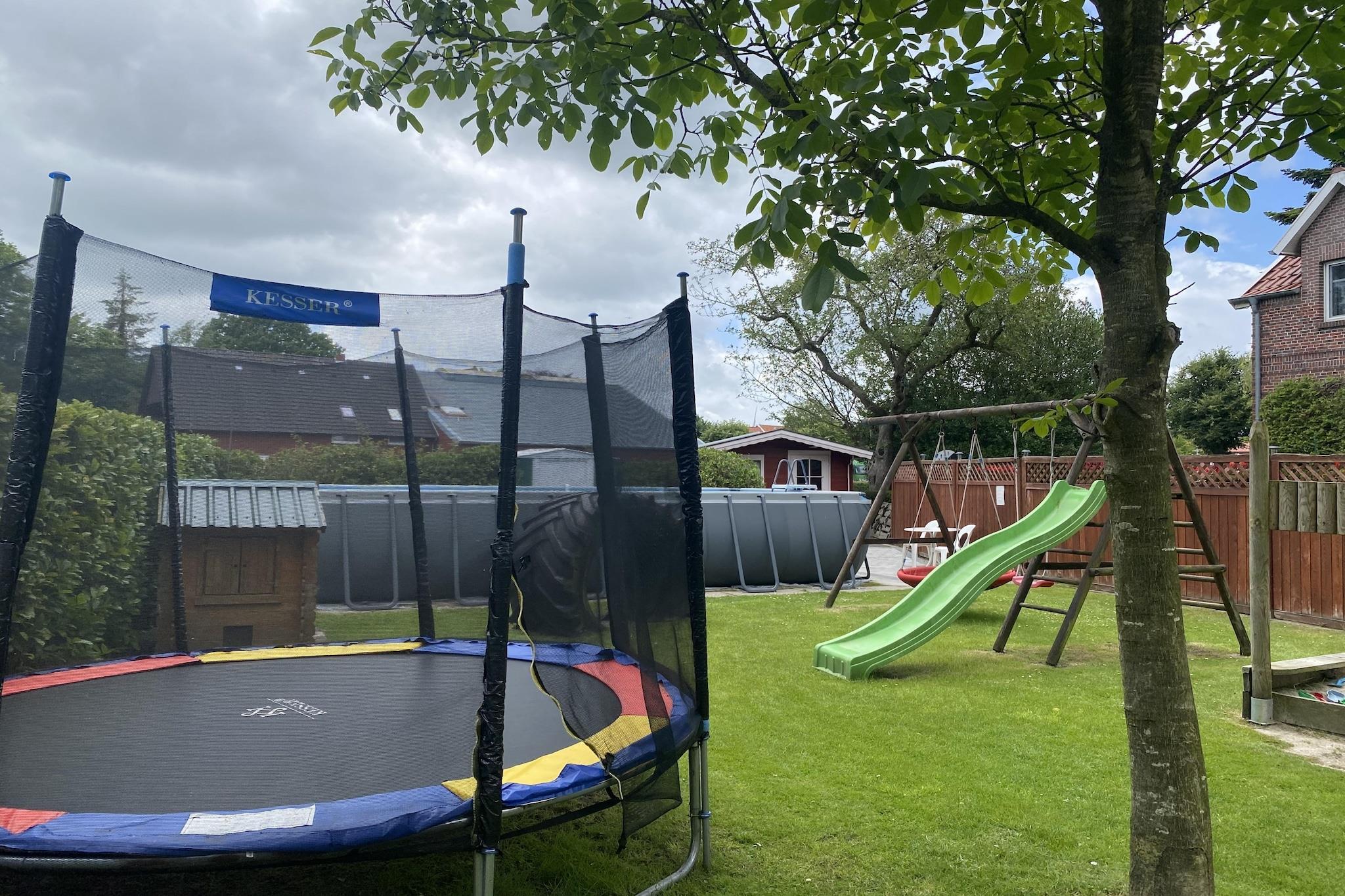 Parterre: (offene Küche(Wasserkocher, Toaster, Kochherd, Kaffeemaschine, Backofen, Mikrowelle, Spülmaschine, Kühlschrank(+ Gefrierfach)), Wohn/Esszimmer(TV(Satellit), Radio), Schlafzimmer(Doppelbett), Schlafzimmer(Doppelschlafcouch, Etagenbett), Badezimmer(Dusche, Waschbecken, Toilette, Waschmaschine, Heizung(Fußbodenheizung))) Abstellraum(Gemeinschaftliche Nutzung mit anderen Gästen), Reiten, Spielplatz, Liegewiese, Babybett, Heizung, Terrasse, Gartenmöbel, Grill, Parkplatz, Trampolin, Pool(Gemeinschaftliche Nutzung mit anderen Gästen, beheizbar, 8 x 4 m.), Sandkasten, Tischfußball, Hochstuhl, Gesellschaftsspiele, Schaukel, Handtücher inklusive, Bettwäsche inklusive