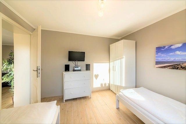 Ein Schlafzimmer ist mit einem Doppelbett eingerichtet und des Weiteren gibt es noch eins mit 2 Einzelbetten. Selbstverständlich haben alle einen Flat TV. Die Küche hat alle Extras (Kühlschrank mit Null Grad Zone, Ceranfeld mit Induktion, Geschirrspüler, Backofen mit Grill..) und lässt keine Wünsche offen. Bügeleisen, Bügelbrett, und Staubsauger befinden sich im Objekt damit es unseren Gästen wirklich an nichts fehlt