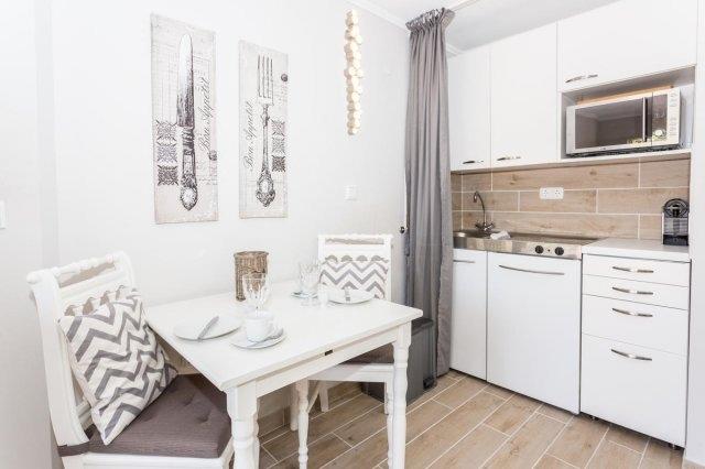 Ausgestattet ist die Einzimmerwohnung mit einem Tagesbett (80×200) ausziehbar auf 160×200 cm, großem Flat TV und integrierter Kochzeile.