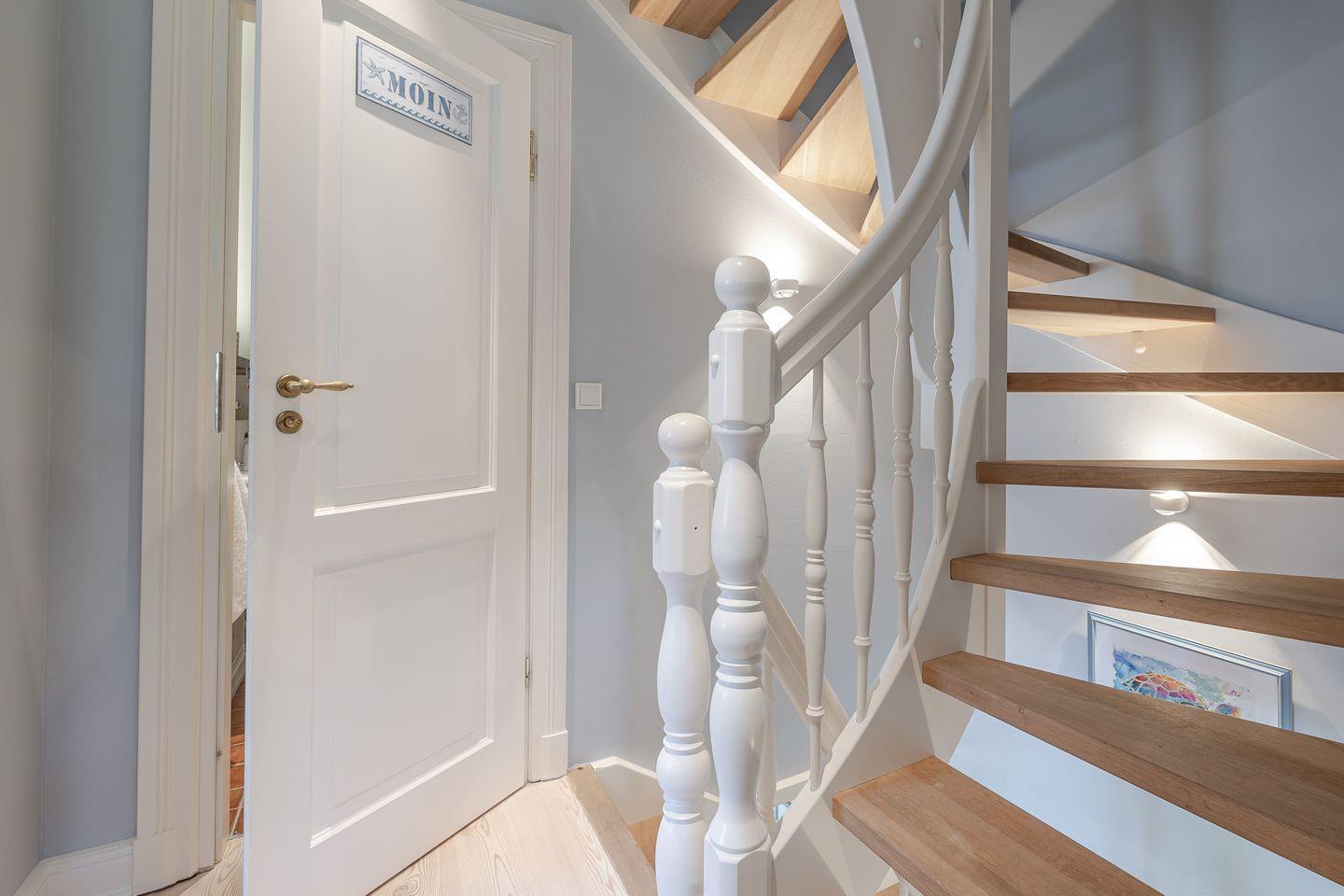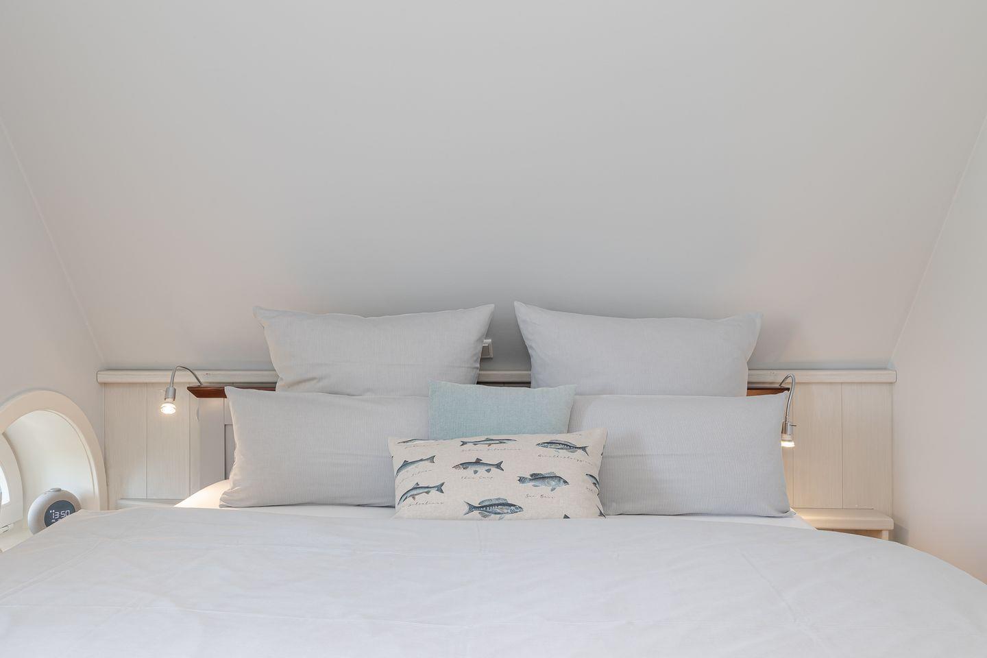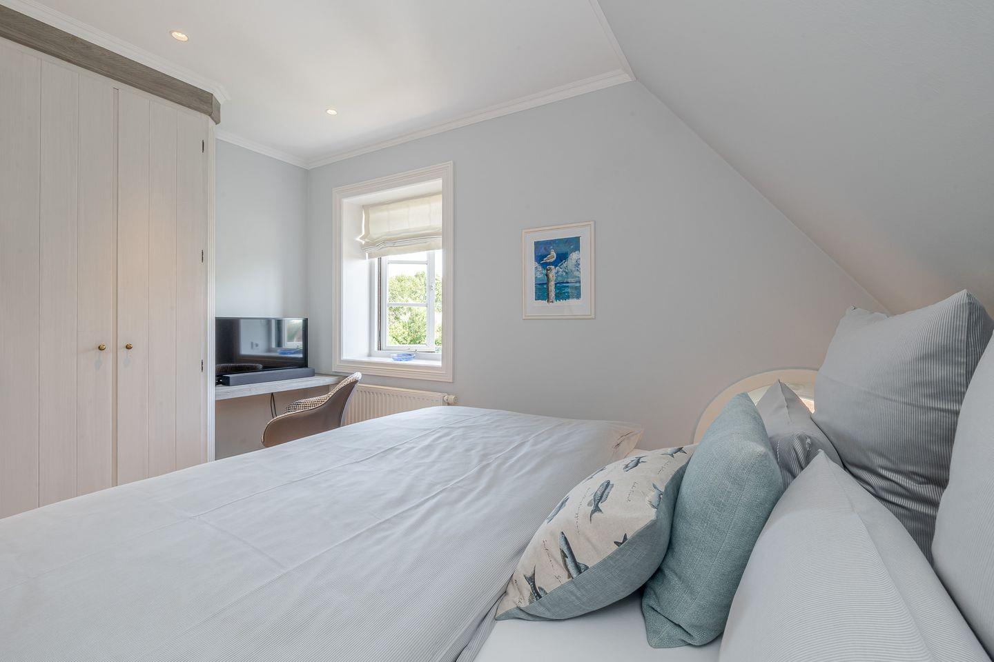 Im Obergeschoss erwarten Sie zwei helle Schlafzimmer, beide mit Doppelbetten, maßgefertigten Tischlereinbauten und jeweils einem kleinen Schreibtisch – ideal, falls während des Urlaubs doch einmal gearbeitet werden muss. Hier finden sich Rückzugsorte, die Ruhe und Erholung schenken. Ein modernes Duschbad steht den Schlafzimmern zur Verfügung, während im Erdgeschoss ein zusätzliches Gäste-WC den Komfort abrundet. Besonders praktisch ist auch der eigene Hauswirtschaftsraum mit Waschmaschine und Trockner, der den Aufenthalt angenehm unkompliziert macht.
