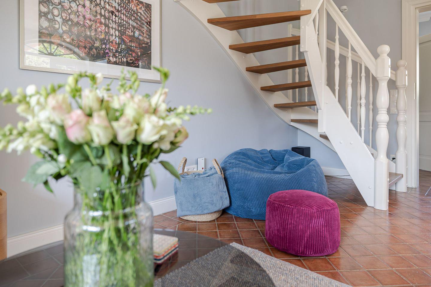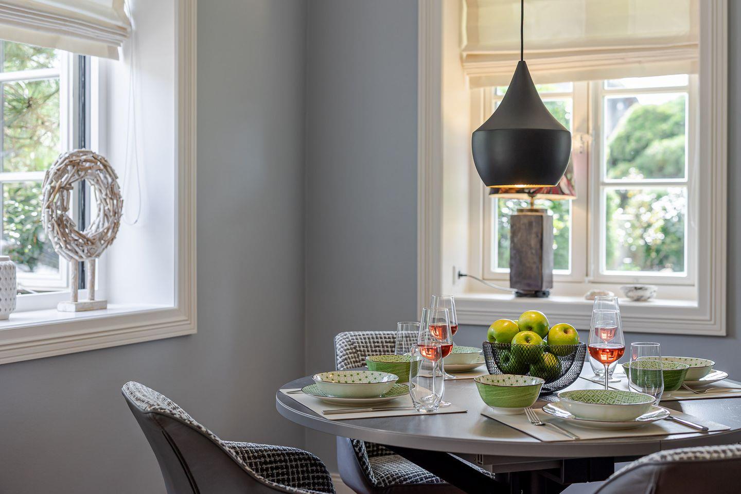 Das Erdgeschoss empfängt seine Gäste mit einem lichtdurchfluteten Wohnbereich, der sofort eine warme und behagliche Atmosphäre schafft. Herzstück ist die offene, voll ausgestattete Küche mit Spülmaschine, Backofen und allen modernen Geräten, die das Kochen zum Vergnügen machen. Hier wird nicht nur gekocht, sondern gemeinsam genossen – ob ausgedehntes Frühstück am großen Esstisch, ein feines Abendessen oder gesellige Stunden mit Familie und Freunden. Der angrenzende Wohnbereich mit Sofa und stilvollen Details lädt zu entspannten Abenden ein, an denen man bei einem Glas Wein oder einem guten Film einfach die Seele baumeln lässt.