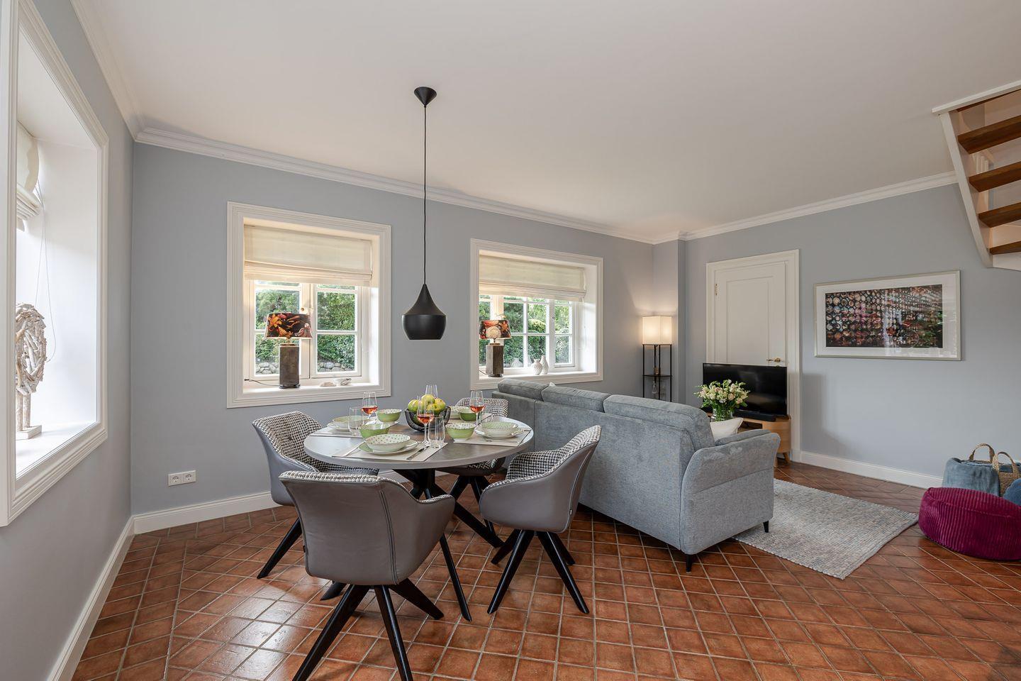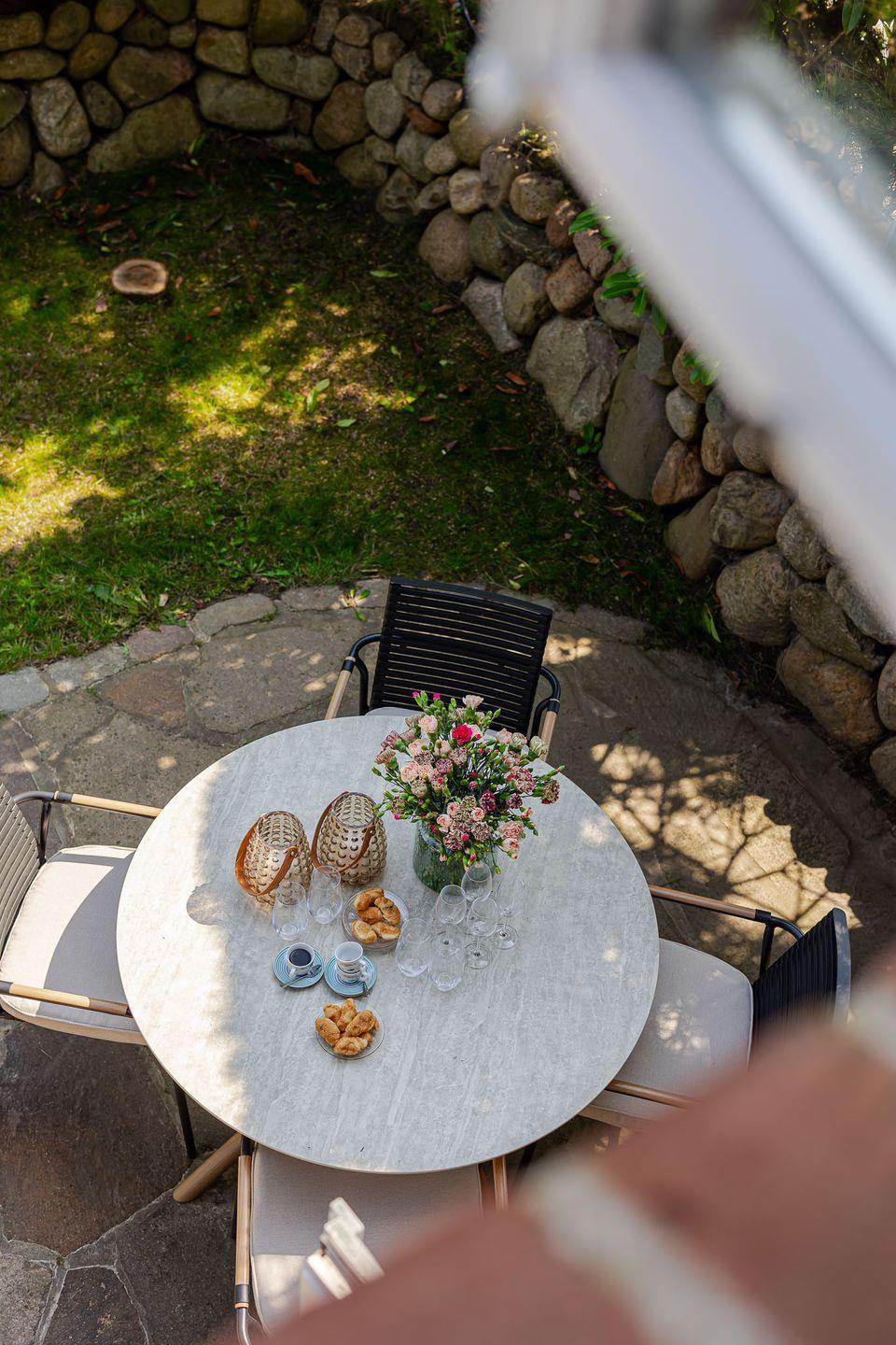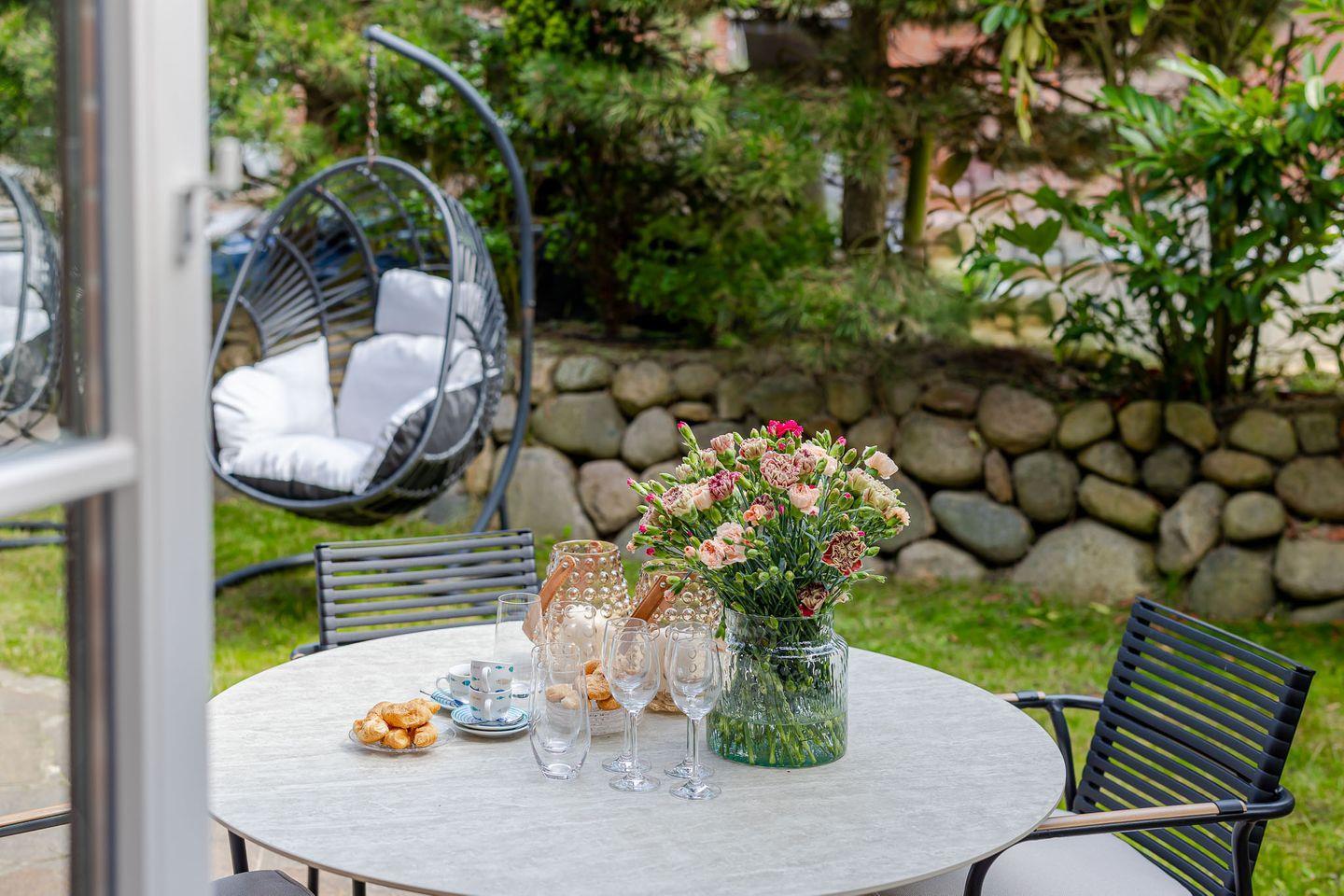 Von hier führt der Weg direkt auf die geschützte Terrasse, die von einem Friesenwall mit Pforte eingefasst ist und so echtes Sylter Flair schenkt. Am runden Esstisch im Freien lässt sich am Morgen wunderbar die Sonne beim Frühstück genießen, während die beiden Hängekojen-Stühle zum Entspannen, Lesen oder Tagträumen einladen. Auch vierbeinige Gäste fühlen sich hier wohl: Der direkte Zugang ins Freie macht die Terrasse zu einem idealen Platz für Hundebesitzer, die die frische Nordseeluft ebenso schätzen wie ihre Tiere.