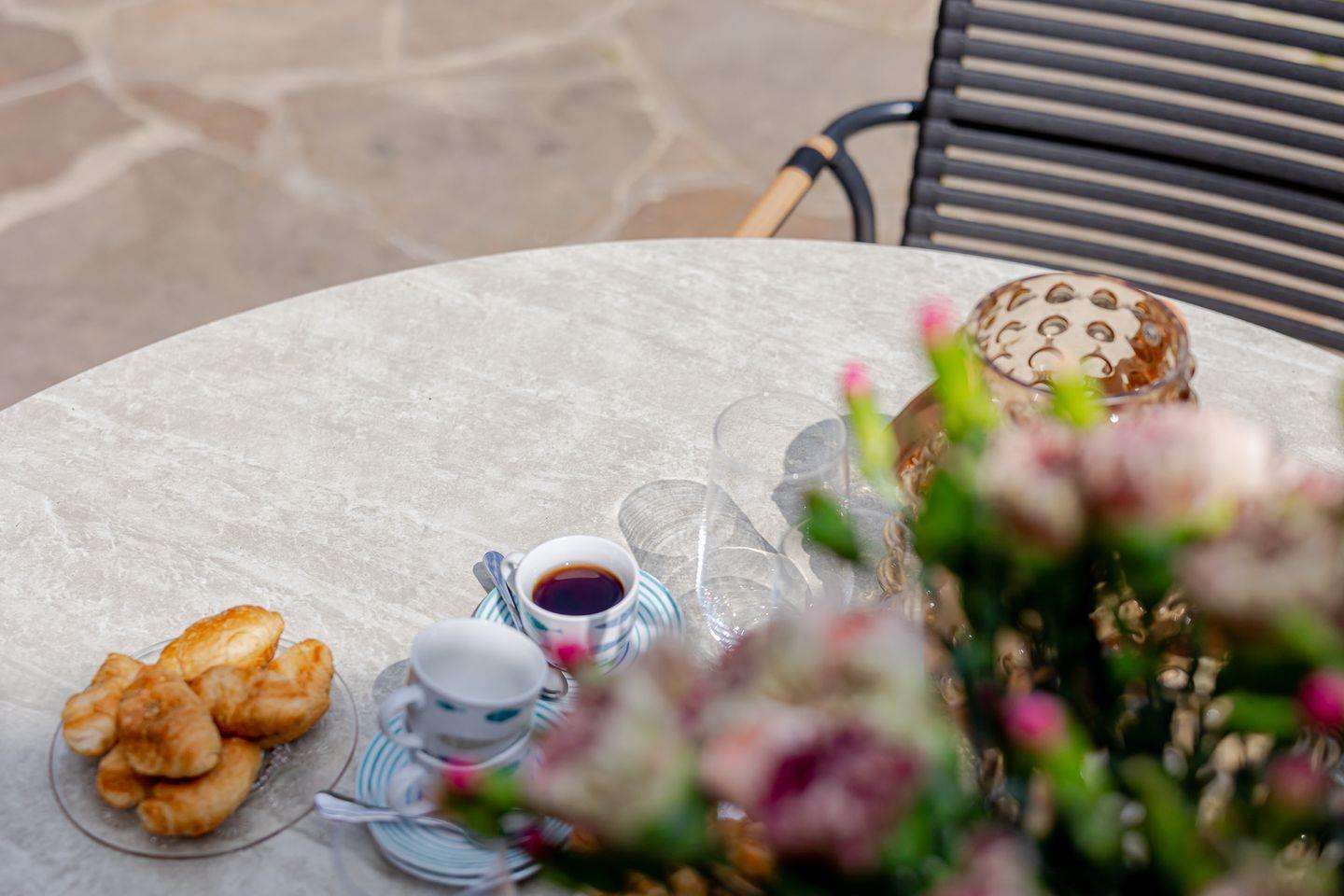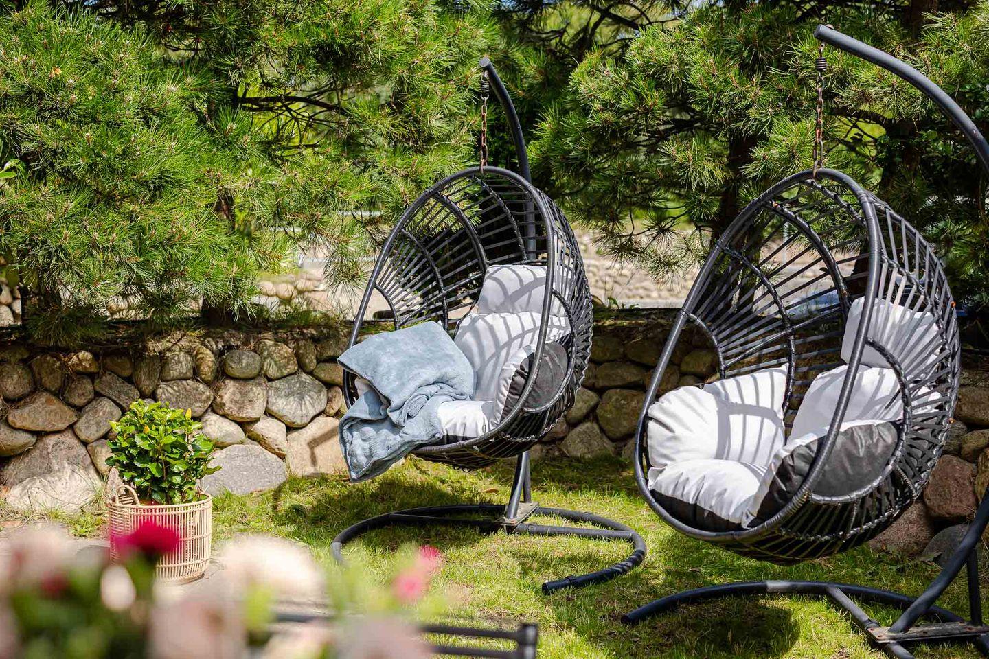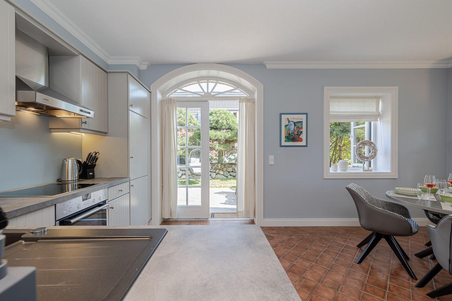 Von hier führt der Weg direkt auf die geschützte Terrasse, die von einem Friesenwall mit Pforte eingefasst ist und so echtes Sylter Flair schenkt. Am runden Esstisch im Freien lässt sich am Morgen wunderbar die Sonne beim Frühstück genießen, während die beiden Hängekojen-Stühle zum Entspannen, Lesen oder Tagträumen einladen. Auch vierbeinige Gäste fühlen sich hier wohl: Der direkte Zugang ins Freie macht die Terrasse zu einem idealen Platz für Hundebesitzer, die die frische Nordseeluft ebenso schätzen wie ihre Tiere.