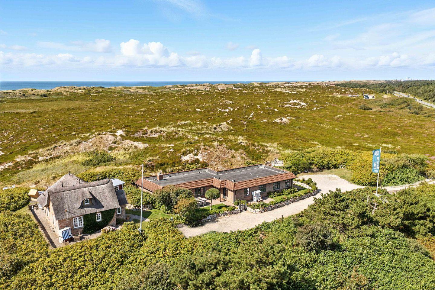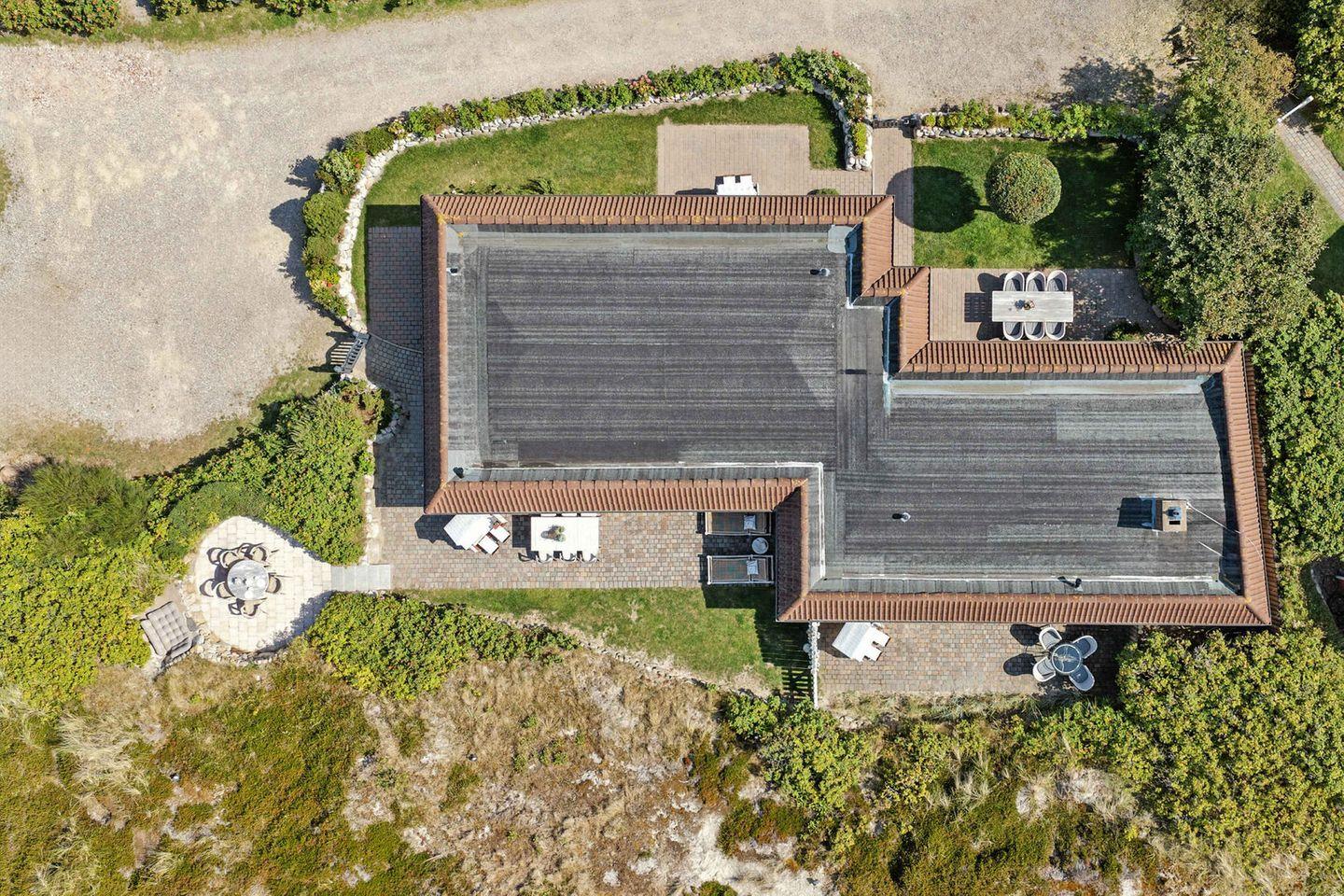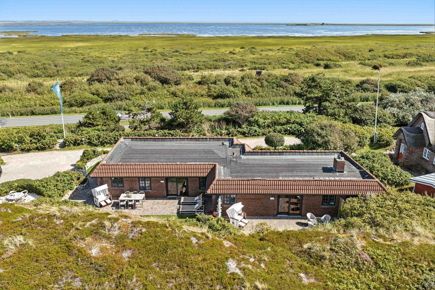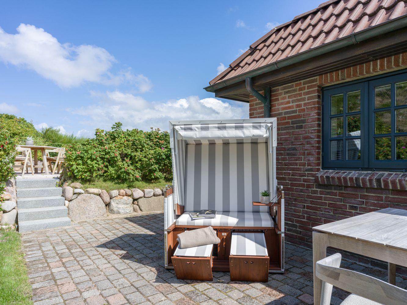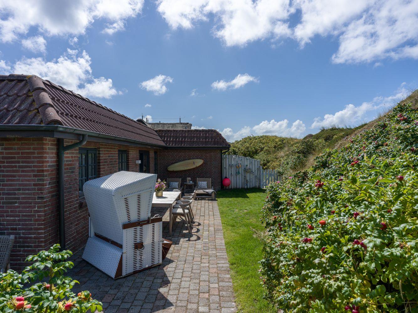 Die großzügige Terrasse mit Rasenfläche lädt zu entspannten Stunden im Freien ein. Ein privater Strandkorb steht für Sie bereit, damit Sie die frische Nordseebrise und die friedliche Umgebung voll auskosten können. Besonders einzigartig ist der erhöhte Essplatz, der über ein paar Treppenstufen zu erreichen ist und mitten in den Wildrosen und Dünen liegt – ein perfekter Ort, um das Frühstück mit Blick auf die raue Schönheit der Natur zu genießen oder den Abend in romantischer Atmosphäre ausklingen zu lassen.